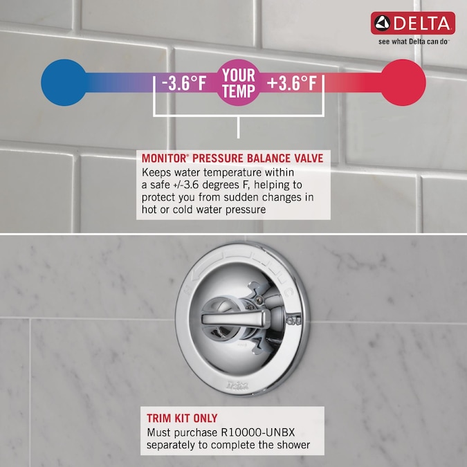 Delta® H2Okinetic® Showers look different because they are different. Using advanced technology, H2Okinetic showers sculpt water into a unique wave pattern, giving you 3X the coverage of a standard shower head. The end result is a shower that provides more coverage, more warmth and more intensity for a truly drenching shower experience. Delta® pressure-balance valves use Monitor® Technology to protect you and your family from sudden temperature changes. Chrome has rapidly become one of the most popular finishes across décor styles in the bath thanks to its stunning gloss and innate versatility. Paired with crisp lines and bright whites, it creates a bold, modern contrast, but it works equally well with vintage styles and traditional spaces to convey a hint of nostalgia. Delta WaterSense labeled faucets, showers and toilets use at least 20% less water than the industry standard—saving you money without compromising performance.