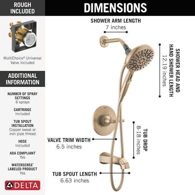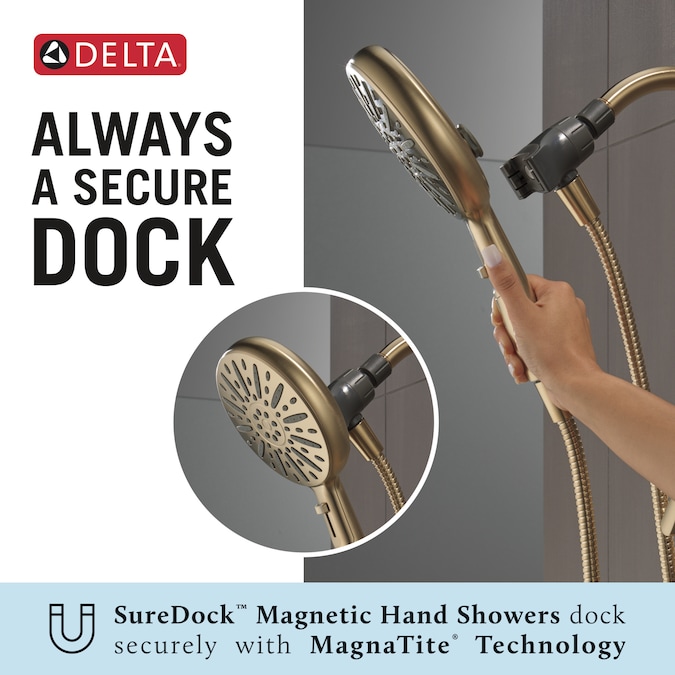 Bring elongated lines and subtle details to your bath with the Arcadia™ Bath Collection. SureDock™ Magnetic Hand Showers bring reliable docking within reach. An integrated magnet on the back of the hand shower snaps your hand shower into place and holds it there, so it stays docked when not in use and doesn’t droop over time. The pause setting gives you ample space for shaving, lathering and other shower tasks, then easily restarts the water with the temperature where you left off. While other products may gather unsightly mineral buildup over time, soft rubber Touch-Clean® spray holes allow any mineral residue to simply be wiped away for an instantly refreshed look — with no need for soaking or the aid of chemical cleaners. WaterSense® labeled faucets, showers and toilets use at least 20% less water than the industry standard — helping you save water without compromising performance. You can install with confidence, knowing Delta® products are backed by our Lifetime Limited Warranty.