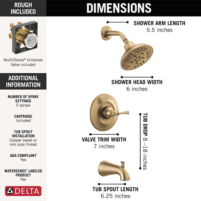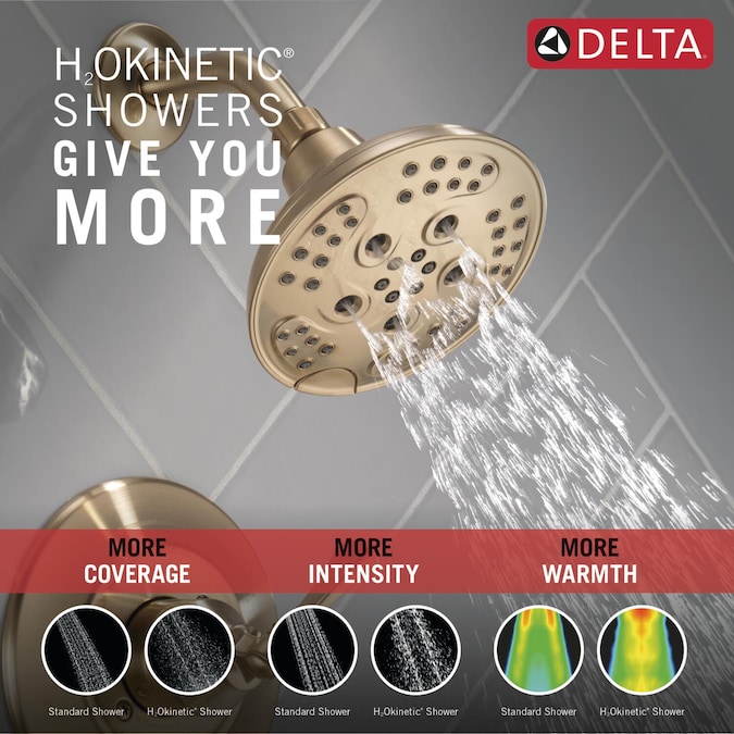 Delta® H2Okinetic® Showers look different because they are different. Using advanced technology, H2Okinetic® showers sculpt water into a unique wave pattern, giving you 3X the coverage of a standard shower head. The end result is a shower that provides more coverage, more warmth and more intensity for a truly drenching shower experience. Delta® showers with Monitor® pressure-balance valves are engineered to make sure you don’t experience a sudden and possibly unsafe change in water temperature as a result of running water elsewhere, such as using a dishwasher, flushing a toilet or running a washing machine. The pause setting gives you ample space for shaving, lathering and other shower tasks, then easily restarts the water with the temperature where you left off to help you conserve water and worry less about depleting your hot water supply. Delta® WaterSense® labeled faucets, showers and toilets use at least 20% less water than the industry standard — helping you save water without compromising performance. You can install with confidence, knowing Delta® products are backed by our Lifetime Limited Warranty.