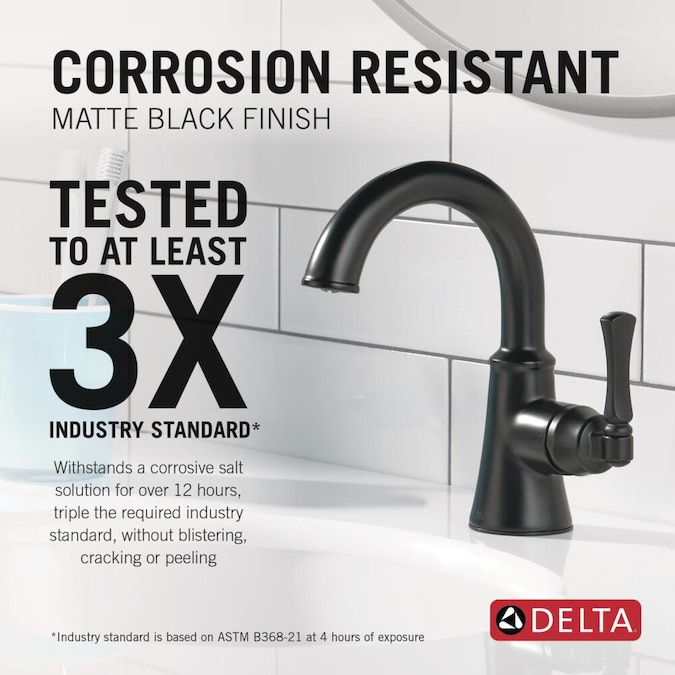 - CORROSION-RESISTANT FINISH: DeltaMatte Black faucet finishes are salt fog tested, meaning they withstand a corrosive, chemical solution for over 12 hours, triple the required industry standard, without blistering, cracking or peeling