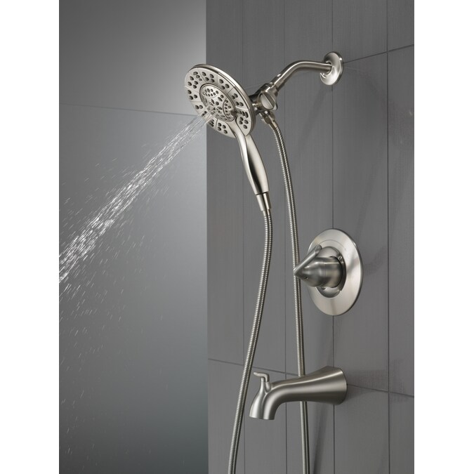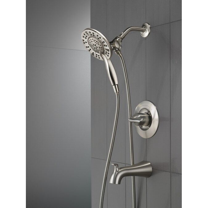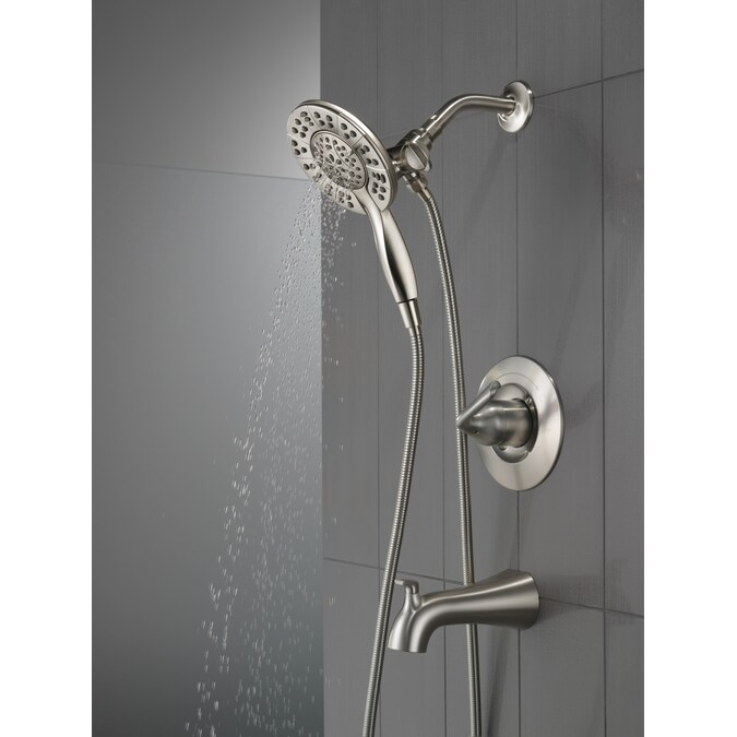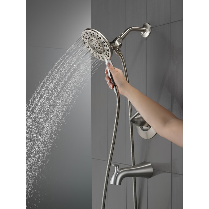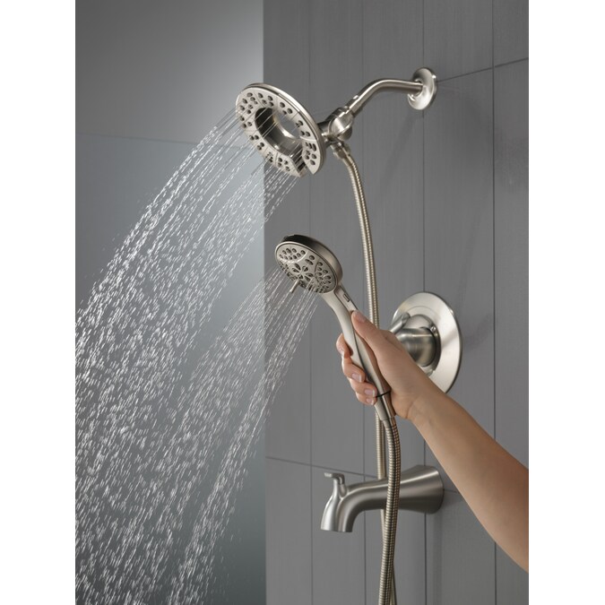 The fluid lines of the Arvo™ Bath Collection bring a delicate, serene look to the bath. The Delta® In2ition® Two-in-One Shower features a detachable hand shower which can be used separately from or simultaneously with the shower head. This integrated dual-functionality gives you maximum flexibility without sacrificing warmth, as you can choose to have water streaming from the shower head only, the hand shower only or both the shower head and hand shower at once. While other products may gather unsightly mineral build-up over time, Delta soft rubber Touch-Clean® spray holes allow any mineral residue to simply be wiped away for an instantly refreshed look – with no need for soaking or the aid of chemical cleaners. The pause setting gives you ample space for shaving, lathering and other shower tasks, then easily restarts the water with the temperature where you left off. This spray setting helps you conserve water, so you can worry less about depleting your supply of hot water – and you help the environment too. Delta WaterSense labeled faucets, showers and toilets use at least 20% less water than the industry standard—saving you money without compromising performance.