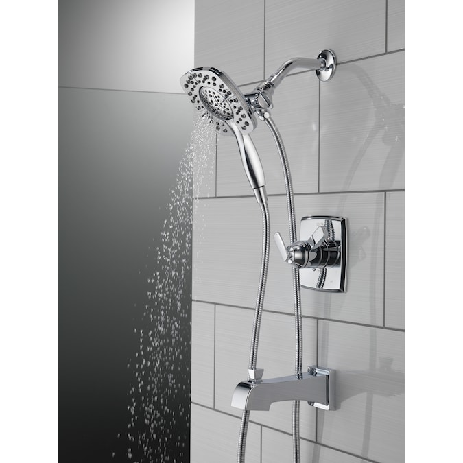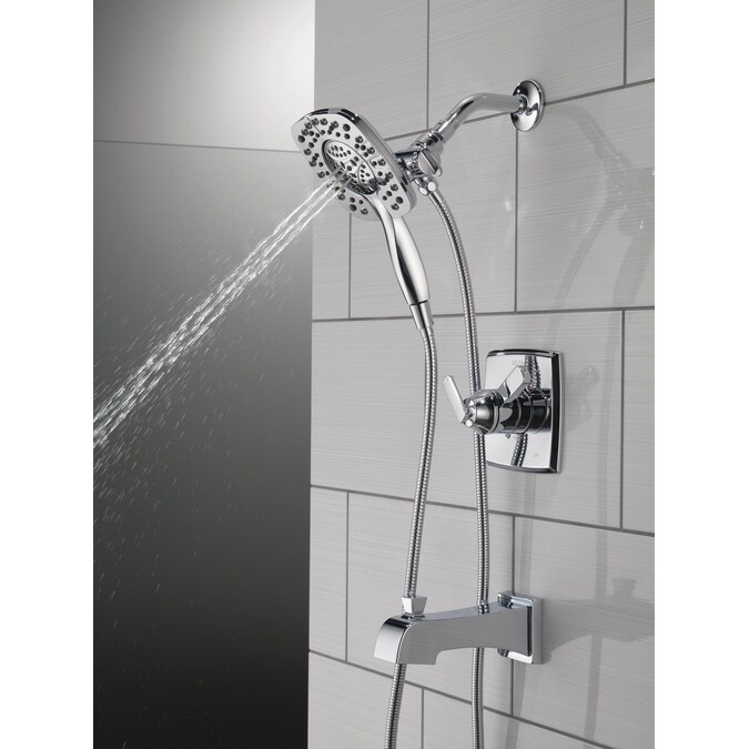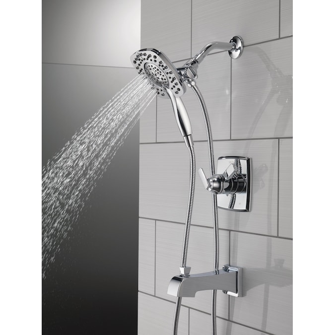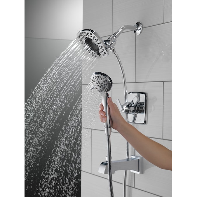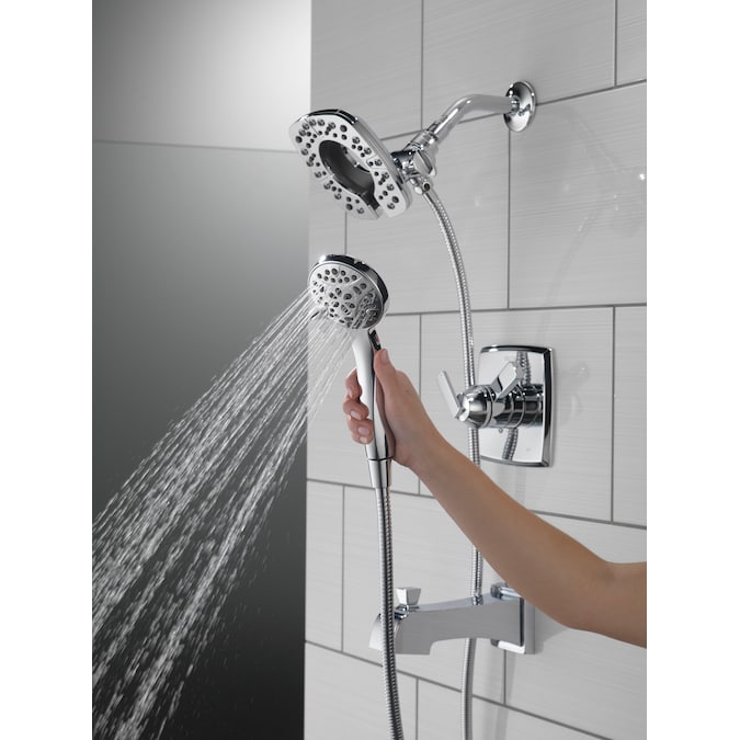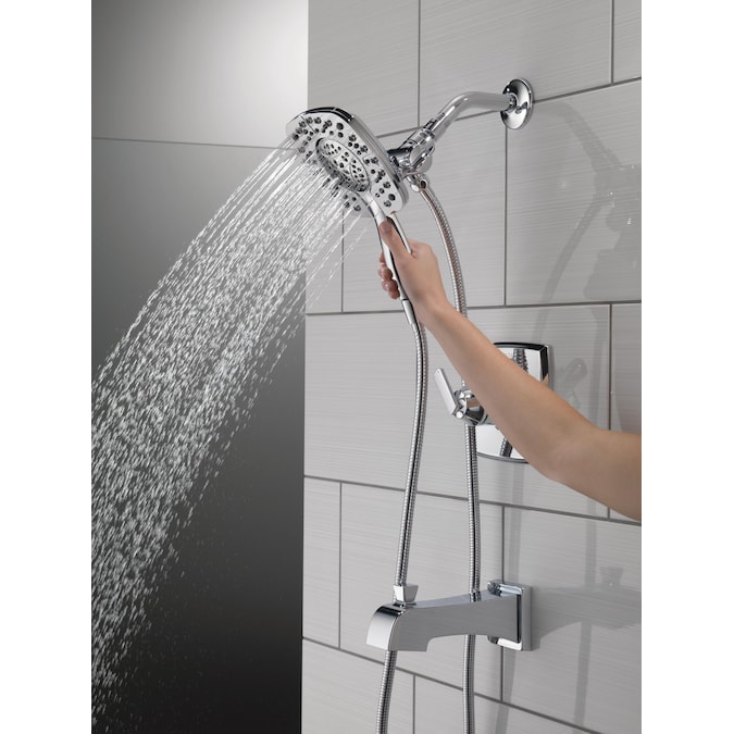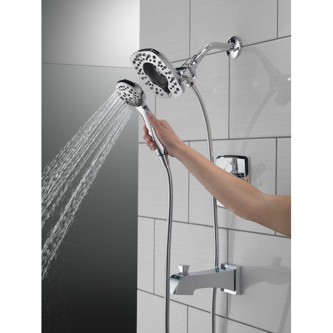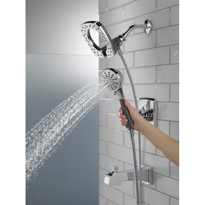 The Delta® In2ition® Two-in-One Shower features a detachable hand shower which can be used separately from or simultaneously with the shower head. This integrated dual-functionality gives you maximum flexibility without sacrificing warmth, as you can choose to have water streaming from the shower head only, the hand shower only or both the shower head and hand shower at once. With separate handles for volume and temperature control, this Delta tub/shower provides a more refined showering experience. Simply set the water at your preferred temperature and turn the shower on or off with the volume control handle – without interrupting your set temperature. While other products may gather unsightly mineral build-up over time, Delta soft rubber Touch-Clean® spray holes allow any mineral residue to simply be wiped away for an instantly refreshed look – with no need for soaking or the aid of chemical cleaners. The pause setting gives you ample space for shaving, lathering and other shower tasks, then easily restarts the water with the temperature where you left off. This spray setting helps you conserve water, so you can worry less about depleting your supply of hot water – and you help the environment too. Delta® pressure-balance valves use Monitor® Technology to protect you and your family from sudden temperature changes. This Brilliance Stainless finish has subtle, warm undertones which make it an excellent match with nickel or stainless steel and is extremely versatile, complementing nearly any look, be it traditional, transitional or contemporary. Delta WaterSense labeled faucets, showers and toilets use at least 20% less water than the industry standard—saving you money without compromising performance.