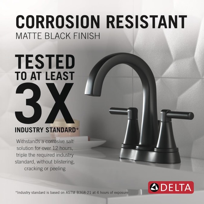 - CORROSION-RESISTANT FINISH: DeltaMatte Black faucet finishes are salt fog tested, meaning they withstand a corrosive, chemical solution for over 12 hours, triple the required industry standard, without blistering, cracking or peeling