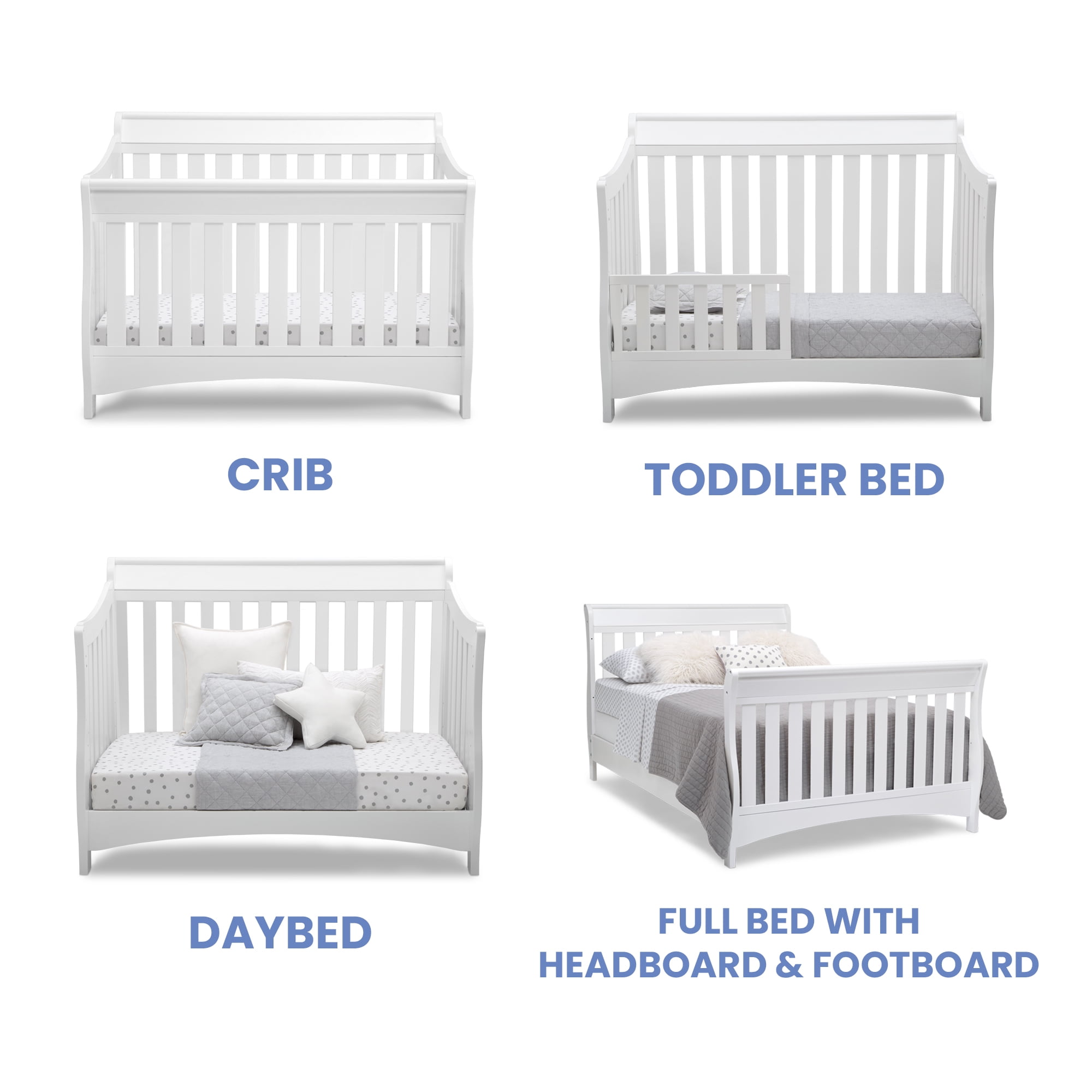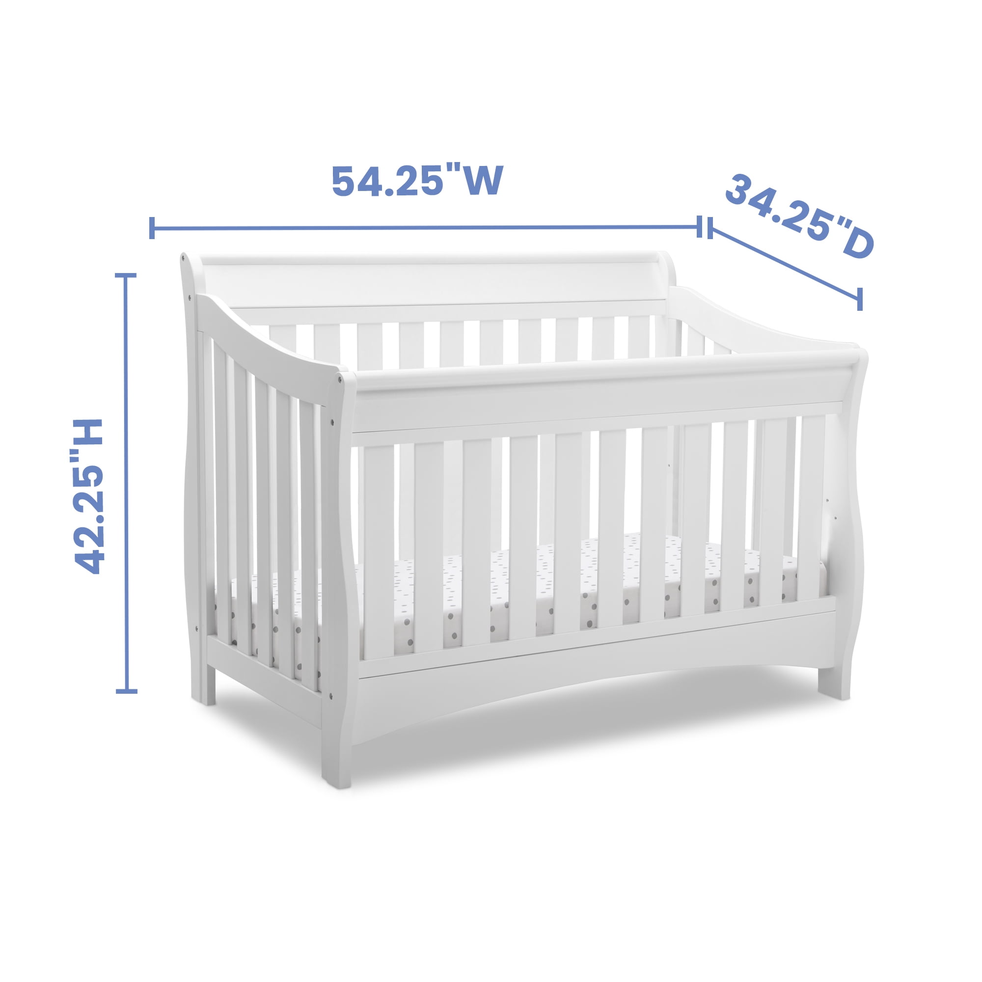 Add stylish and versatile functionality to your child’s room with the Delta Children Bentley “S” Series 4-in-1 Convertible Crib Crafted from solid hardwood Beautiful, understated sleigh silhouette converts from a crib to a toddler bed, daybed, and a full size bed to adapt to your child’s growth 3-position mattress height adjustment Fits a standard crib size mattress (sold separately) Maximum weight capacity: 50 lb. Recommended for ages 0 – 18 months Toddler guardrail and conversion rails sold separately Measures 34.25″ L x 54.25″ W x 42.25″ H (assembled) Easy to assemble JPMA certified to meet or exceed all safety standards set by the CPSC and ASTM 1-year manufacturer’s warranty Imported
