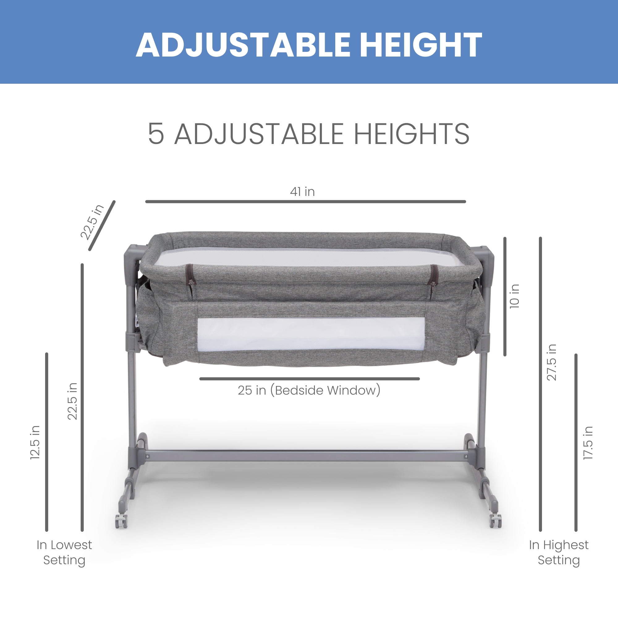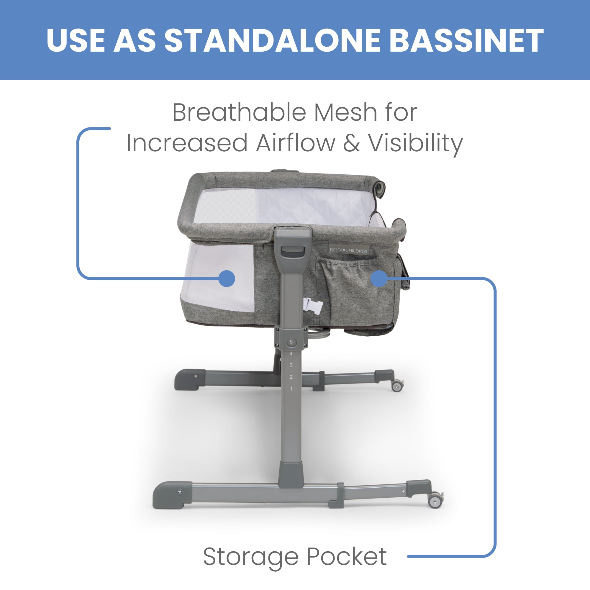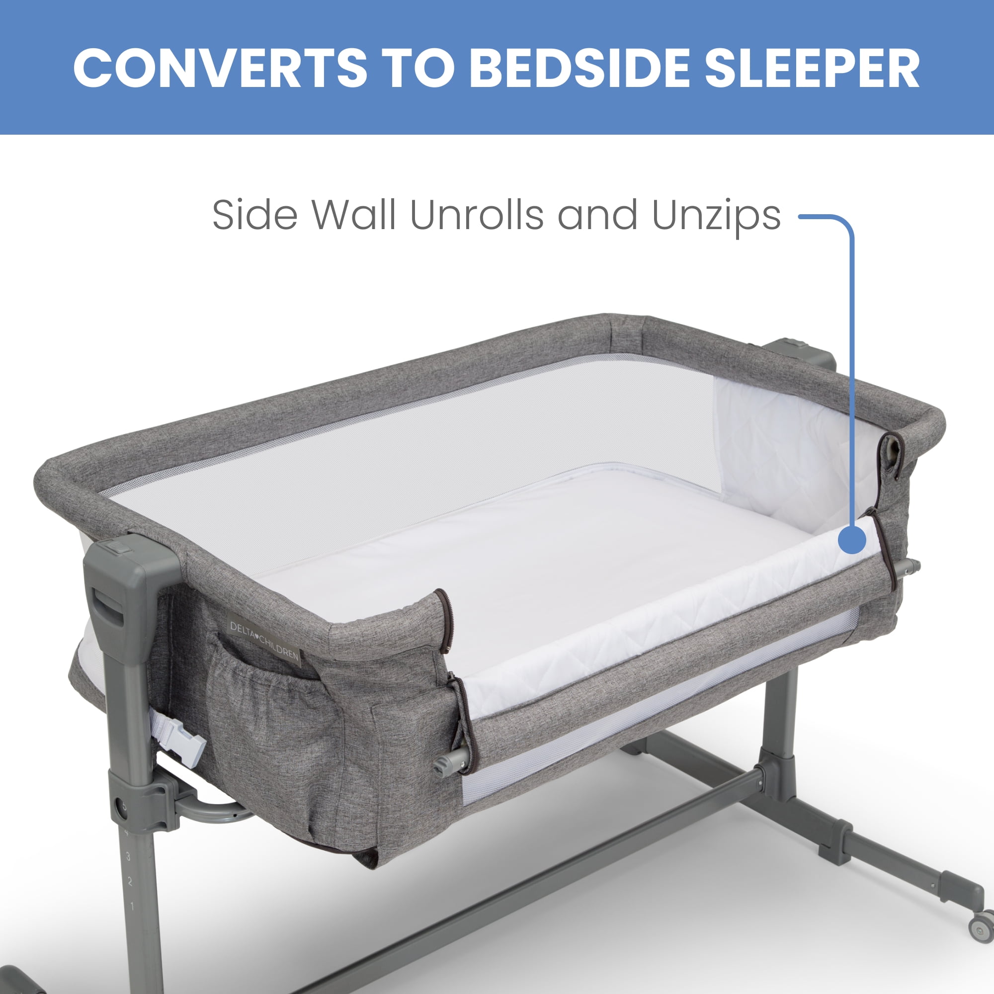 2-IN-1 DESIGN: Use as standalone bassinet or as bedside sleeper | Easily convert to bedside sleeper by unzipping and unrolling side wall | Securely attach the bassinet to your adult size bed using the included safety straps ADJUSTABLE HEIGHT: 5 adjustable height positions allow the bassinet to accommodate beds 19-inches to 24-inches high | Ideal for newborns and breastfeeding moms, this will help new parents get back to sleep quickly after feeding or comforting baby BREATHABLE MESH SIDES: Breathable and see-through mesh walls all around allow for airflow and clear view of baby | Bassinet includes waterproof mattress pad, fitted sheet and beside strap; fitted sheet and bassinet cover are machine washable SPACIOUS SLEEP AREA: Larger sleep area than the average bedside bassinet provides baby with plenty of space | Size: 27”L x 40”W x 28”H; Bedside opening: 25”W| Product weight: 19.2 lbs. | Built-in wheels make it easy to move from room to room TONS OF STORAGE: A large storage pocket keeps baby’s essentials like diapers, baby wipes and more within reach | Bassinet is JPMA certified to meet or exceed all safety standards