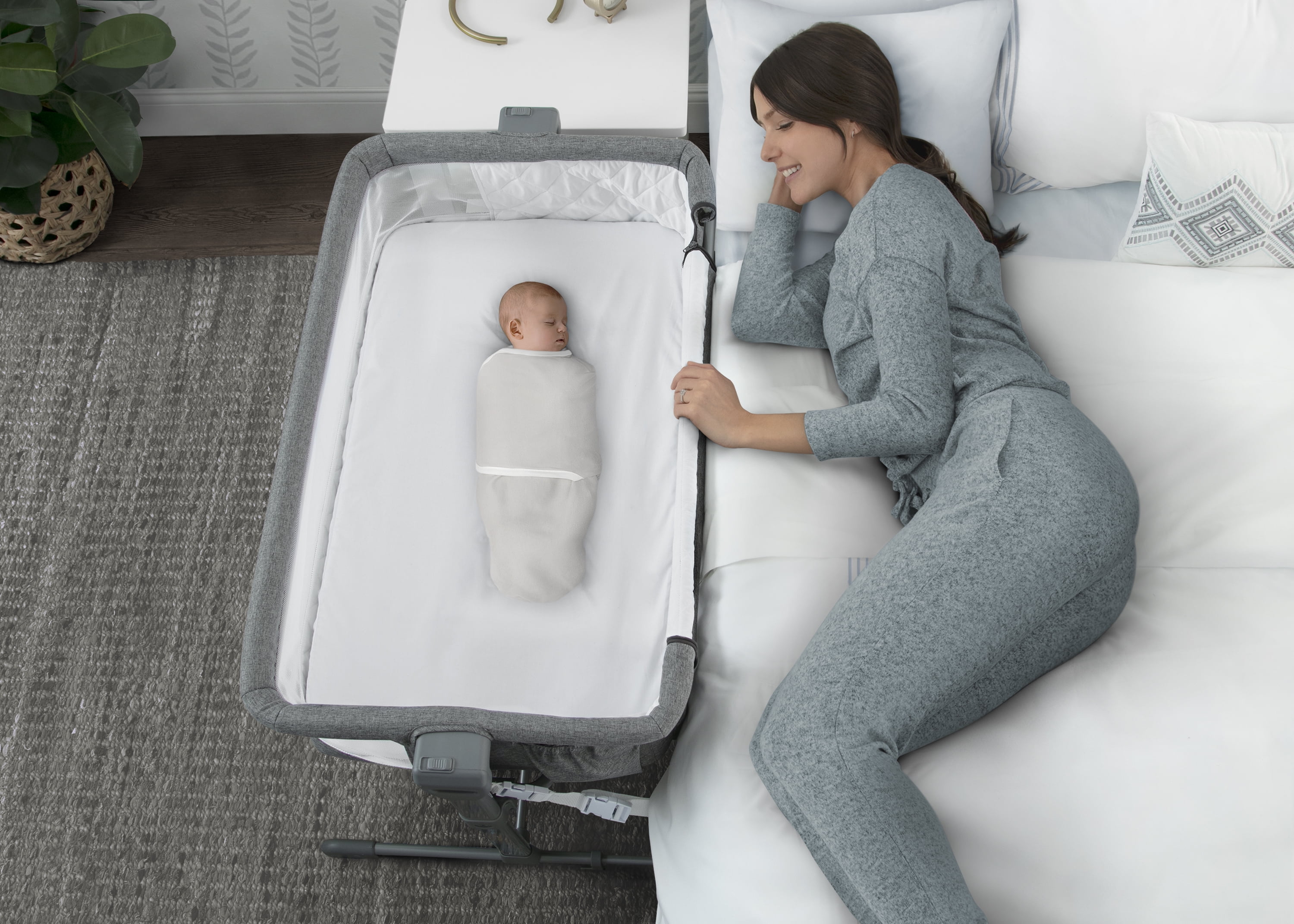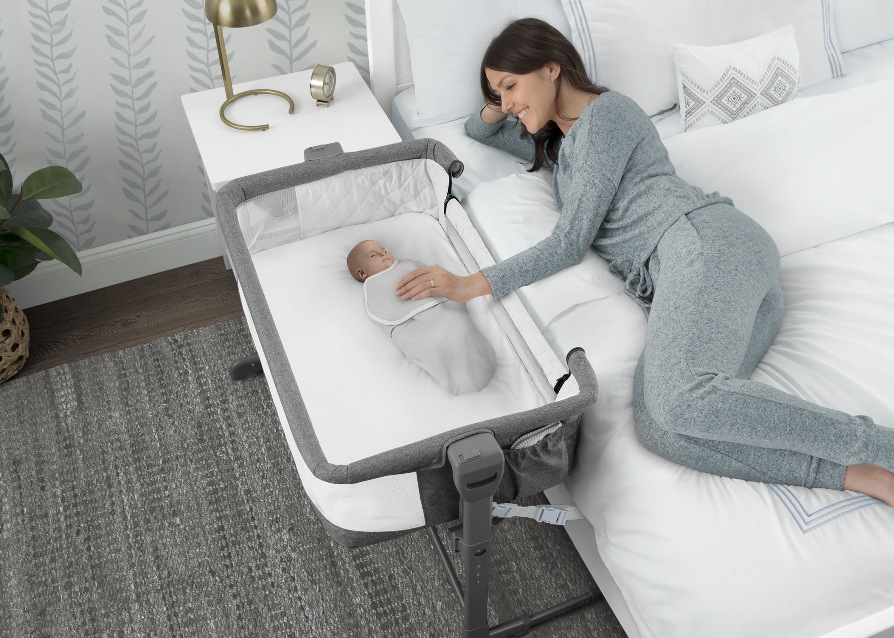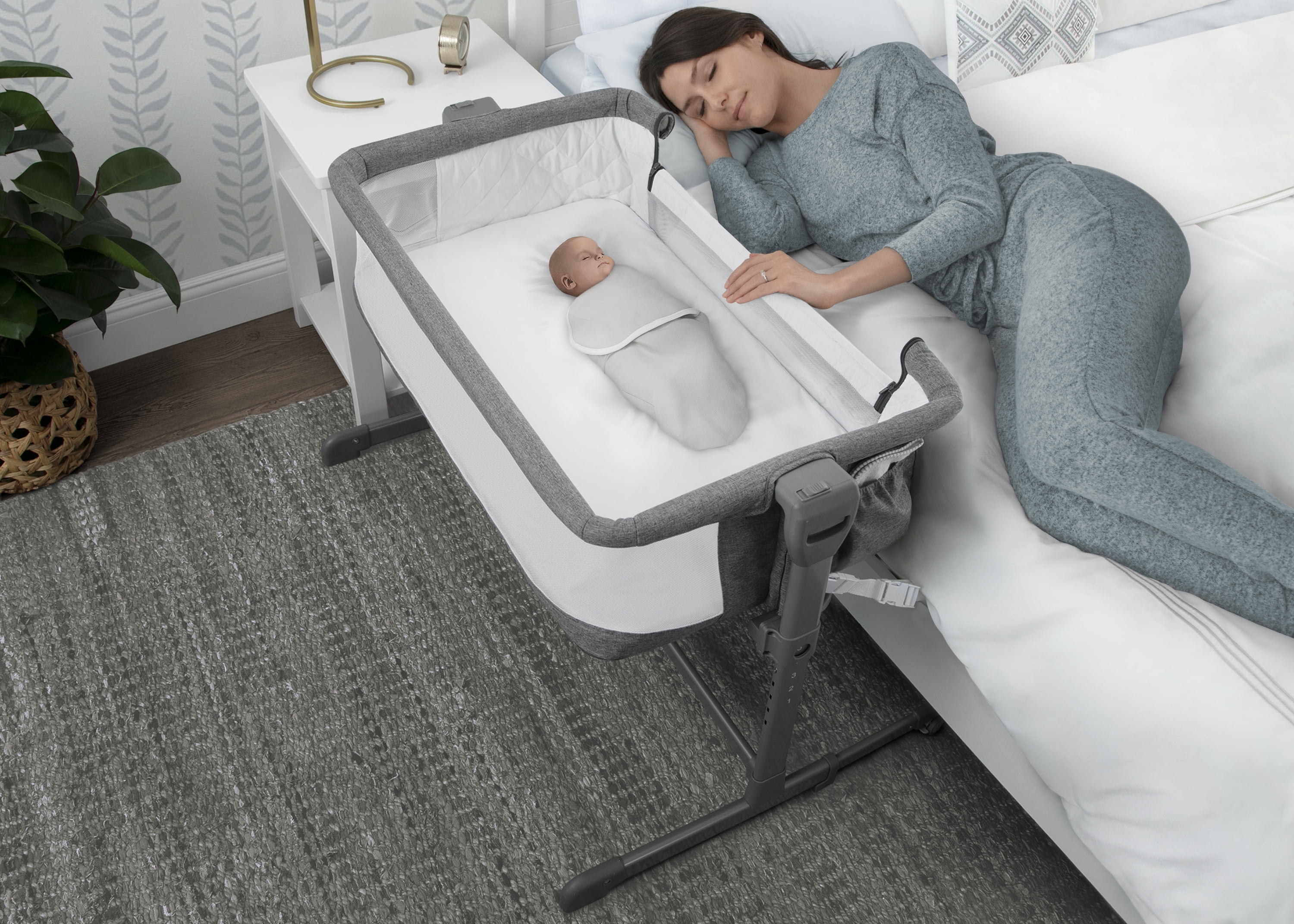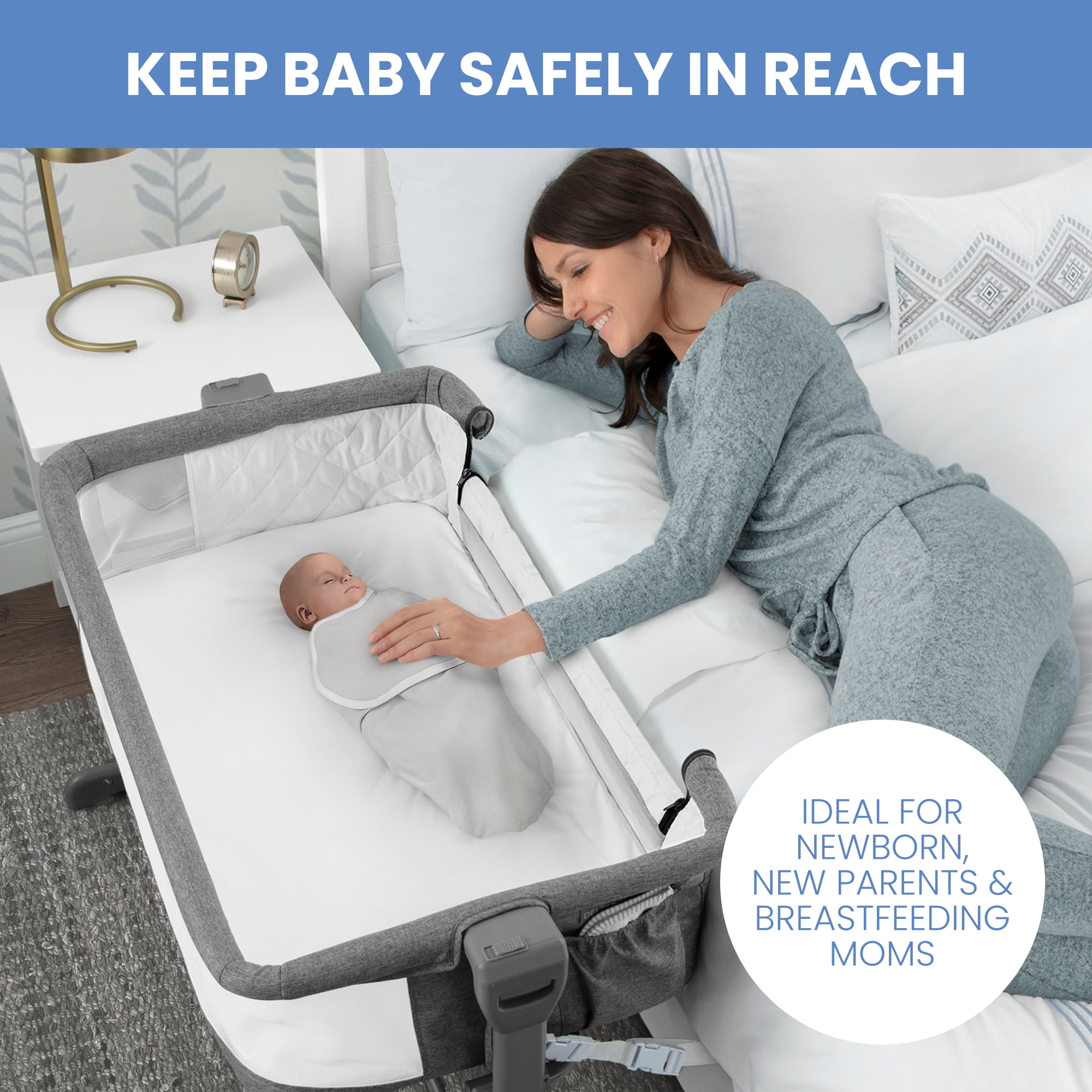 2-IN-1 DESIGN: Use as standalone bassinet or as bedside sleeper | Easily convert to bedside sleeper by unzipping and unrolling side wall | Securely attach the bassinet to your adult size bed using the included safety straps ADJUSTABLE HEIGHT: 5 adjustable height positions allow the bassinet to accommodate beds 19-inches to 24-inches high | Ideal for newborns and breastfeeding moms, this will help new parents get back to sleep quickly after feeding or comforting baby BREATHABLE MESH SIDES: Breathable and see-through mesh walls all around allow for airflow and clear view of baby | Bassinet includes waterproof mattress pad, fitted sheet and beside strap; fitted sheet and bassinet cover are machine washable SPACIOUS SLEEP AREA: Larger sleep area than the average bedside bassinet provides baby with plenty of space | Size: 27”L x 40”W x 28”H; Bedside opening: 25”W| Product weight: 19.2 lbs. | Built-in wheels make it easy to move from room to room TONS OF STORAGE: A large storage pocket keeps baby’s essentials like diapers, baby wipes and more within reach | Bassinet is JPMA certified to meet or exceed all safety standards