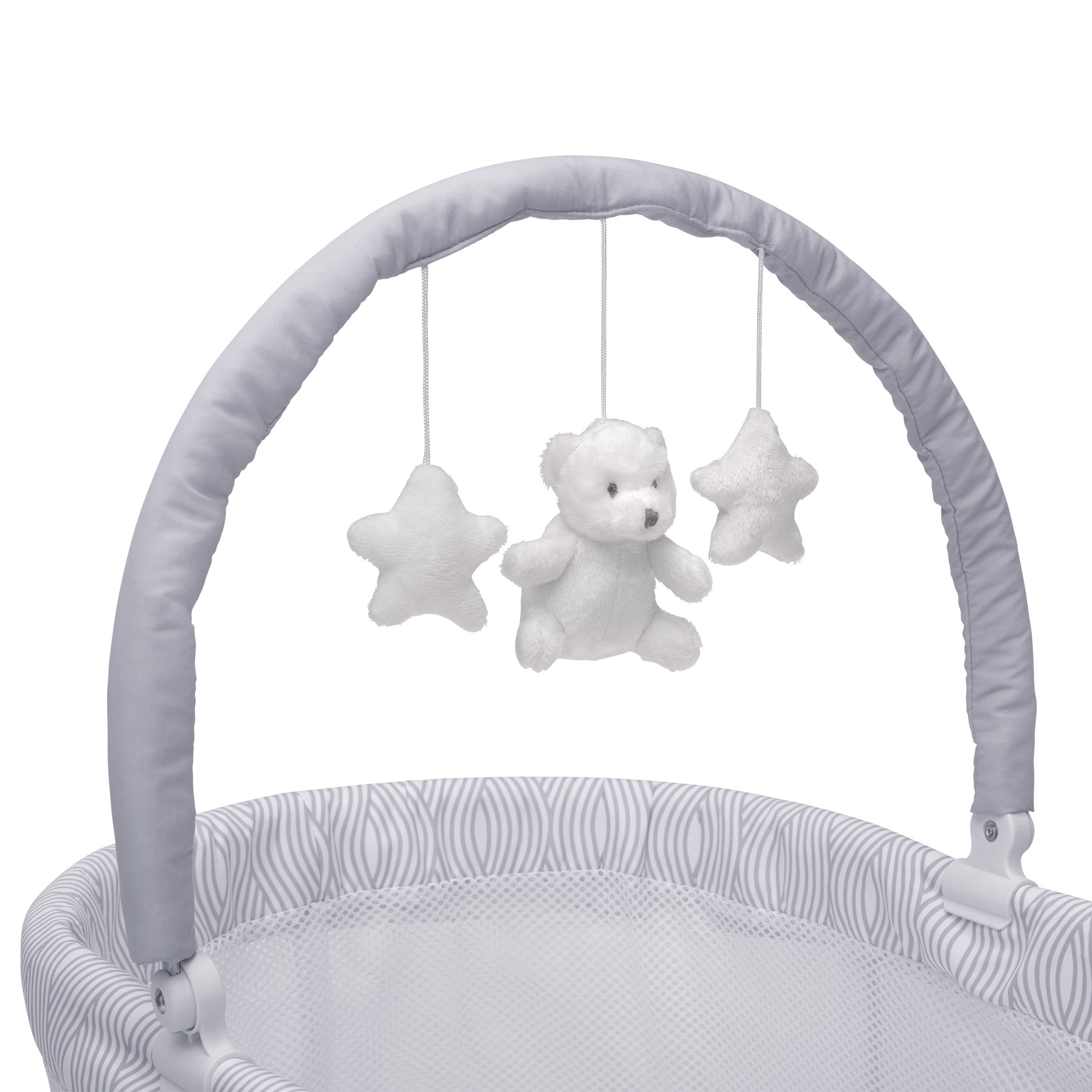 OPEN AIRFLOW: Mesh sides all around provide open airflow and clear view of your baby | Trim printed in a cool wave pattern adds a modern touch FUN TOY BAR: Adjustable toy bar with plush stars and bear provides entertainment if your baby wakes in the middle of the night | SAFE CHOICE: This bassinet JPMA certified to meet or exceed all safety standards set by the CPSC & ASTM COMFY MATTRESS: This bassinet includes a 1-inch water-resistant mattress pad and machine washable fitted sheet TONS OF STORAGE: A large storage basket under the bassinet keeps changing necessities within reach | SIZE: Assembled dimensions: 32″”L x 20″”W x 45″”H | 4 lockable wheels make it easy to move this bassinet around the house to keep your baby close