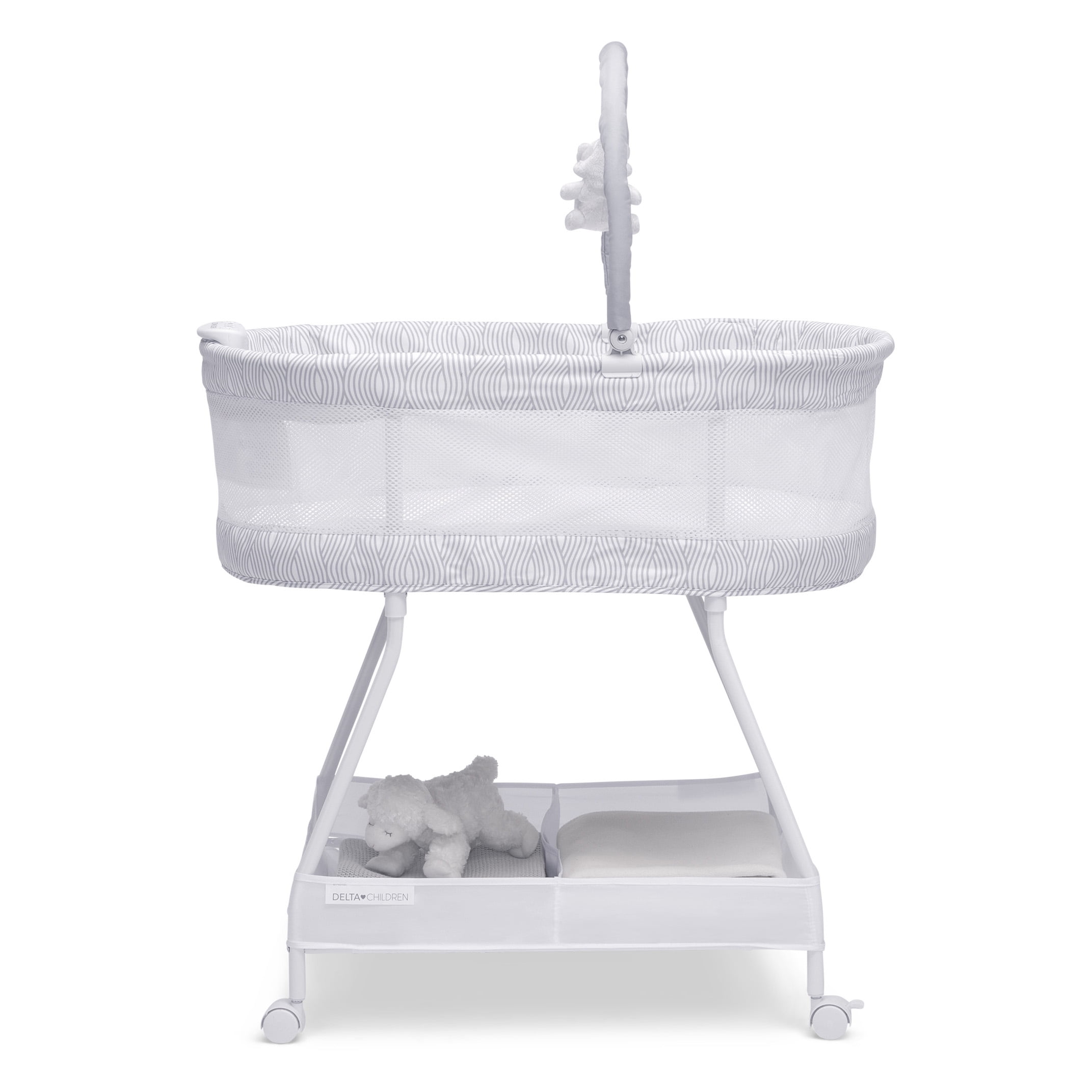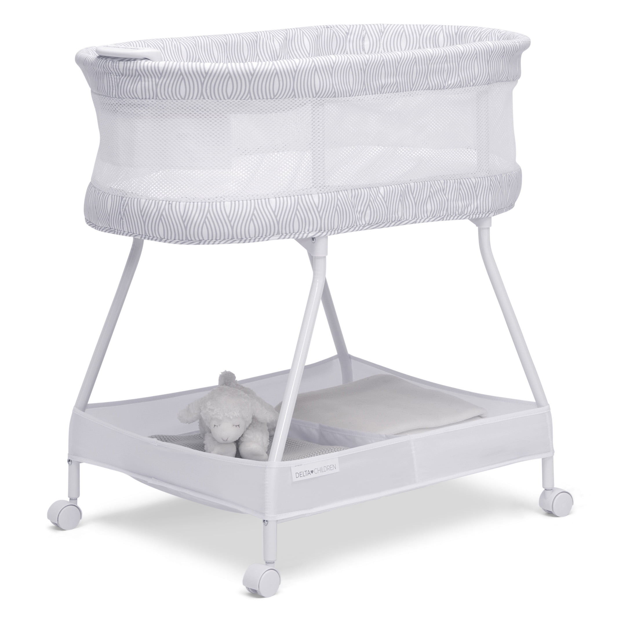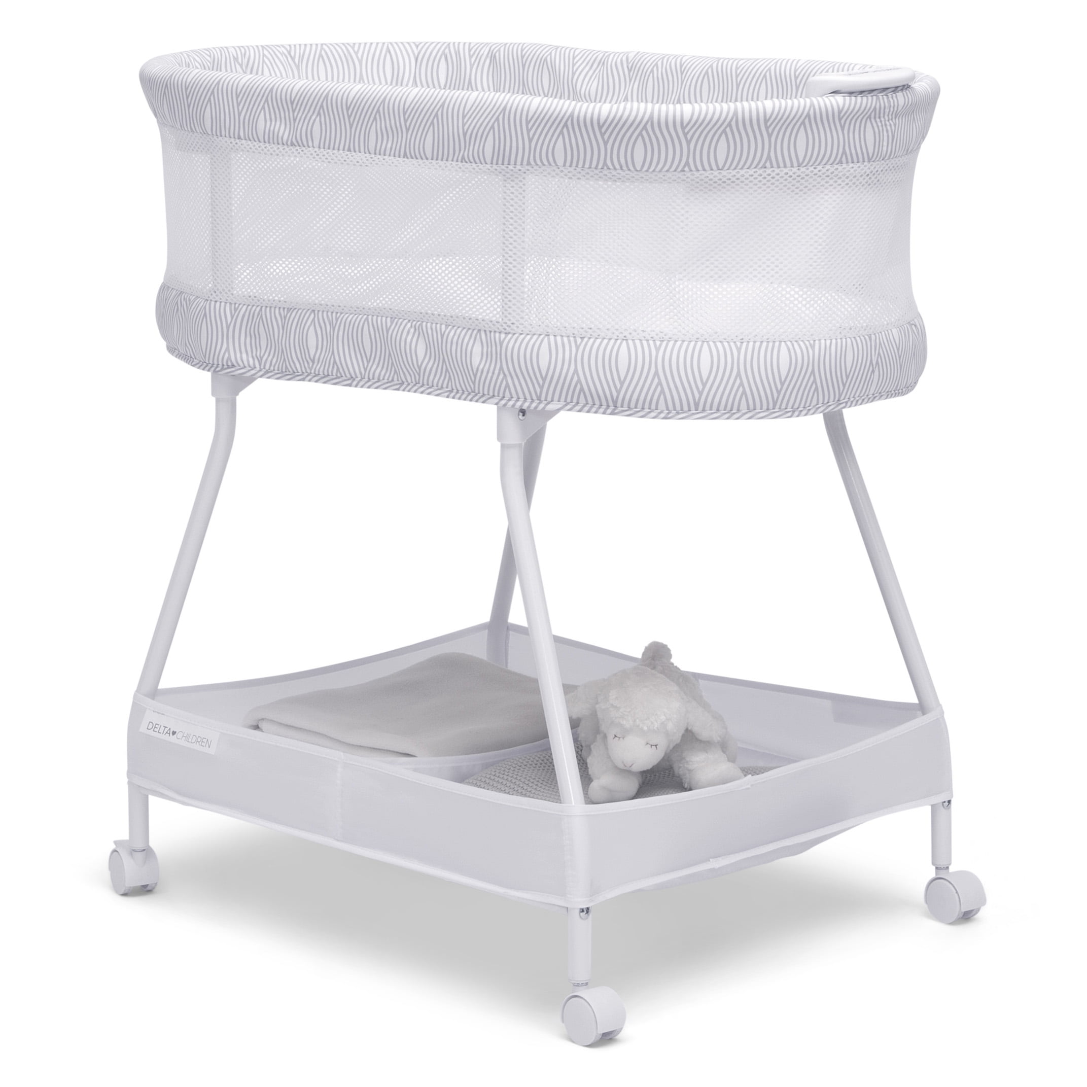 The Curve Bassinet by Delta Children is designed to help your little one fall asleep faster and stay asleep. This must-have bassinet features a control panel at the front with vibration, nightlight and soothing sounds to lull your newborn to sleep while mesh sides provide open airflow for breathability and a clear view of your baby. For your convenience, the adjustable toy bar provides entertainment if your baby wakes, lockable wheels make it easy to move around the house, and the easy-to-reach storage basket keeps changing essentials within reach. The Curve Bassinet by Delta Children is the easiest way stay safely connected and close to your baby during their first few months, and the modern wave print on the trim looks great in your master bedroom while room sharing or in your baby’s nursery. This bassinet is recommended for babies 0-5 months or up to 30lbs. Stop use at 5 months or once your infant begins to push up on their hands and knees, whichever comes first. Delta Children was founded around the idea of making safe, high-quality children’s furniture affordable for all families. They know there’s nothing more important than safety when it comes to your child’s space. That’s why all Delta Children products are built with long-lasting materials to ensure they stand up to years of jumping and playing. Plus, they are rigorously tested to meet or exceed all industry safety standards.