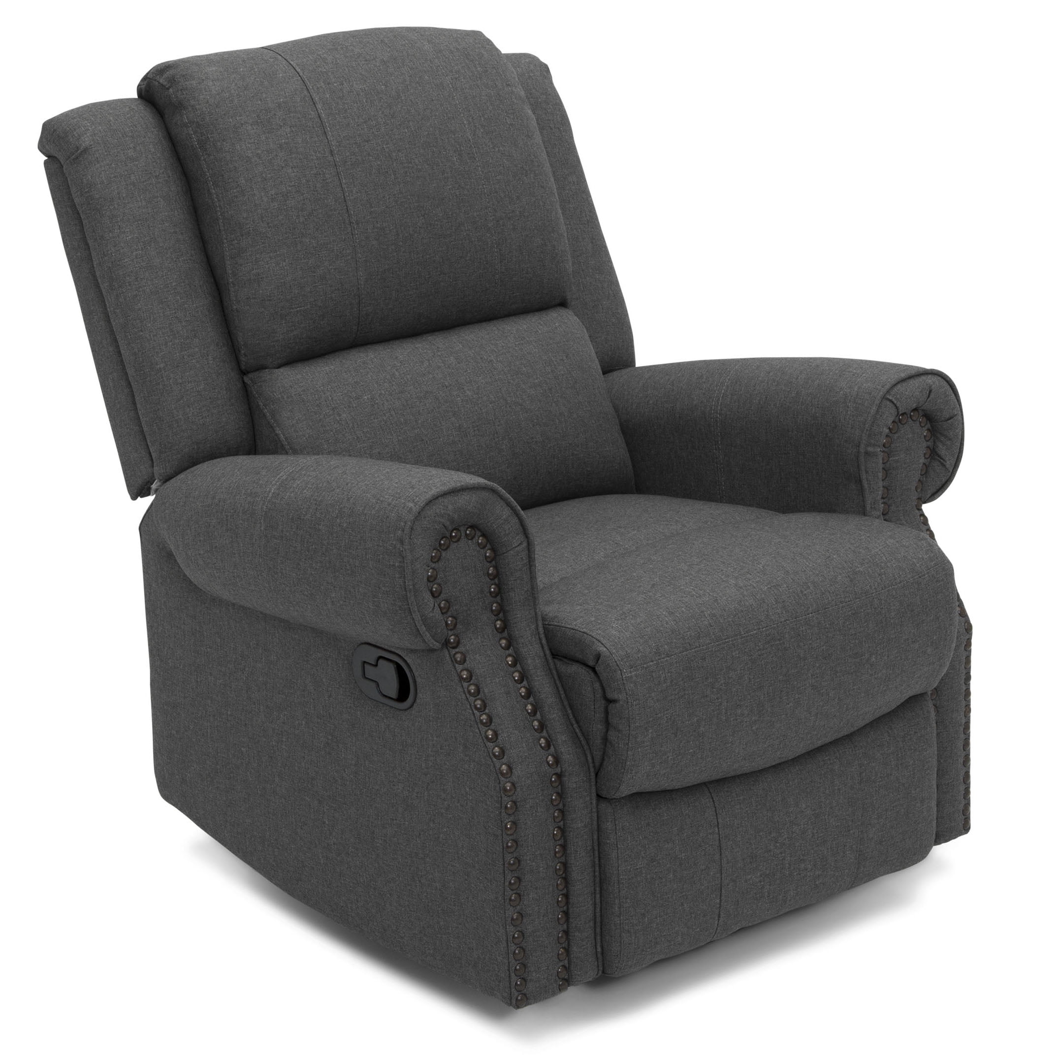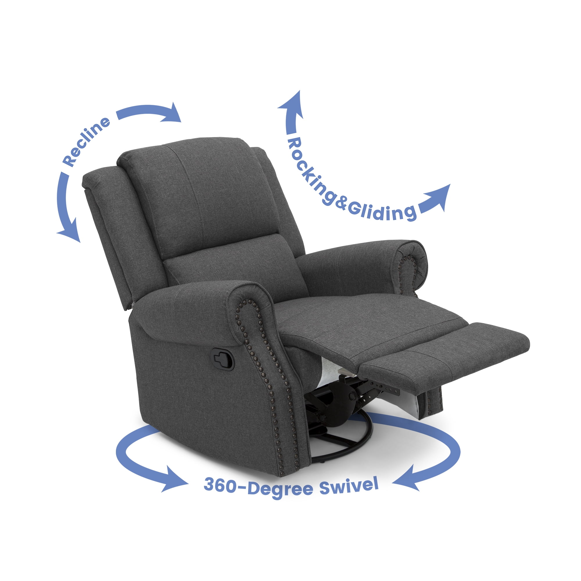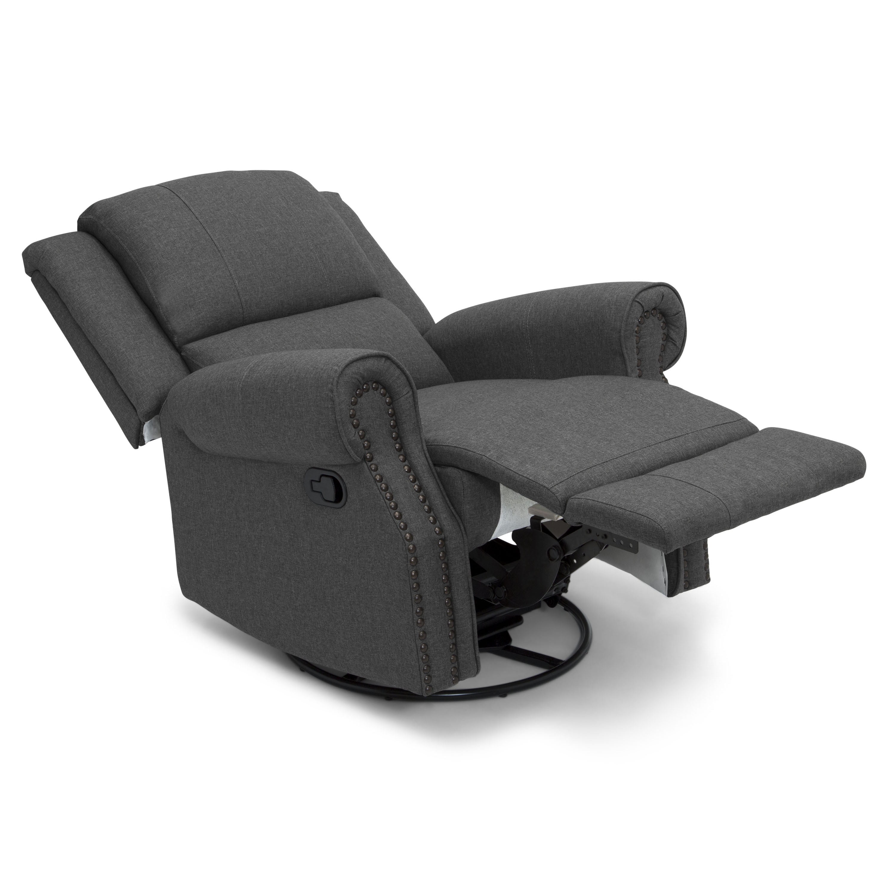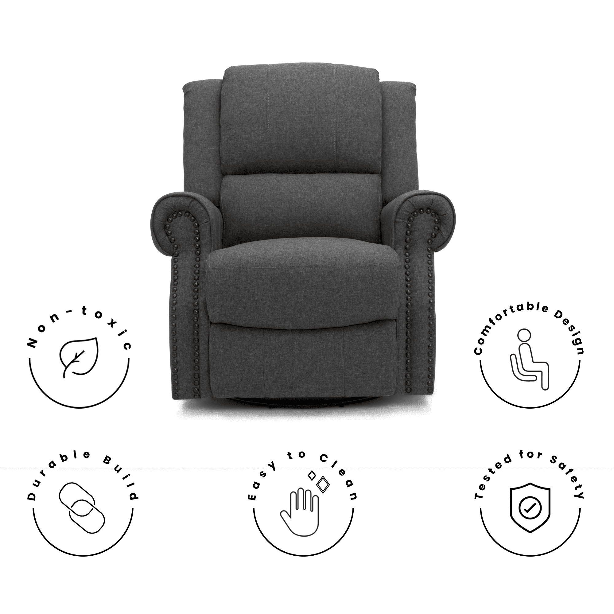 Instantly add style and comfort to your baby?s bedroom with the Drake Nursery Glider Swivel Recliner from Delta Children. It creates a welcoming retreat for you and your new arrival with its quiet swivel action, gliding base and easy recline. The chair?s easy-to-reach reclining mechanism offers two recline positions, you can keep the seat upright and just prop up your legs or fully recline. A deep seat and cushioned arms at exactly the right height provide a relaxing environment for feeding, reading or bonding with your baby. Accented with nailhead trim for a tailored look, the Drake Nursery Glider Swivel Recliner offers chic comfort that takes center stage no matter where you place it. Once your little one no longer needs the chair in their nursery, move it to your living room, master suite, home theater or man cave?this recliner suits any space. The Drake Nursery Glider Swivel Recliner from Delta Children is available in Charcoal, Flax or Blush. Delta Children was founded around the idea of making safe, high-quality children?s furniture affordable for all families. They know there?s nothing more important than safety when it comes to your child?s space. That?s why all Delta Children products are built with long-lasting materials to ensure they stand up to years of jumping and playing. Plus, they are rigorously tested to meet or exceed all industry safety standards.