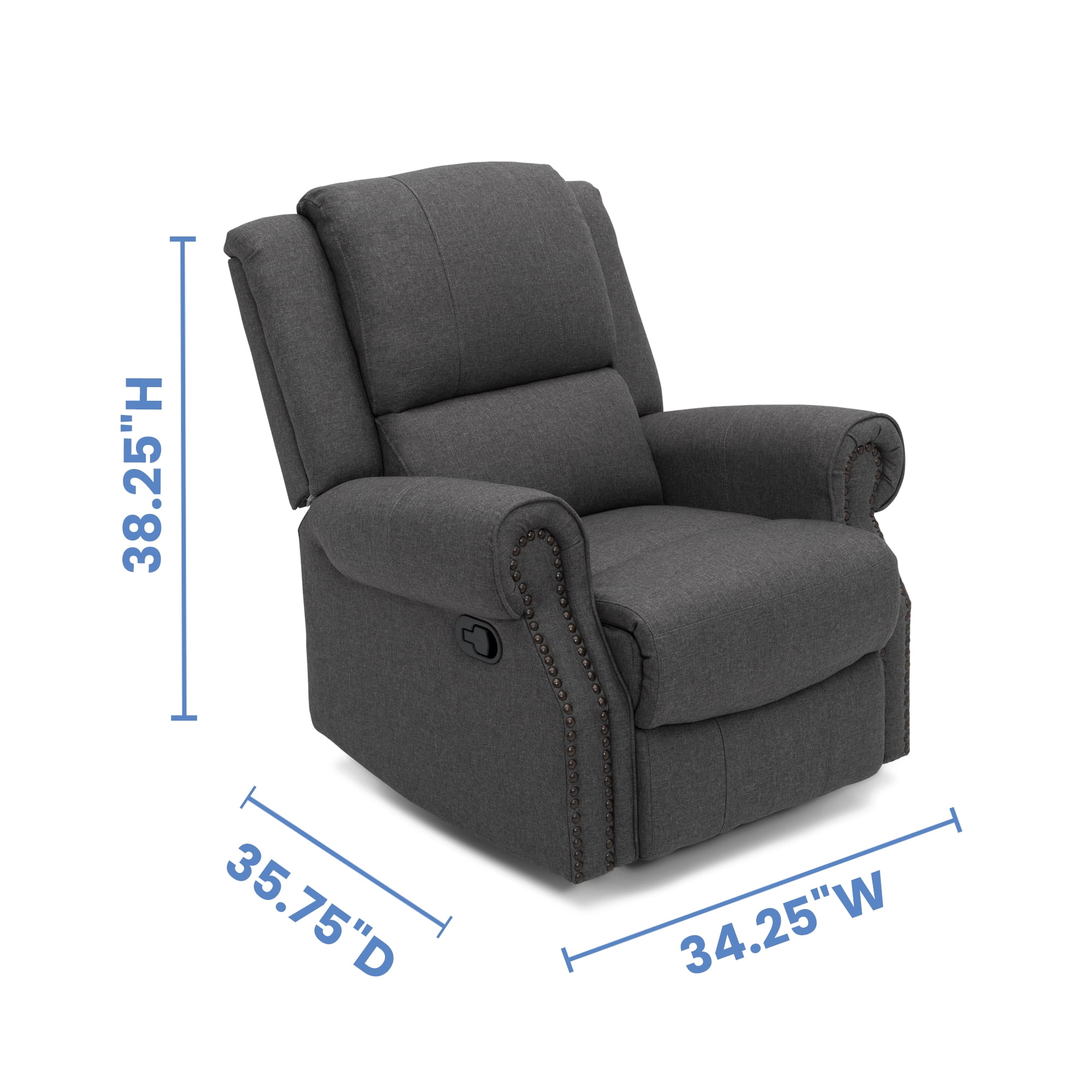 Recliner features whisper quite, gentle smooth gliding, swivel and reclining motion Pull-tab reclining mechanism is easy to reach Durable steel mechanisms to ensure quiet movements Seat cushion with pocketed coil spring construction for long lasting comfort and support Assembled dimensions: 34.5?L x 35.75?W x 40.25?H; Seat size: 20.25″W x 20.75″D x 19.25″H; Seat to Backrest Height: 25.5″; Seat Cushion: 8.75″ thick Sturdy frame providing stability Designed with your