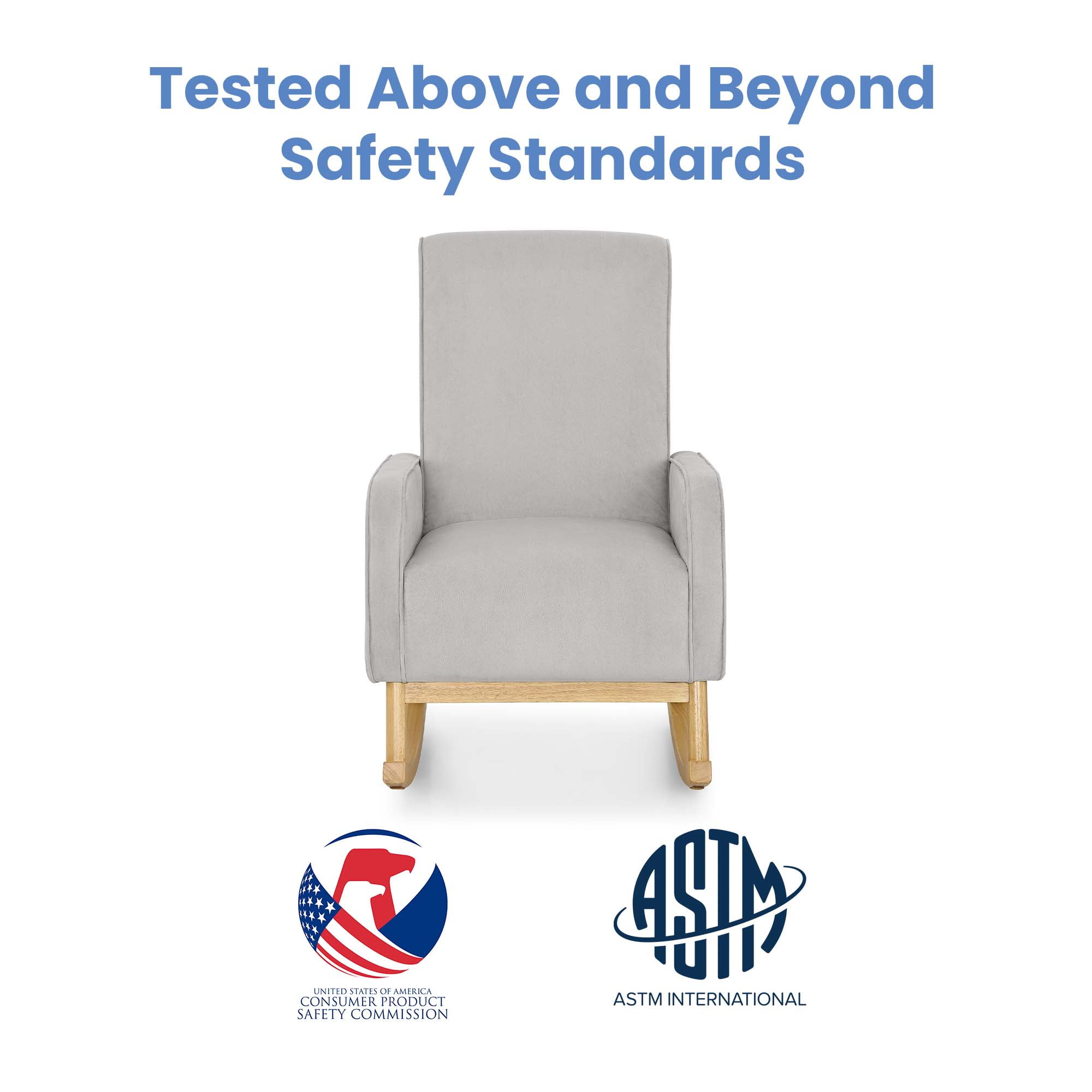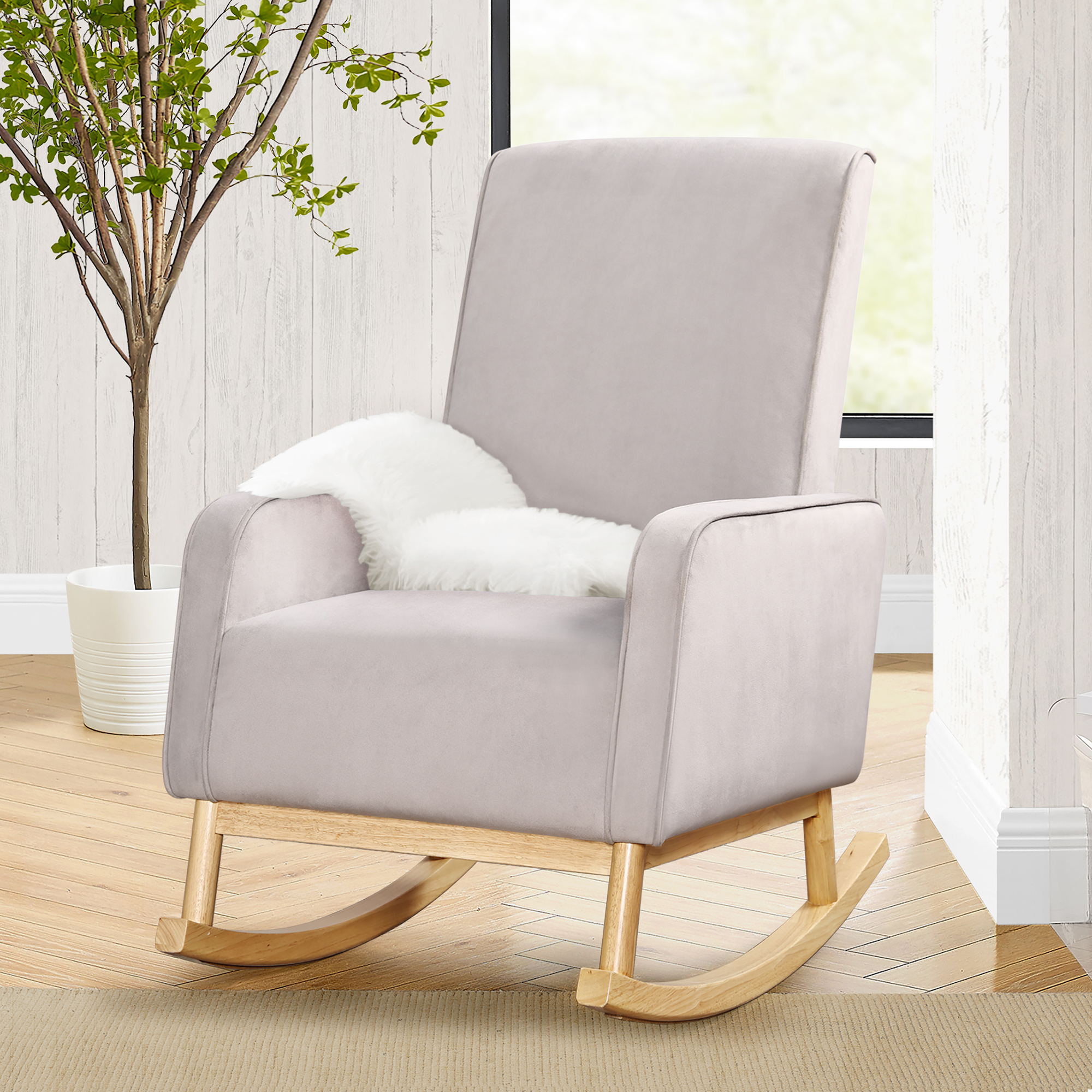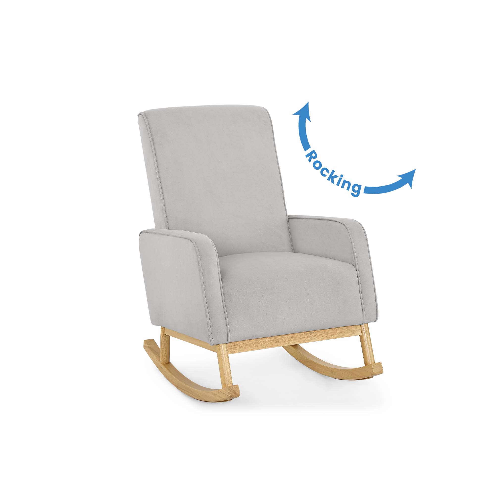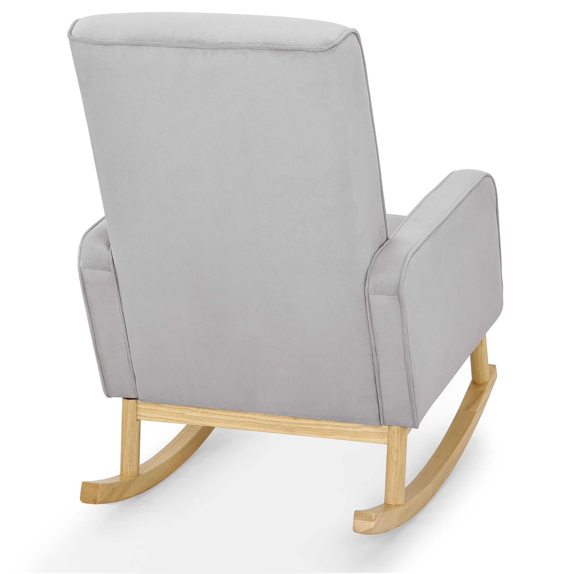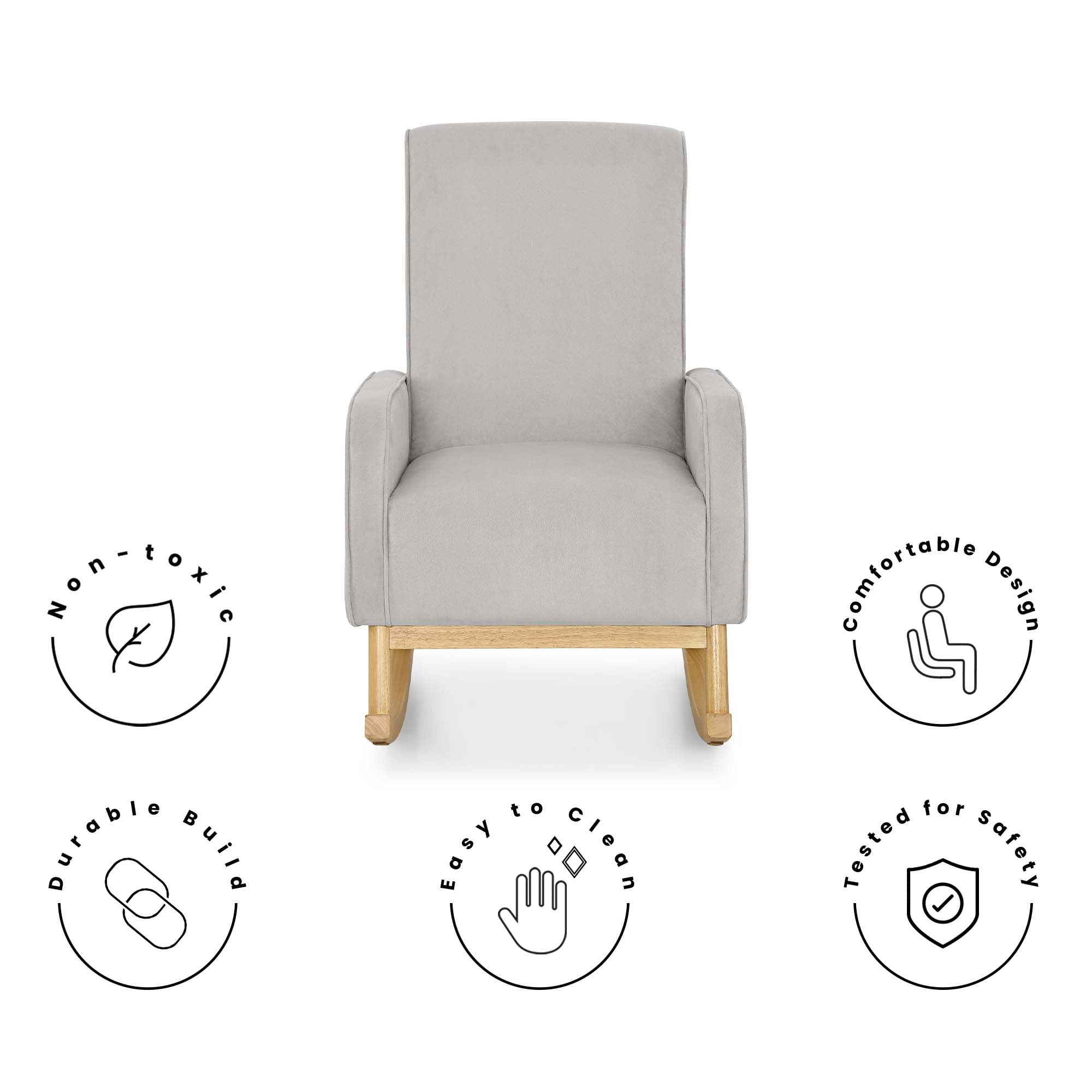 STURDY BUILD: Durable wood frame provides stability | Solid wood rocking base | Felt on rocker base protects floors MODERN DESIGN: Rocker boasts mid-century modern style and ergonomic arm height | Use this rocking chair in your nursery, living room, master bedroom or man cave | Available in Cloud Grey with a natural wood base SUPER COMFORTABLE: Armrests and seat cushion are thickly padded for comfort | Seat cushion features pocketed coil spring construction for long lasting comfort and support EASY ASSEMBLY & CARE: Includes hardware and tools needed for assembly | Use only mild, water-free cleaning solvents | Never use water, tap water contains minerals that may cause rings/fading | Do not use bleach or dry clean individual parts