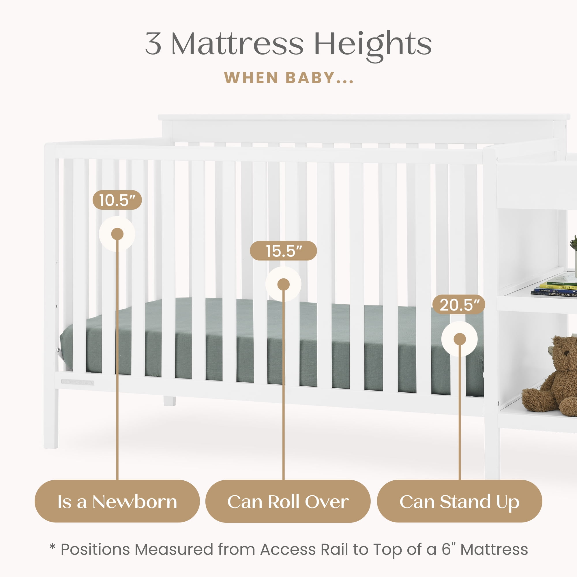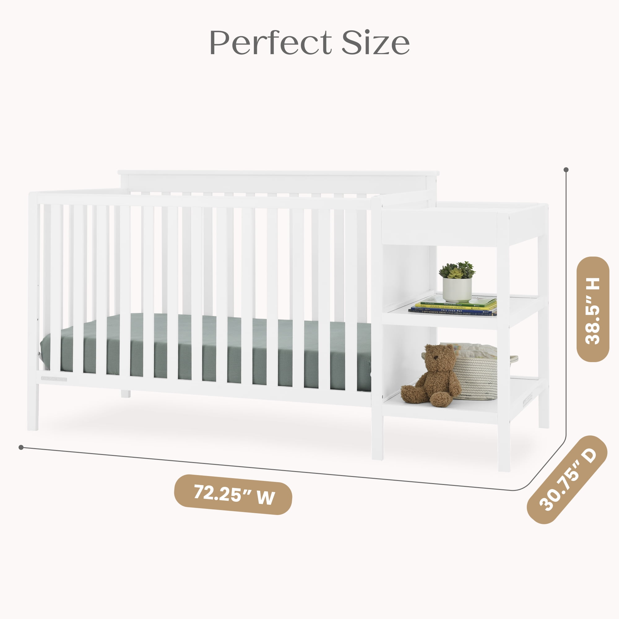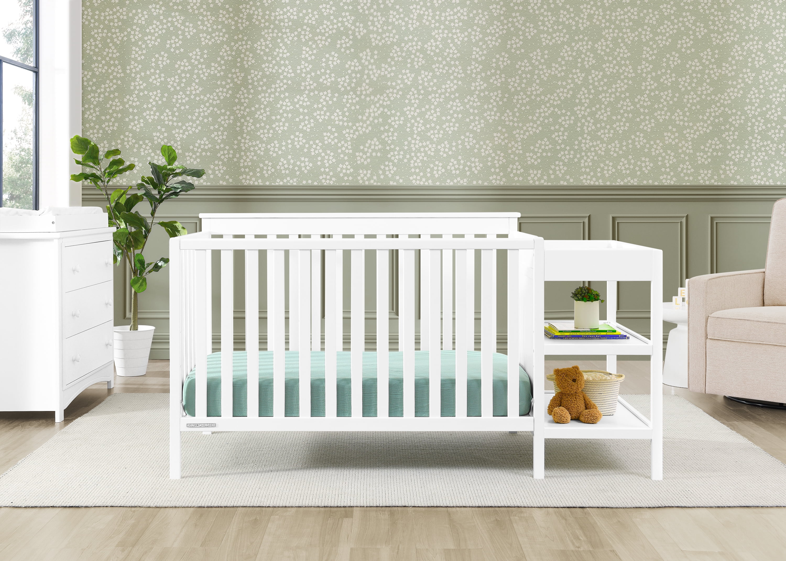 5-IN-1 CONVERTIBLE CRIB AND CHANGER: Crib converts to a toddler bed, daybed, and sofa and full size bed with headboard (Daybed/Toddler Guardrail Kit #W137725 and standard full size metal bed frame sold separately) | Includes changing pad; changing pad size: 27”W x 15.75”D x 1”H GREENGUARD GOLD CERTIFIED: This crib meets the most stringent chemical emissions standards to create a healthier nursery for your child. Tested for more than 10,000 chemicals and VOCs, this crib is certified to contribute to cleaner indoor air ADJUSTABLE HEIGHT: Adjustable height mattress support with 3 convenient positions to grow with your baby | Access Rail to Floor: 35.25″; Access Rail to top mattress support position: 16.5″; Access Rail to bottom mattress support position: 26.5″ TONS OF STORAGE: The attached changing table features two open shelves that provide plenty of storage space for diapers, wipes, and any other necessities | Shelf dimensions: 16.5”W x 27.75”D x 9.25”H SAFE OPTION FOR YOUR BABY: This crib is JPMA certified to meet or exceed all safety standards set by the CPSC & ASTM | We know chemicals have no place in your nursery, so we use a non-toxic multi-step painting process that is lead and phthalate safe COORDINATING ITEMS: Pair with any Delta Children Dresser for a complete nursery | Uses a standard size crib mattress (sold separately) | To ensure the perfect fit pair your crib with a Delta Children, Serta, Beautyrest or Simmons Kids crib mattress QUALITY MATERIAL: Made of sustainable New Zealand pine, poplar and TSCA compliant engineered wood | Tested for lead and other toxic elements to meet or exceed government and ASTM safety standards SIZE: Assembled dimensions: 72.25″W x 30.75″D x 38.5″H