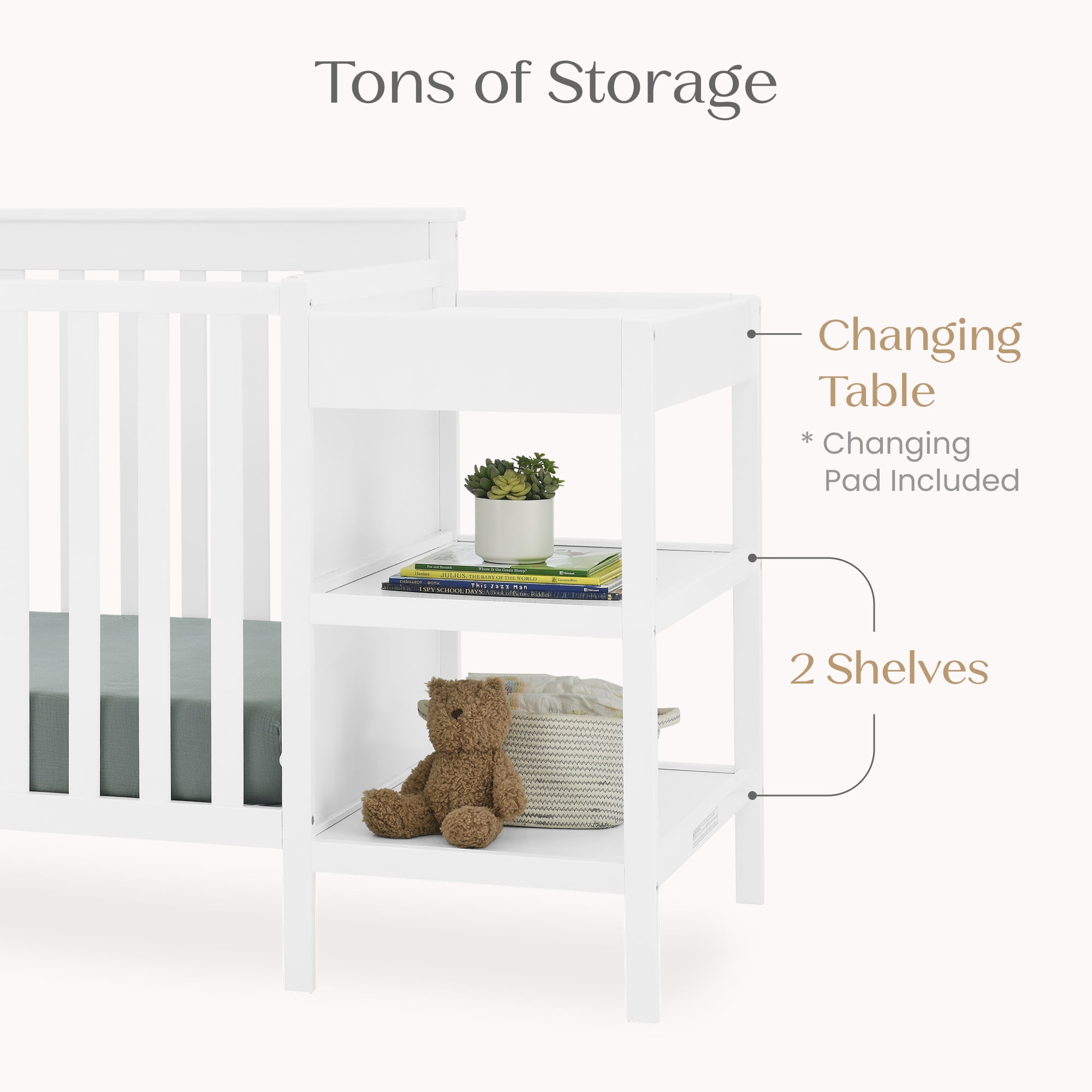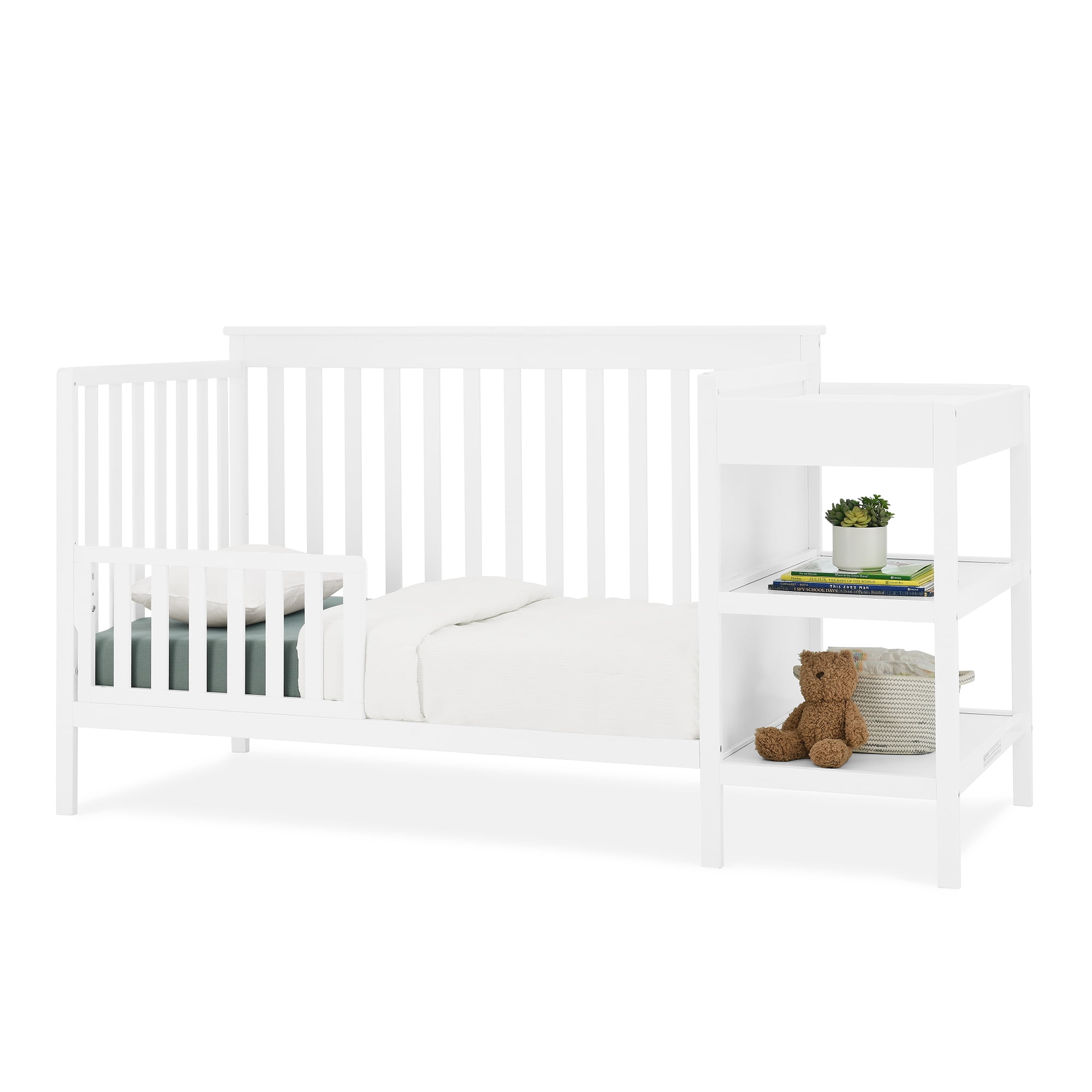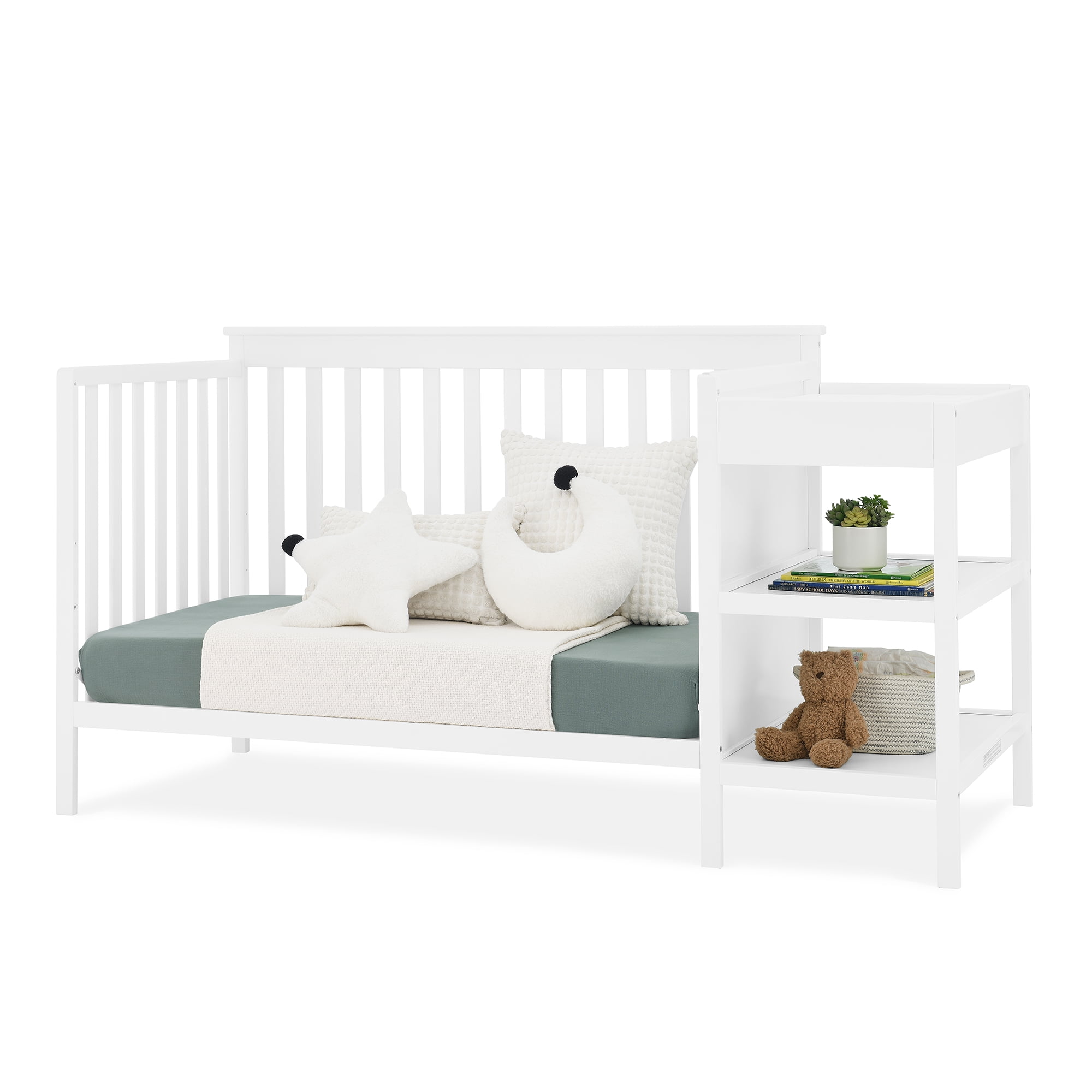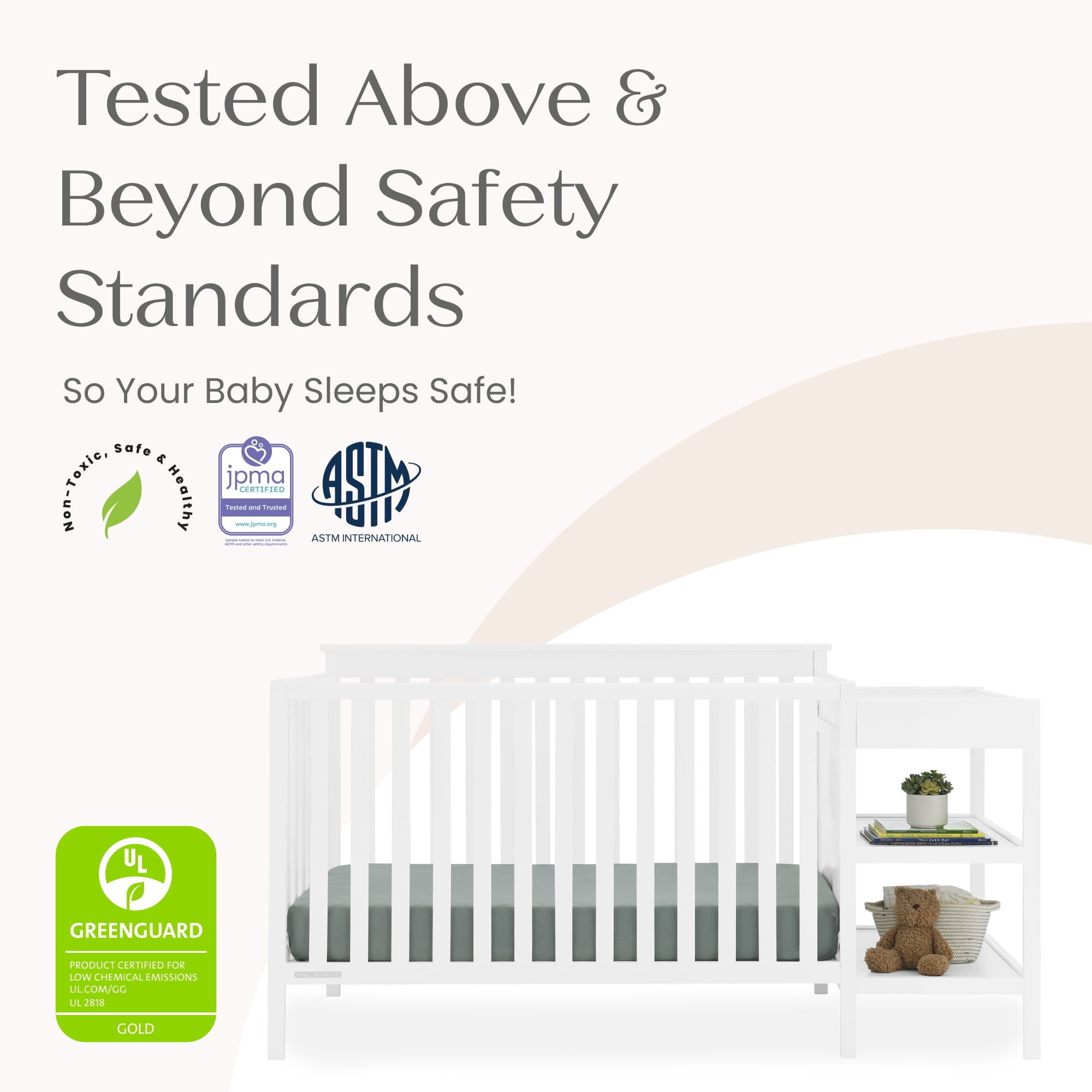 5-IN-1 CONVERTIBLE CRIB AND CHANGER: Crib converts to a toddler bed, daybed, and sofa and full size bed with headboard (Daybed/Toddler Guardrail Kit #W137725 and standard full size metal bed frame sold separately) | Includes changing pad; changing pad size: 27”W x 15.75”D x 1”H GREENGUARD GOLD CERTIFIED: This crib meets the most stringent chemical emissions standards to create a healthier nursery for your child. Tested for more than 10,000 chemicals and VOCs, this crib is certified to contribute to cleaner indoor air ADJUSTABLE HEIGHT: Adjustable height mattress support with 3 convenient positions to grow with your baby | Access Rail to Floor: 35.25″; Access Rail to top mattress support position: 16.5″; Access Rail to bottom mattress support position: 26.5″ TONS OF STORAGE: The attached changing table features two open shelves that provide plenty of storage space for diapers, wipes, and any other necessities | Shelf dimensions: 16.5”W x 27.75”D x 9.25”H SAFE OPTION FOR YOUR BABY: This crib is JPMA certified to meet or exceed all safety standards set by the CPSC & ASTM | We know chemicals have no place in your nursery, so we use a non-toxic multi-step painting process that is lead and phthalate safe COORDINATING ITEMS: Pair with any Delta Children Dresser for a complete nursery | Uses a standard size crib mattress (sold separately) | To ensure the perfect fit pair your crib with a Delta Children, Serta, Beautyrest or Simmons Kids crib mattress QUALITY MATERIAL: Made of sustainable New Zealand pine, poplar and TSCA compliant engineered wood | Tested for lead and other toxic elements to meet or exceed government and ASTM safety standards SIZE: Assembled dimensions: 72.25″W x 30.75″D x 38.5″H