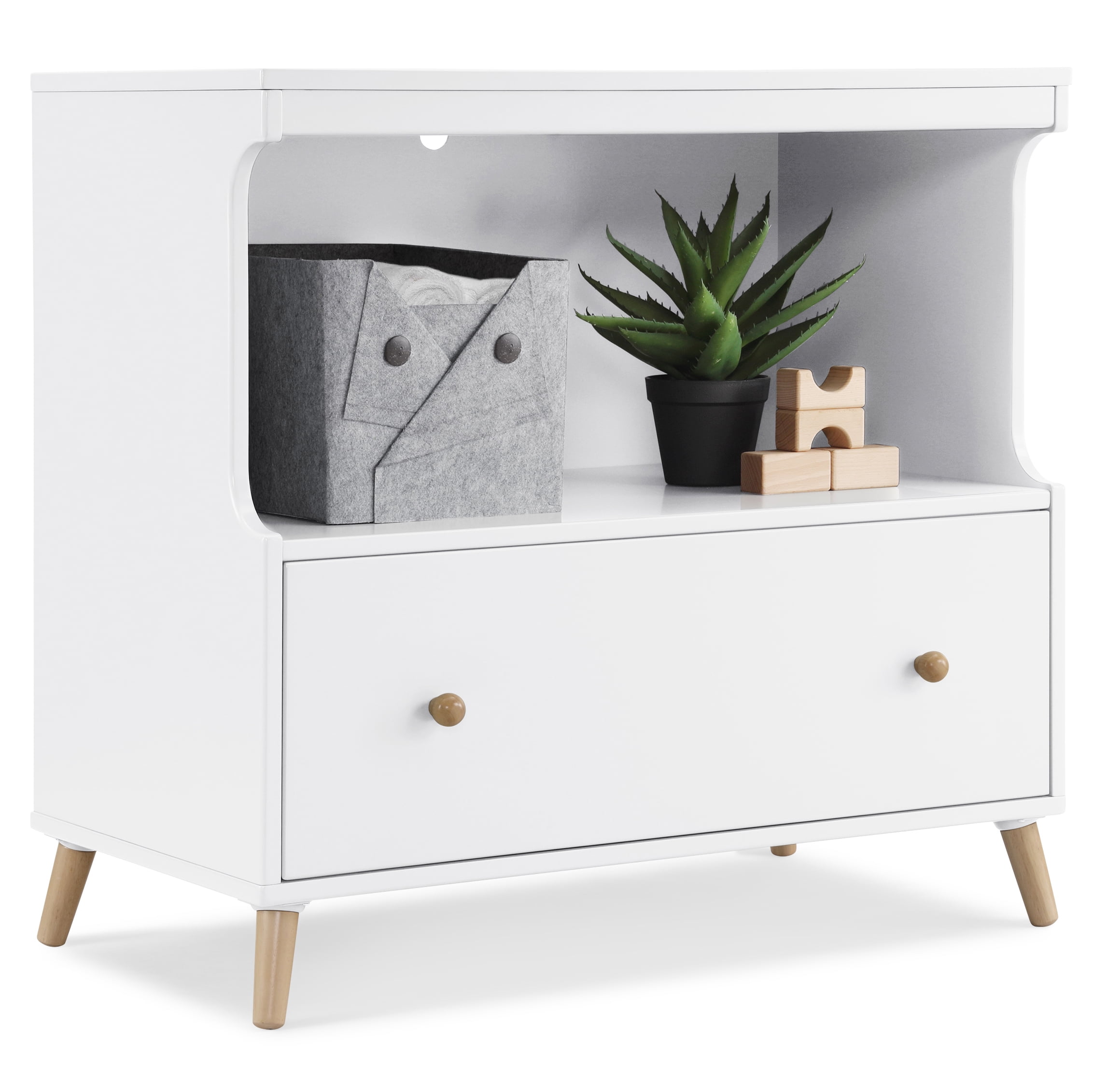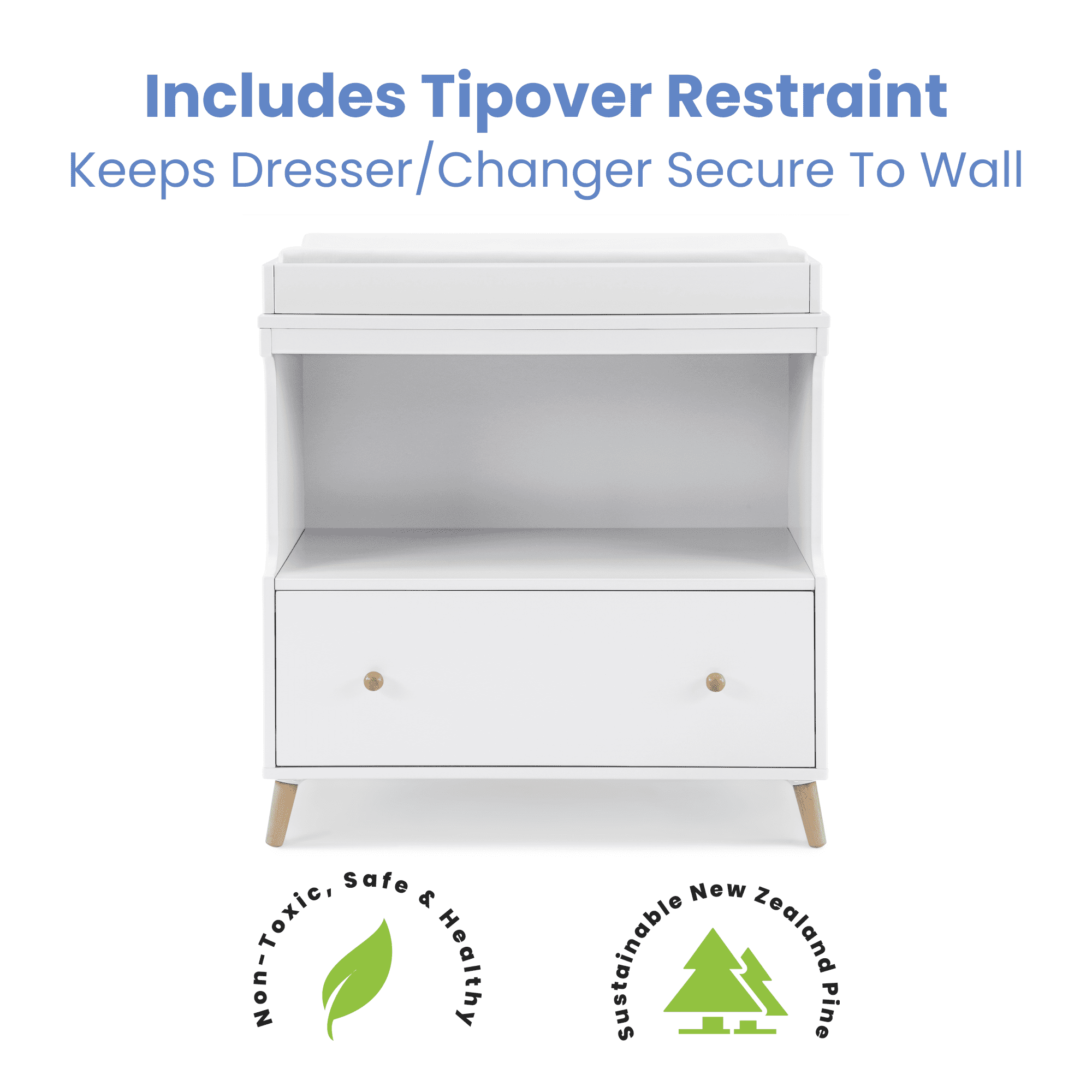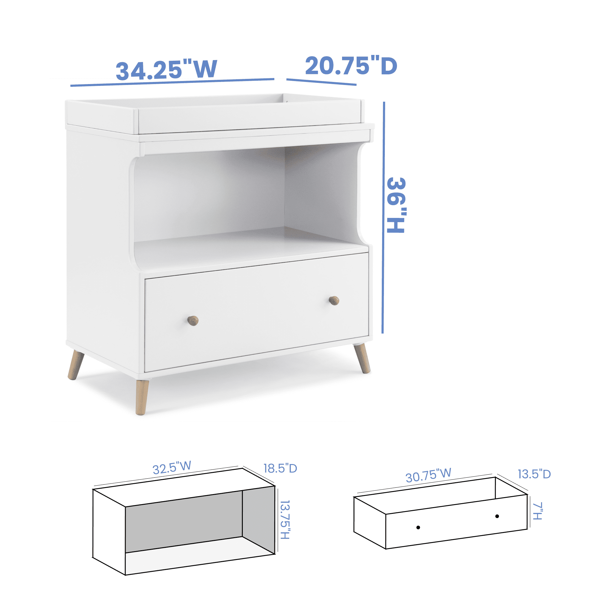 VERSATILE STORAGE: This changing table features an open cubby above a large drawer for plenty of storage space | Included changing top is removeable SAFE OPTION: We know chemicals have no place in your house, so we use a non-toxic multi-step painting process that is lead and phthalate safe | This convertible changing table includes a tipover restraint (safety anchor) for you to securely attach it to your wall | Engineered and tested to meet ASTM F2057 Furniture Safety Standards | JPMA certified to meet or exceed all safety standards set by ASTM COORDINATING ITEMS: The Essex Convertible Changing Table with Drawer coordinates with other items from the Delta Children Essex Collection | Available in Bianca White or Grey w/Natural Feet & Knobs QUALITY MATERIAL: Made of sustainable woods like New Zealand Pine, Rubberwood and TSCA compliant engineered wood| Tested for lead and other toxic elements to meet or exceed government and ASTM safety standards |Durable and easy to clean finish; wipe with damp cloth and dry immediately SIZE: Assembled dimensions: 34.25″W x 20.75″D x 36″H | Interior Drawer Size: 30.75″W x 13.50″D x 7″H| | Opening Size: 32.5″W x 18.5″D x 13.75″H | Included Changing Top Size: 33.75″W x 18.75″D | Accepts changing pad size 32″W x 16″D x 1″H (sold separately) | Easy assembly