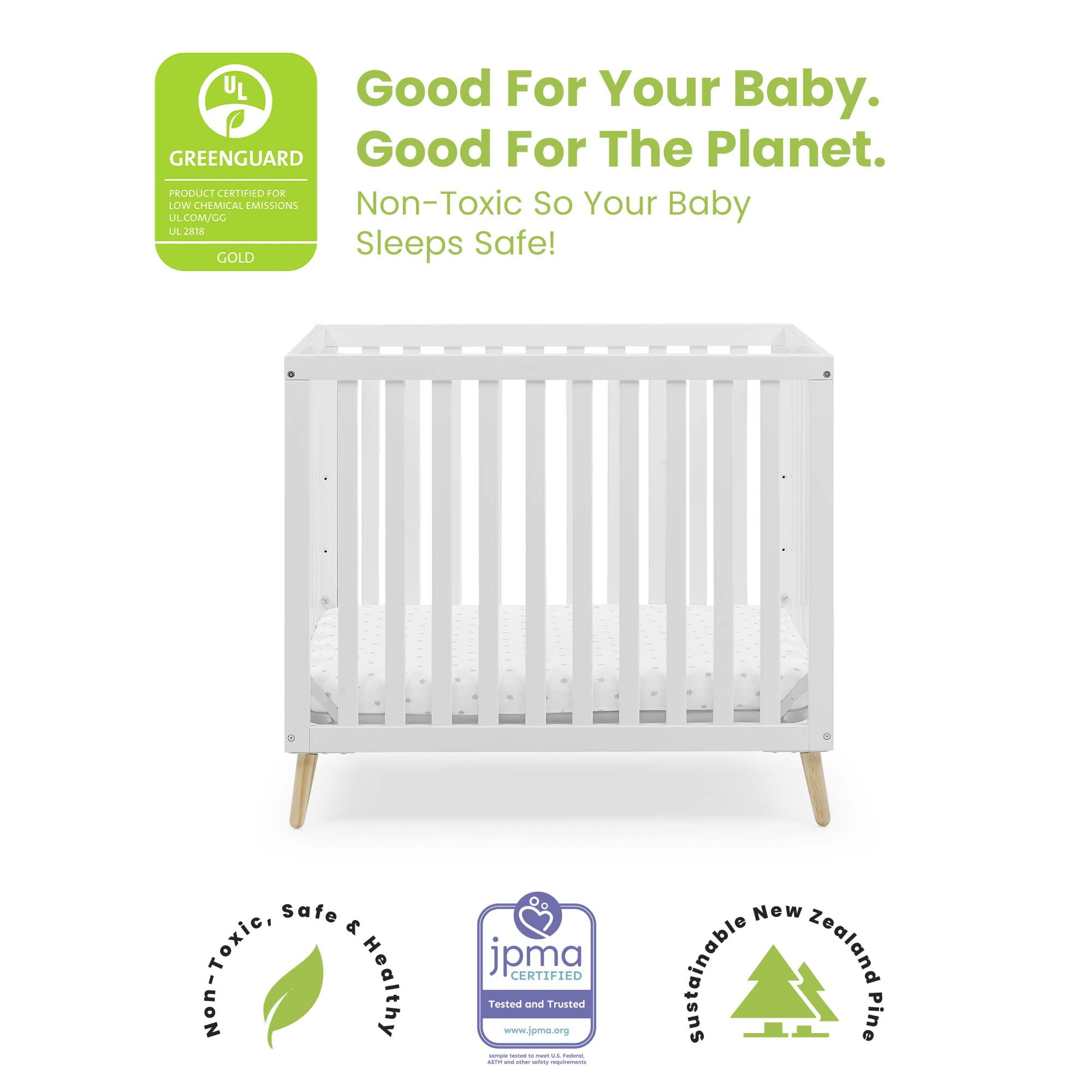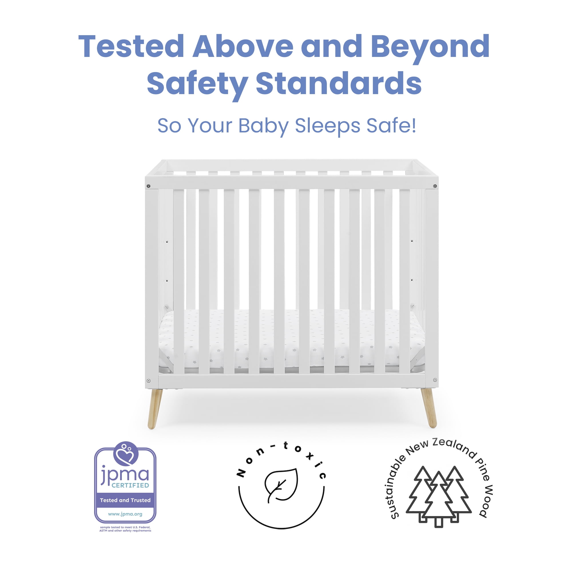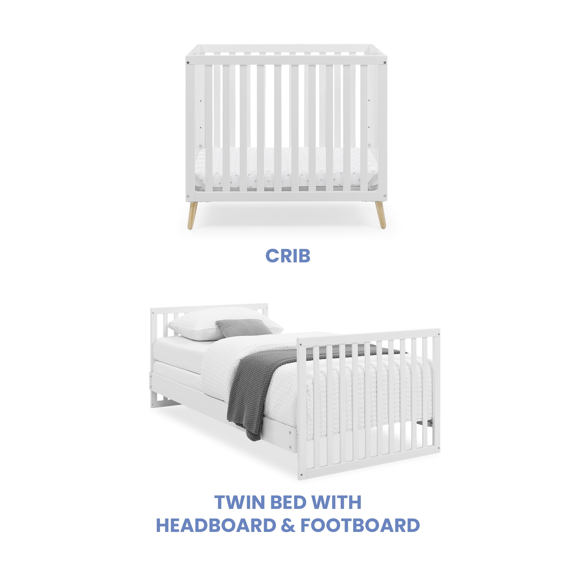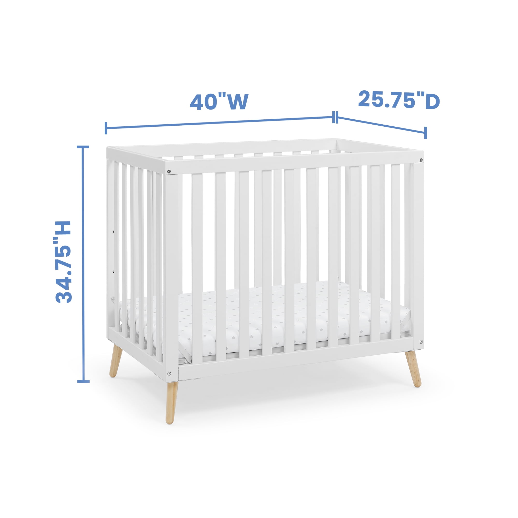 THE SAFEST OPTION FOR YOUR BABY: This crib is JPMA certified to meet or exceed all safety standards set by the CPSC & ASTM | We know chemicals have no place in your nursery, so we use a non-toxic, baby-safe painting process that is lead and phthalate safe COMFY MATTRESS INCLUDED: This Mini Crib includes a 2.75-inch thick mini crib mattress that is extremely comfortable and water-resistant | Mattress uses 24″ x 38″ size sheets 2-IN-1 CONVERTIBLE CRIB: Mini crib converts to a twin bed with headboard and footboard, or twin bed with headboard only (conversion rails sold separately) | Use Metal Bed Frame #0040 for headboard only or Twin Size Wood Bed Rails #W0090 for headboard & footboard |Available in Bianca White w/Natural or Grey w/Natural ADJUSTABLE HEIGHT: Adjustable height mattress support with 2 convenient positions to grow with your baby COORDINATING ITEMS: Pair this mini crib with any Delta Children Dresser to complete your nursery | When converting to twin bed, pair with a Delta Children Twin Mattress (sold separately) QUALITY MATERIAL: Made of sustainable New Zealand pine and poplar wood | Tested for lead and other toxic elements to meet or exceed government and ASTM safety standards SIZE: Assembled Mini Crib dimensions: 40″W x 25.75″D x 34.75″H