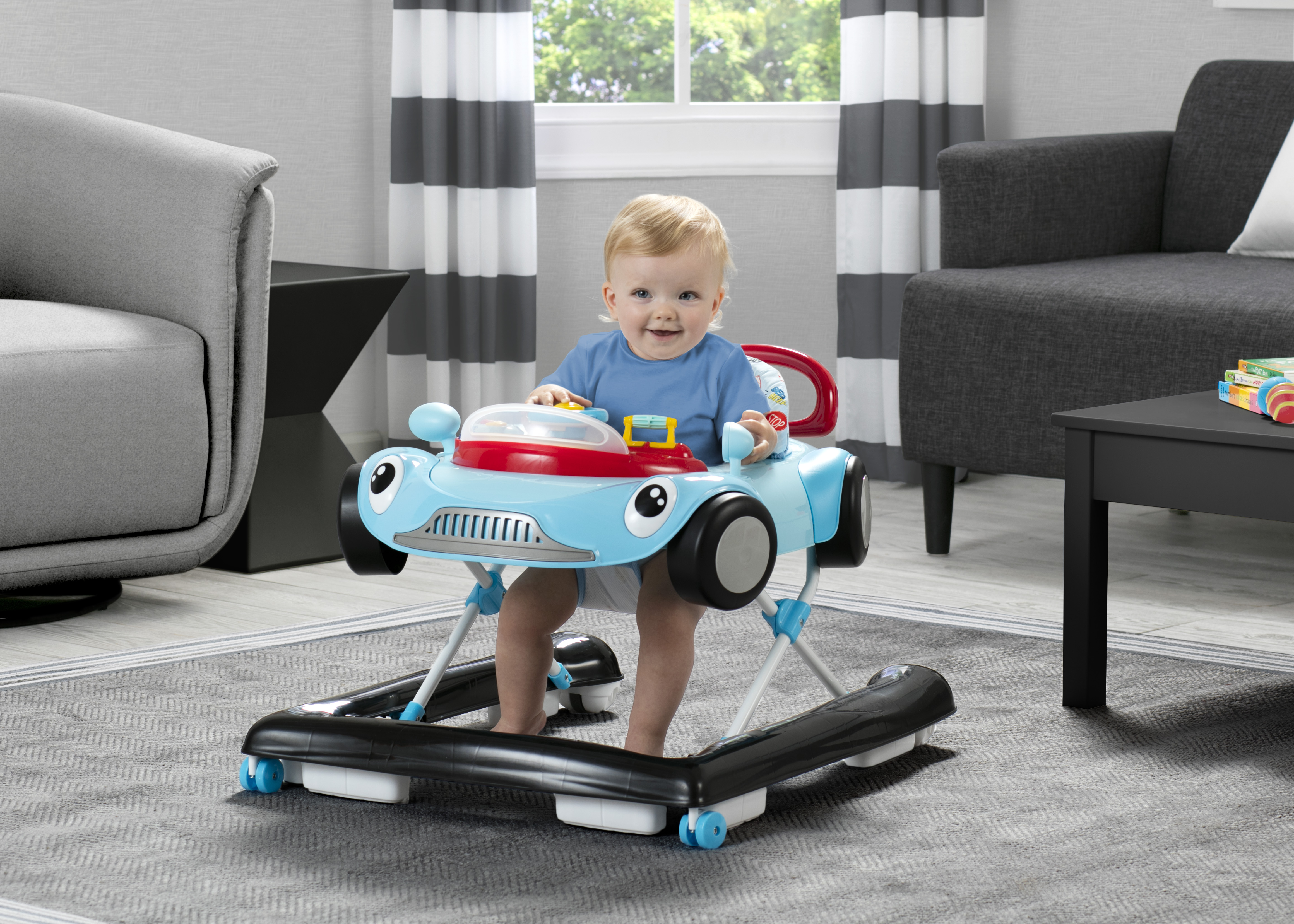 Baby will be off to the races in the First Race 2-in-1 Walker by Delta Children! Designed to stimulate early motor and cognitive skills, it is a perfect choice for your growing child with an innovative, 2-in-1 design that adapts to baby’s development. It transitions from an activity walker to a walk-behind walker turning baby’s first steps into an adventure of learning and discovery. As an activity walker, baby will enjoy engaging with all of the interactive features and toys from the comfort of the cushioned, high back chair. In the walk-behind mode, the walker’s easy-to-grasp handle offers additional support as your child begins to walk on their own. Designed to replicate a race car, this walker’s fun features include a movable steering wheel and horn to engage baby’s curiosity, stimulating their auditory and visual senses. The removable tray allows baby to take playtime anywhere and when playtime is over, it easily pops off the tray to reveal a generously sized eating surface, perfect for snack time. Offering the ideal support at each developmental stage, this walker features a 3-position height adjustment that grows with baby, and the chair cover is machine washable for easy cleaning. Available in Pink or Blue, the First Race Walker makes a great baby gift for boys or girls. Delta Children was founded around the idea of making safe, high-quality children’s furniture affordable for all families. They know there’s nothing more important than safety when it comes to your child’s space. That’s why all Delta Children products are built with long-lasting materials to ensure they stand up to years of jumping and playing. Plus, they are rigorously tested to meet or exceed all industry safety standards.