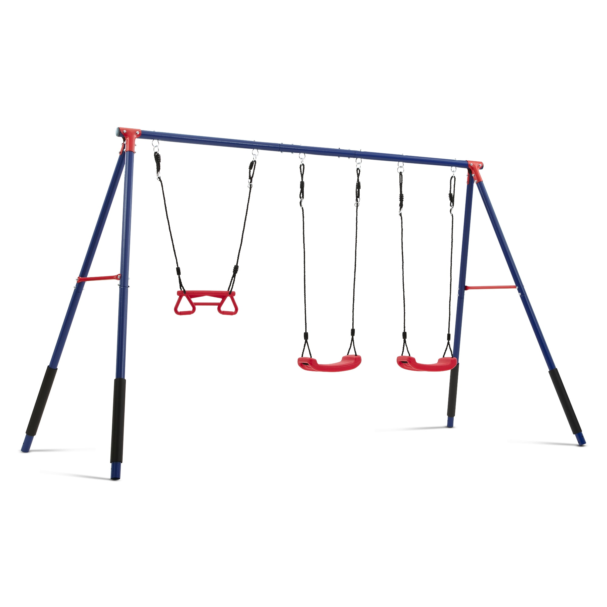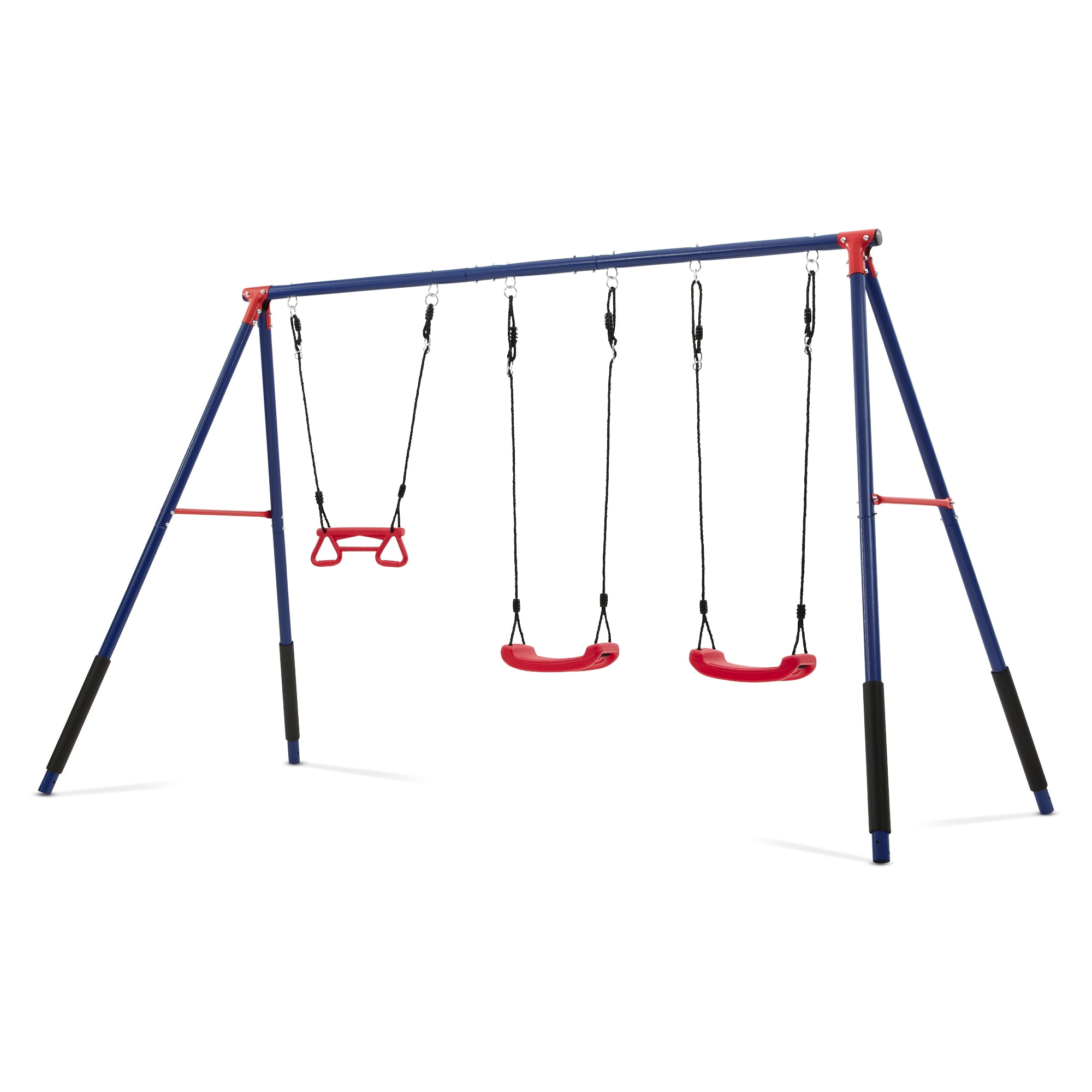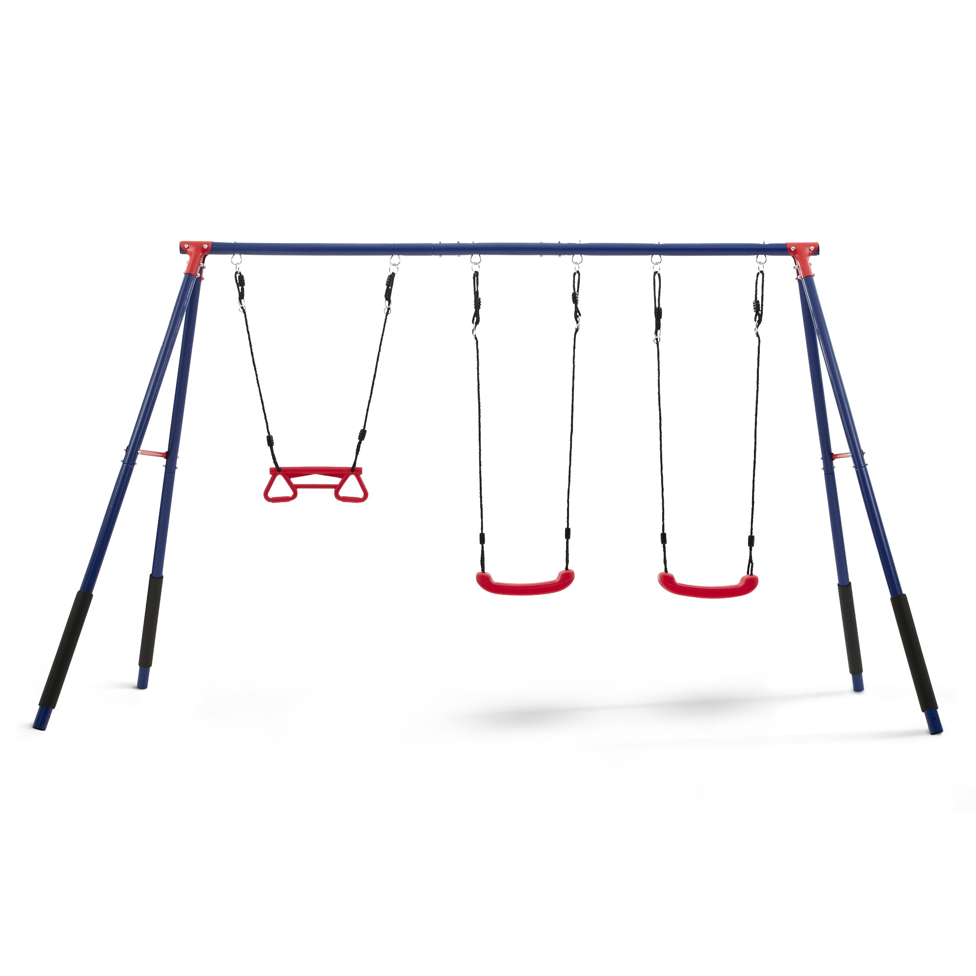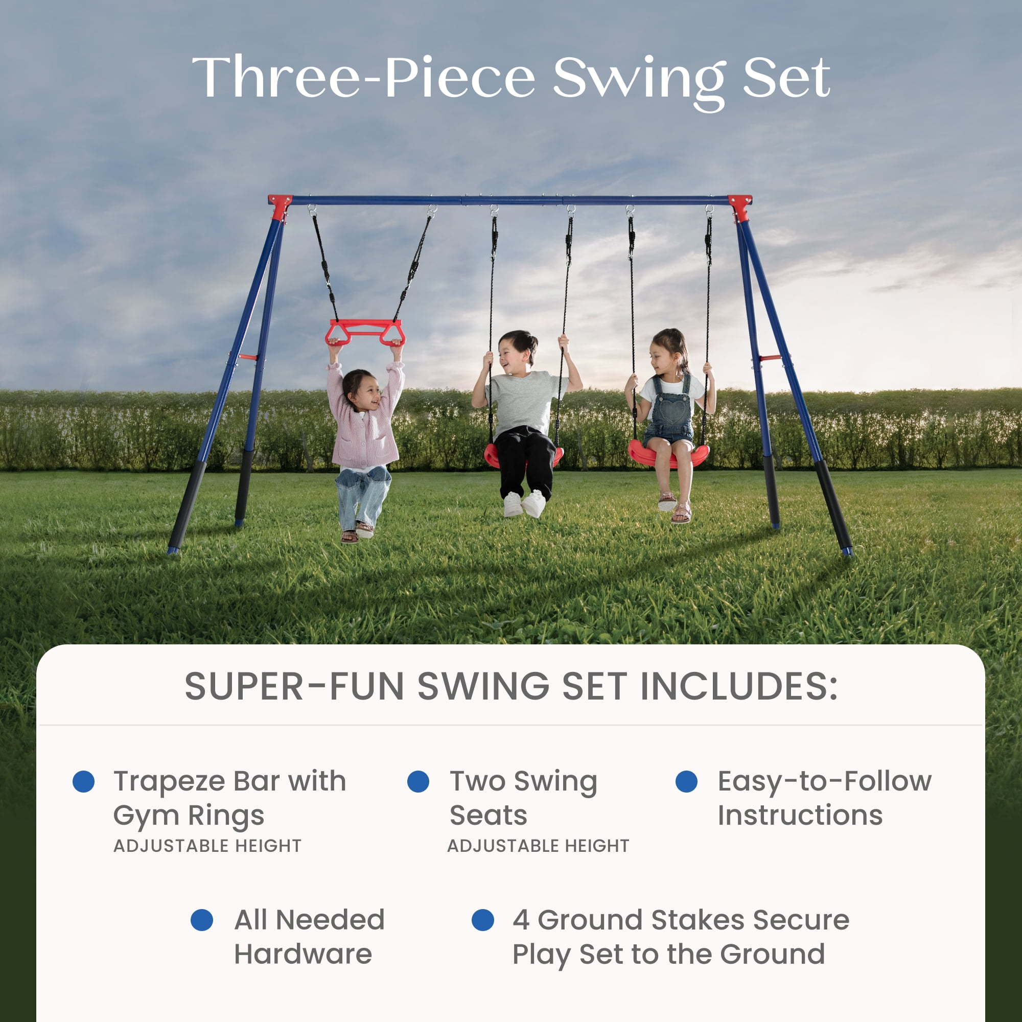 3-PIECE SWING SET: This durable metal swing set includes two adjustable height swings and a trapeze bar with gym rings | Endless fun for up to 3 children at once with multiple ways to play PROMOTES DEVELOPMENT: Swing sets help promote gross/fine motor skills, muscle growth and balance | Research shows outdoor play helps reduce stress and anxiety, improves mood, boosts creativity and imagination, and enhances attention span and focus DURABLE CONSTRUCTION: Frame features weather-resistant 2-inch steel tubes that are powder-coated to prevent corrosion, rust and weathering | Foam covered legs safeguard kids as they play| Pinch-proof rope attachments keep hands safe EASY SETUP: Setting up this swing set is a breeze with our easy-to-follow instructions | Swing set includes all essential hardware and 4 ground stakes for your convenience—everything you need is in the box! SIZE: Footprint dimensions: 144”W x 54”D x 70”H | Recommended for ages 3+ with a total weight capacity of 300 lbs. | Swing set meets or exceeds ASTM safety standards for residential playground equipment