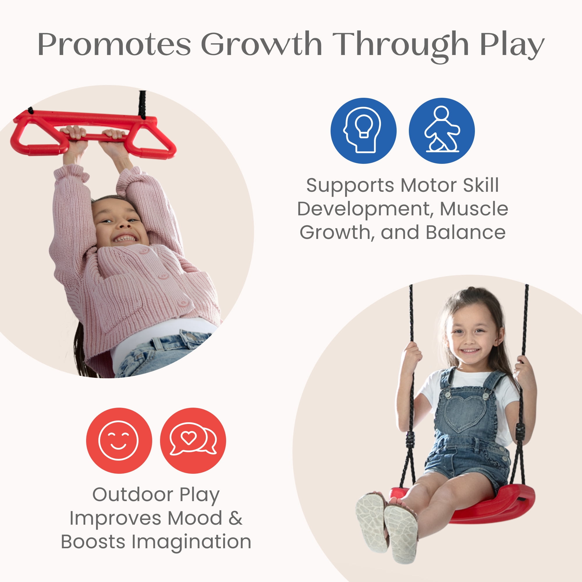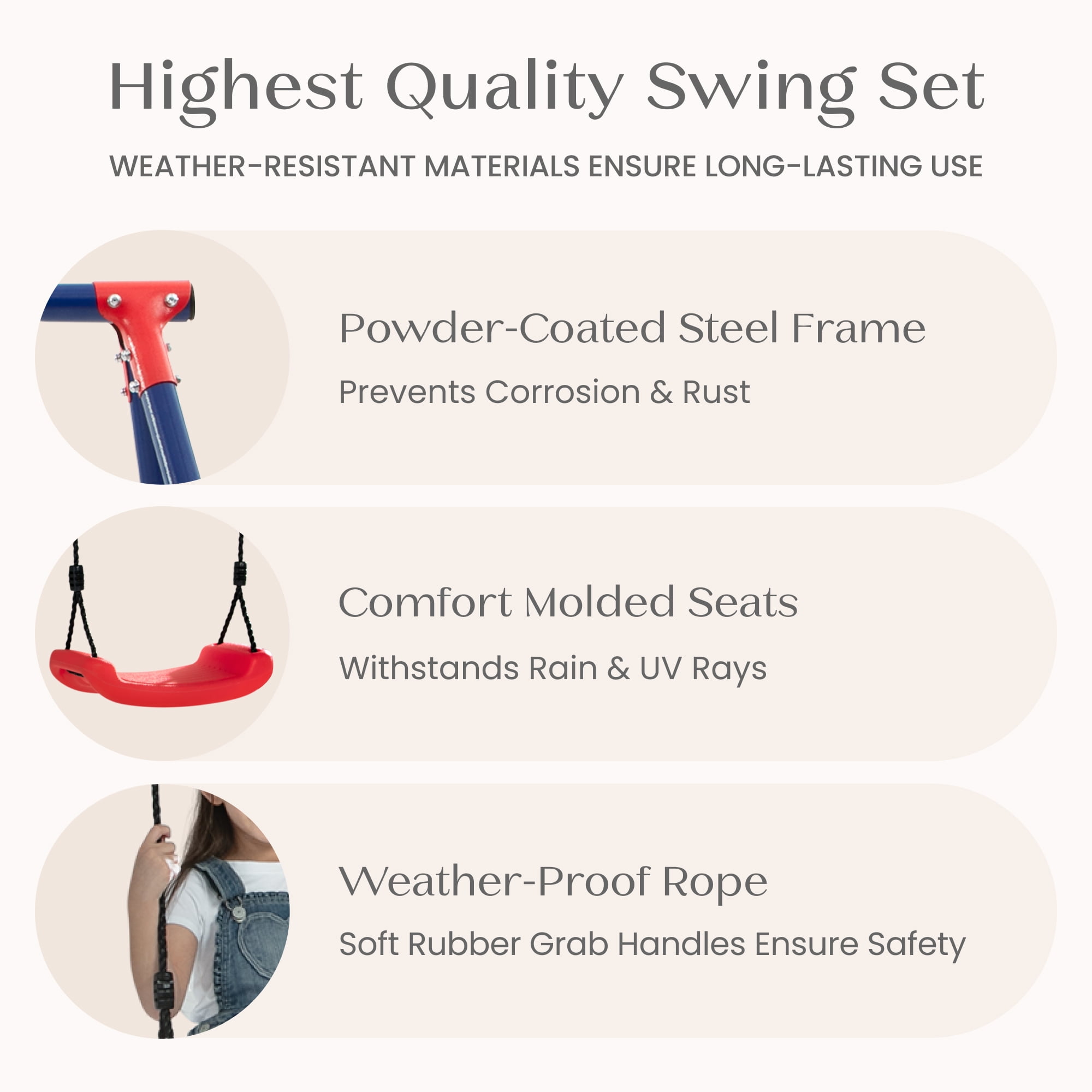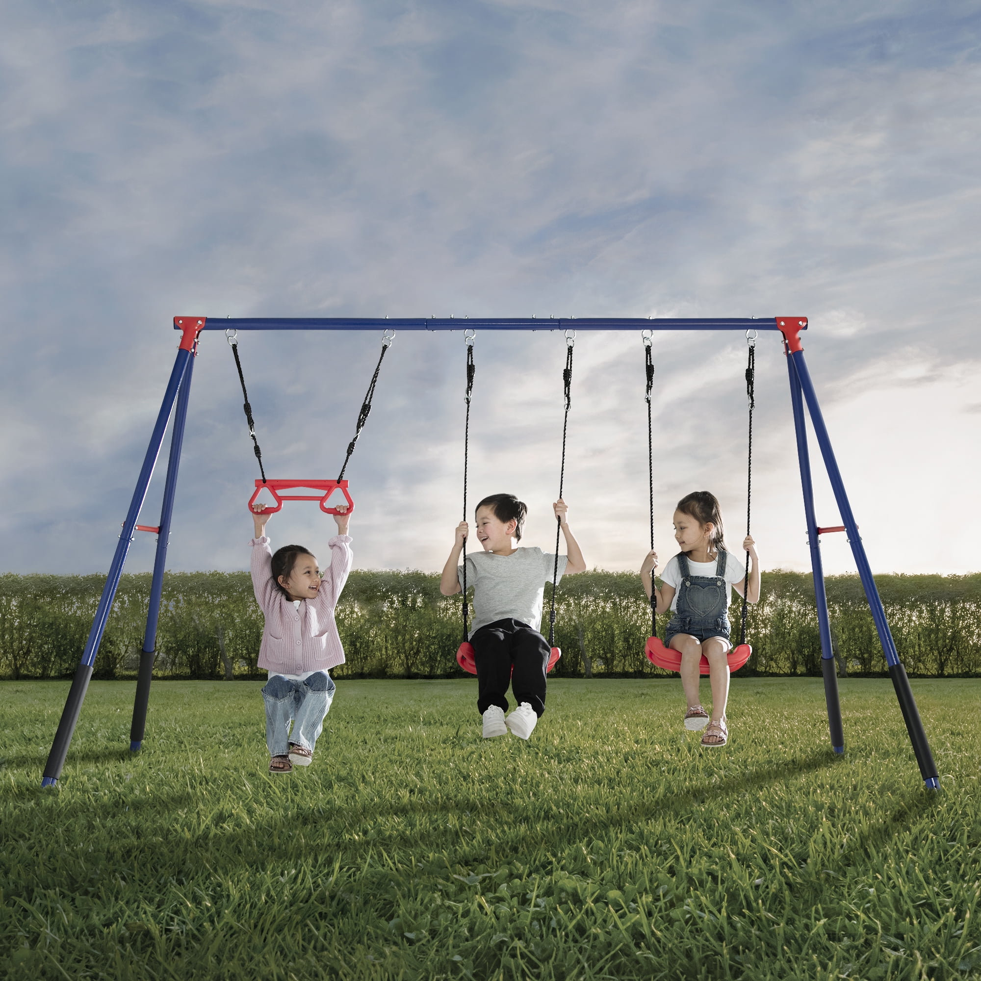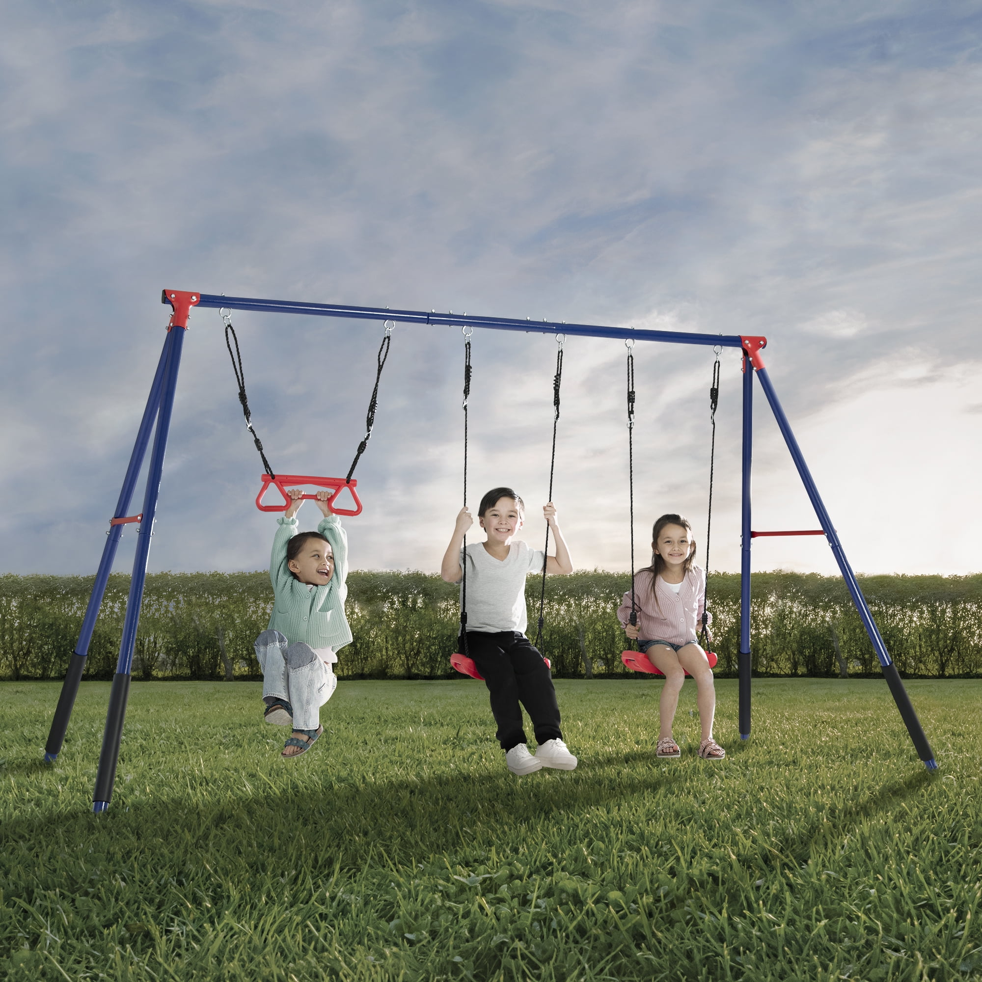 3-PIECE SWING SET: This durable metal swing set includes two adjustable height swings and a trapeze bar with gym rings | Endless fun for up to 3 children at once with multiple ways to play PROMOTES DEVELOPMENT: Swing sets help promote gross/fine motor skills, muscle growth and balance | Research shows outdoor play helps reduce stress and anxiety, improves mood, boosts creativity and imagination, and enhances attention span and focus DURABLE CONSTRUCTION: Frame features weather-resistant 2-inch steel tubes that are powder-coated to prevent corrosion, rust and weathering | Foam covered legs safeguard kids as they play| Pinch-proof rope attachments keep hands safe EASY SETUP: Setting up this swing set is a breeze with our easy-to-follow instructions | Swing set includes all essential hardware and 4 ground stakes for your convenience—everything you need is in the box! SIZE: Footprint dimensions: 144”W x 54”D x 70”H | Recommended for ages 3+ with a total weight capacity of 300 lbs. | Swing set meets or exceeds ASTM safety standards for residential playground equipment