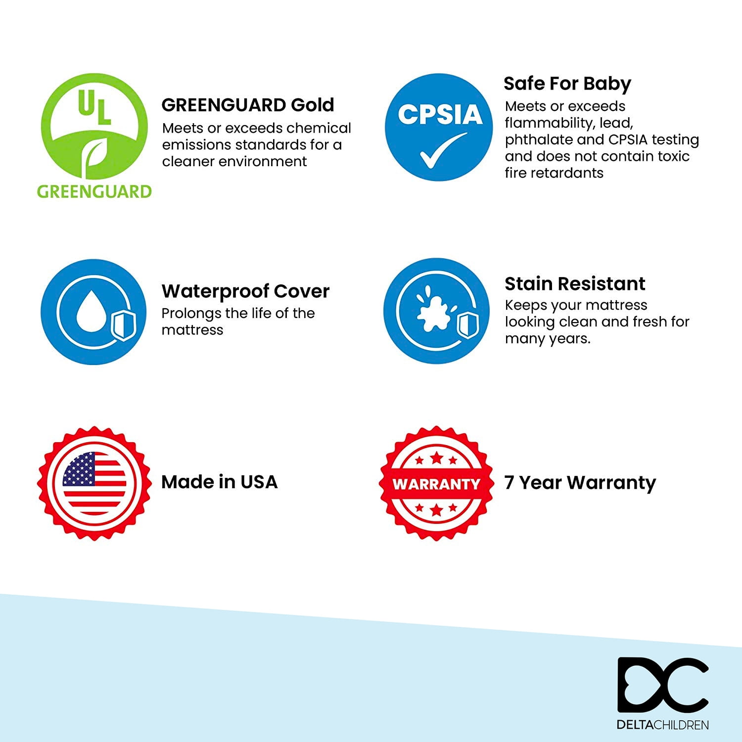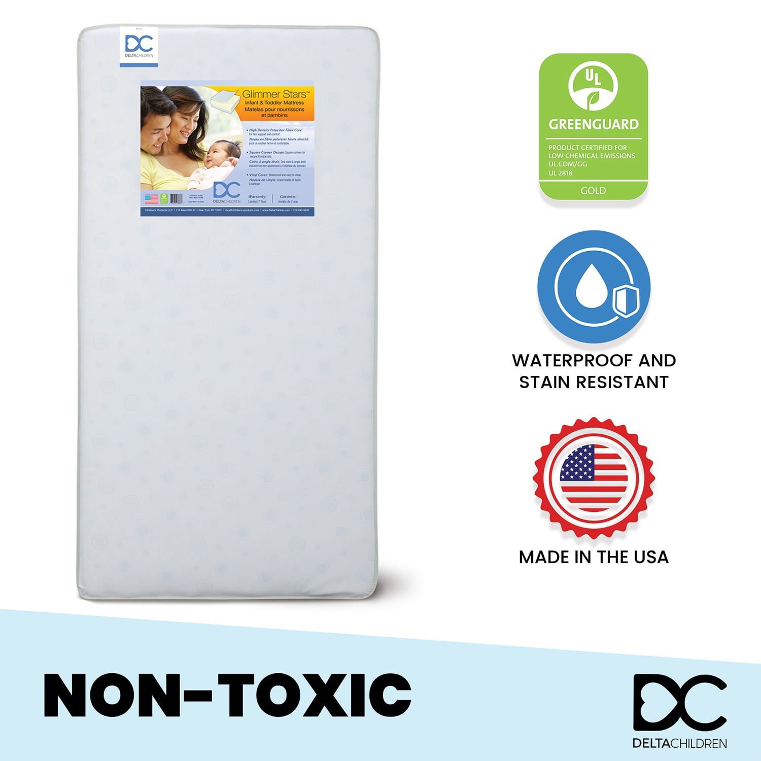 Delta Children Glimmer Stars Crib and Toddler Mattress: Firm thermo-bonded polyester fiber core Lightweight for easy changing Square corners help for secure fit inside crib Durable, laminated vinyl cover GREENGUARD Gold certified: recognizes products with low chemical emissions, contributing to healthier environments Meets or exceeds flammability, lead, phthalate and CPSIA testing and does not contain toxic fire retardants Dimensions: 52”L x 27.5″W x Questions about product recalls? Items that are a part of a recall are removed from the site, and are no longer available for purchase. These items include items only, not those of Marketplace sellers. Customers who have purchased a recalled item will be notified by email or by letter sent to the address given at the time of purchase. For complete recall information, go to Recalls.