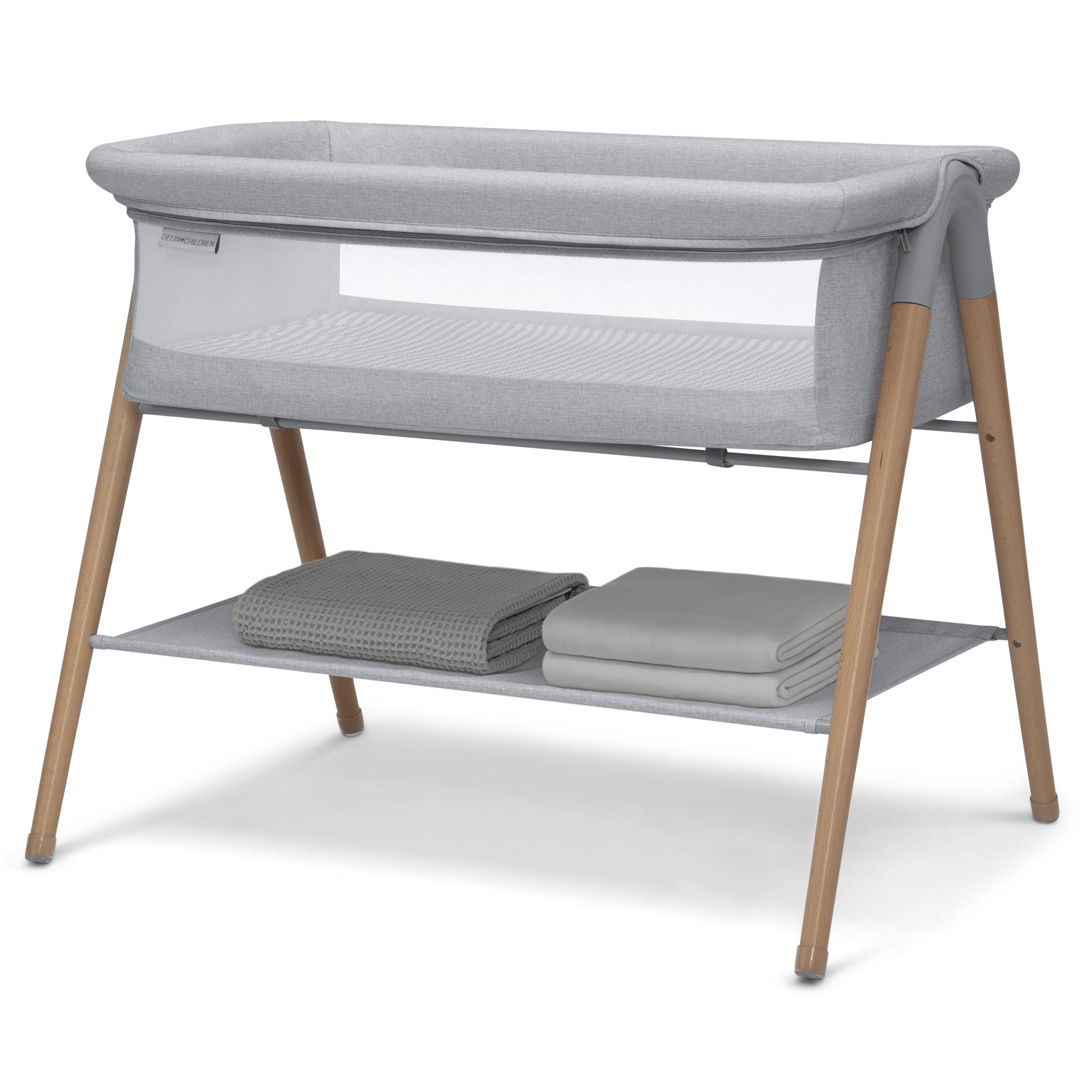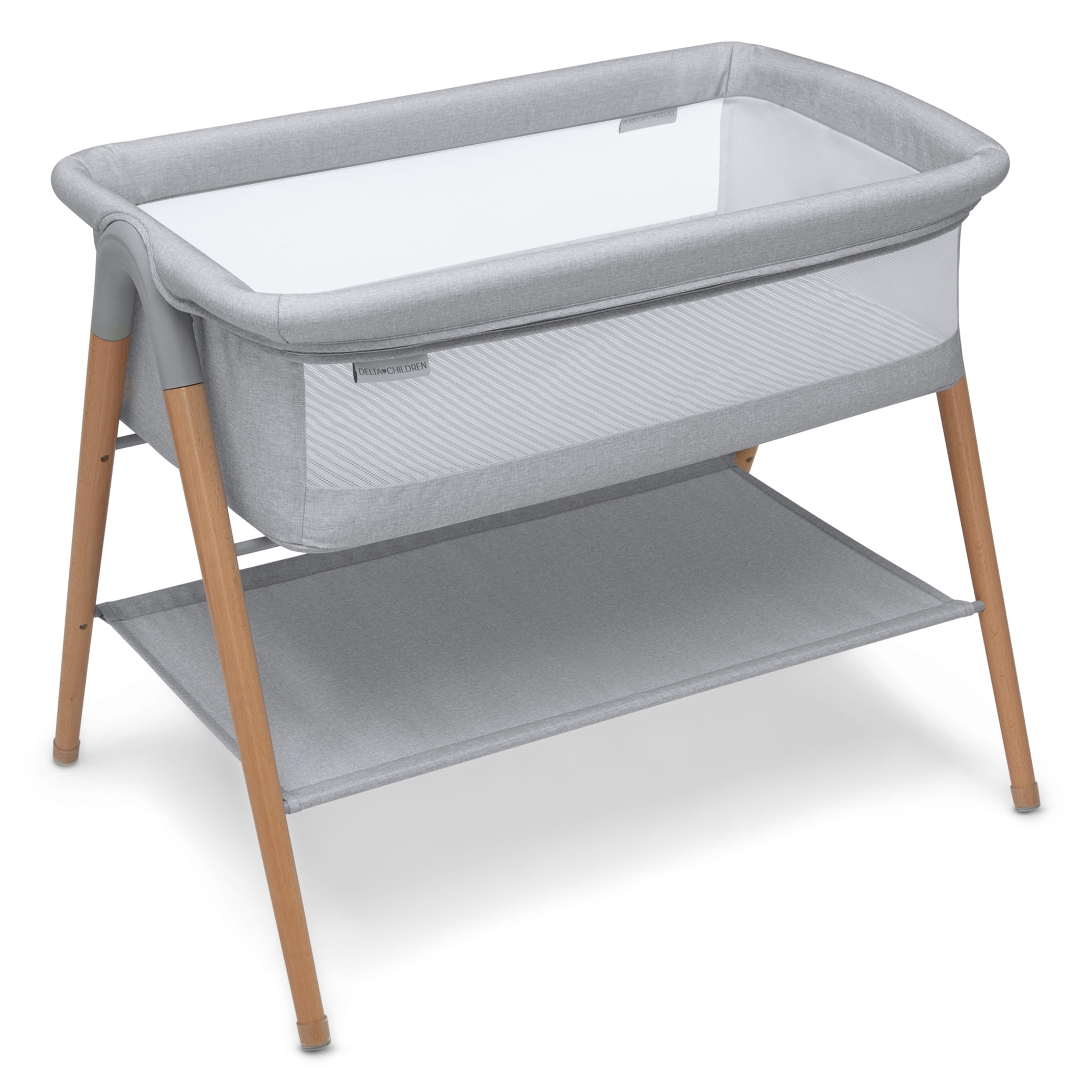 Delta Children Haven Beechwood by the Bed Bassinet with Breathable Mesh and Natural Beechwood Legs, Grey Stripe