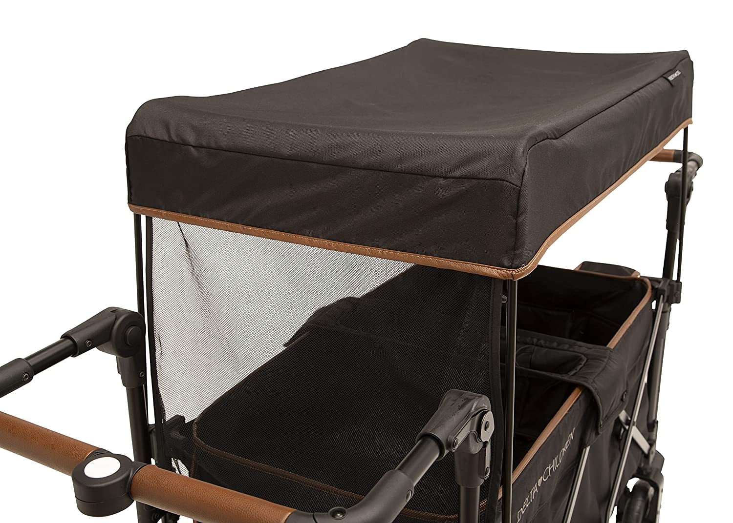 Mesh,LARGE CAPACITY: This stroller wagon fits 2 children , Holds up to 110 lbs. (55 lbs. per seat) , Recommended for ages 9 months up to 55 lbs. (child must be able to sit up unassisted before use) EASY TO DRIVE: Large, 8-inch wheels made from puncture-proof EVA airless foam make rough terrain or sandy beaches a breeze for this wagon , Swivel front wheels with brakes allow you to effortlessly turn and pivot ALL-WEATHER USE: Durable, weather-resistant fabric and rust-resistant steel frame makes this wagon suitable for any outdoor occasion , Removable UV blocking canopy, solid and mesh roll-down shades offer privacy and protects kids from the sun or rain TONS OF STORAGE: Removable center console with 2 cup holders and storage pocket allows kids to share snacks, toys and drinks , Outside pockets and parent cup holder provide extra storage , Compact fold for easy transport/storage PULL/PUSH HANDLES: Push/pull handlebars feature several height positions , Stroller certified and thoroughly tested , Features cushioned seats with 3-point safety harnesses , Assembled size: 51.2″L x 19.5″D x 44″H , Folded size: 16.”L x 12.6″D x 31.5″H , Weighs 36.3 lbs.