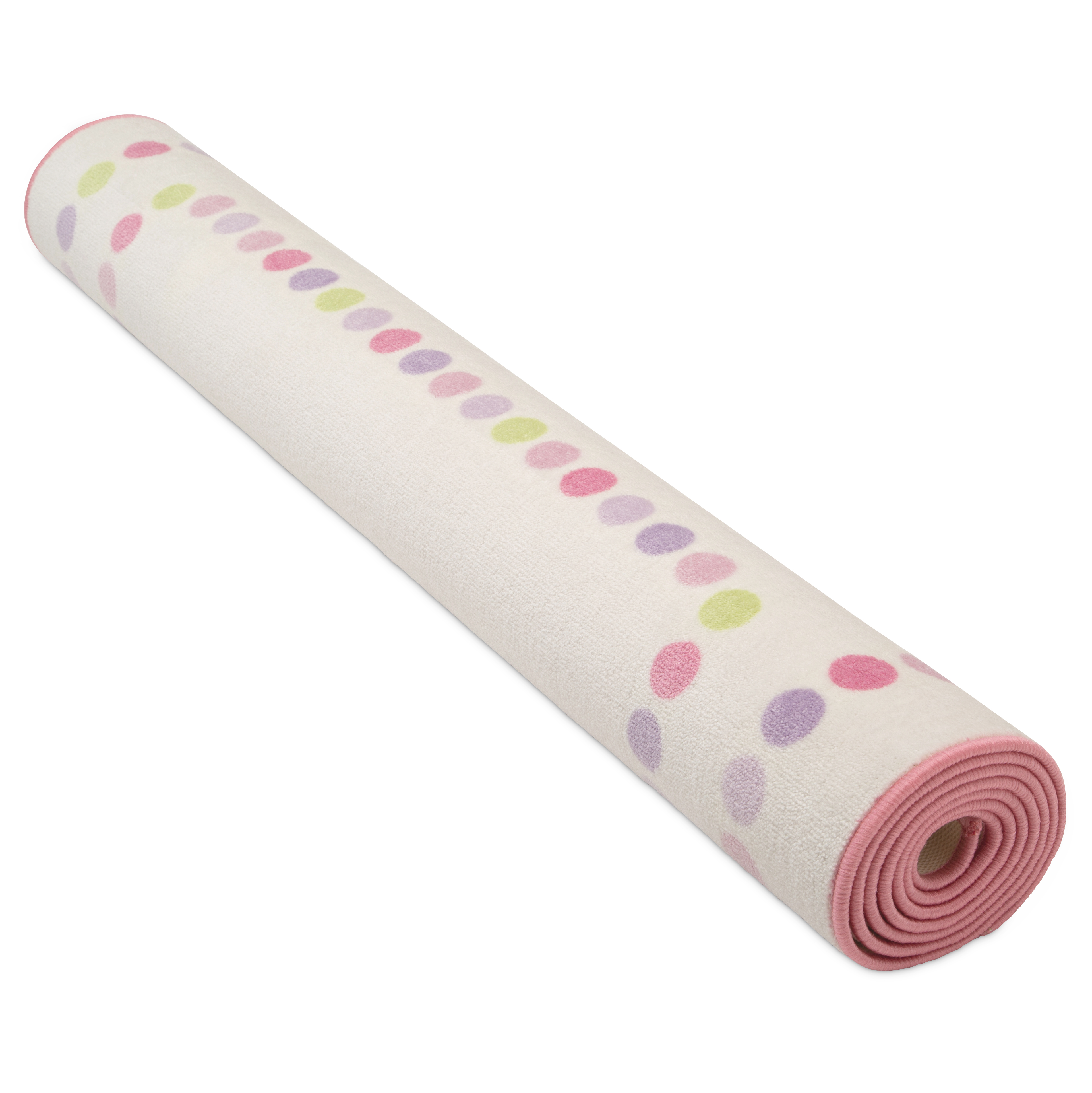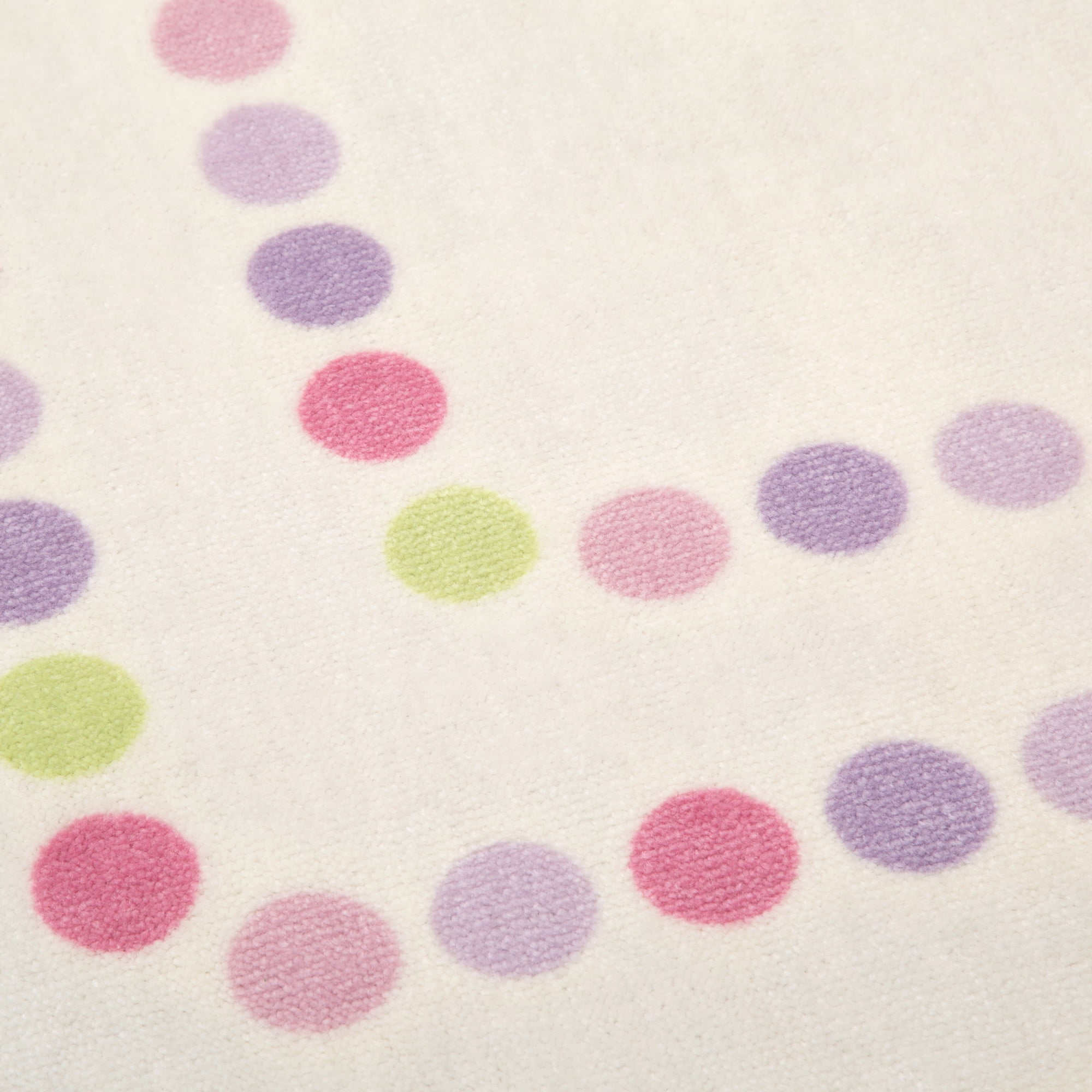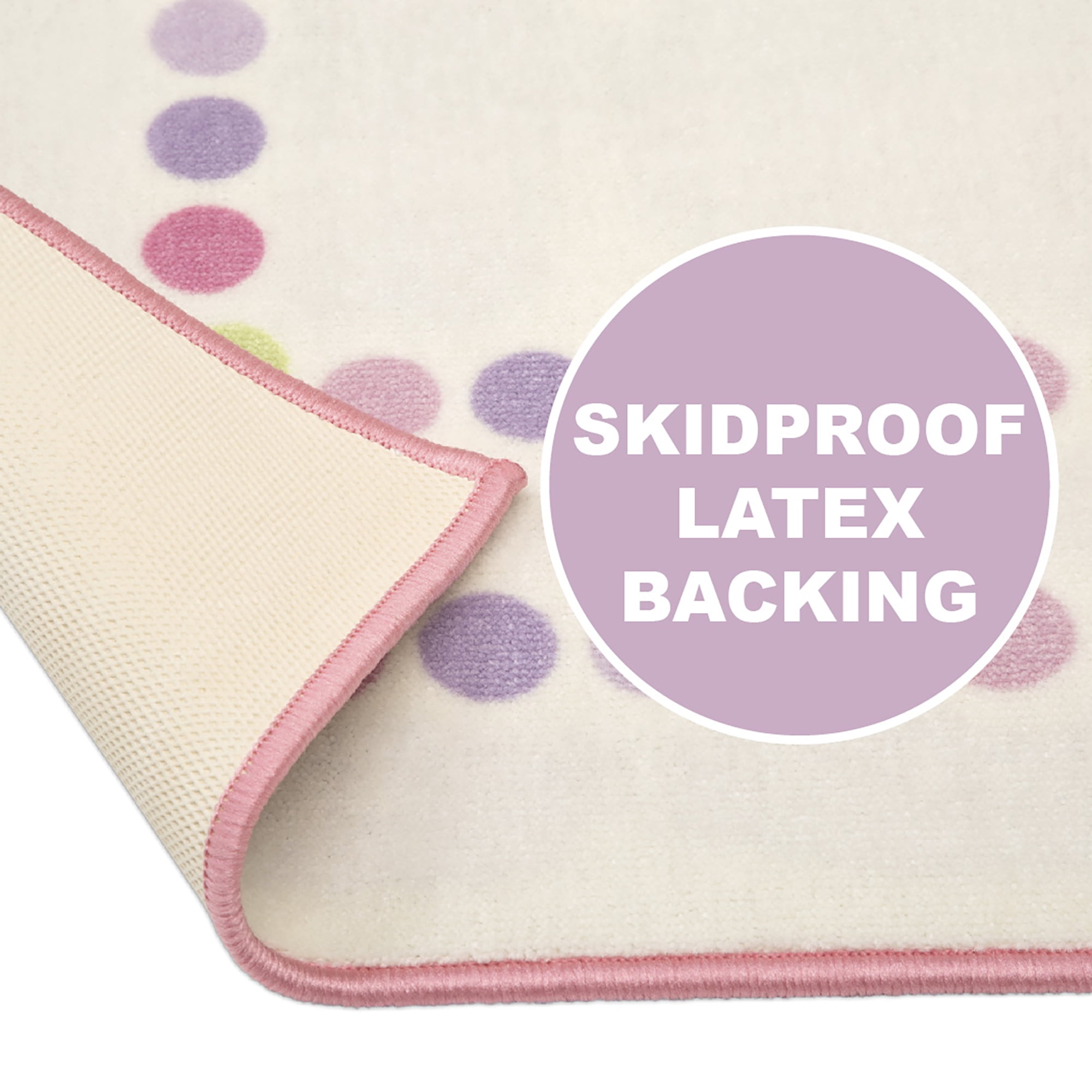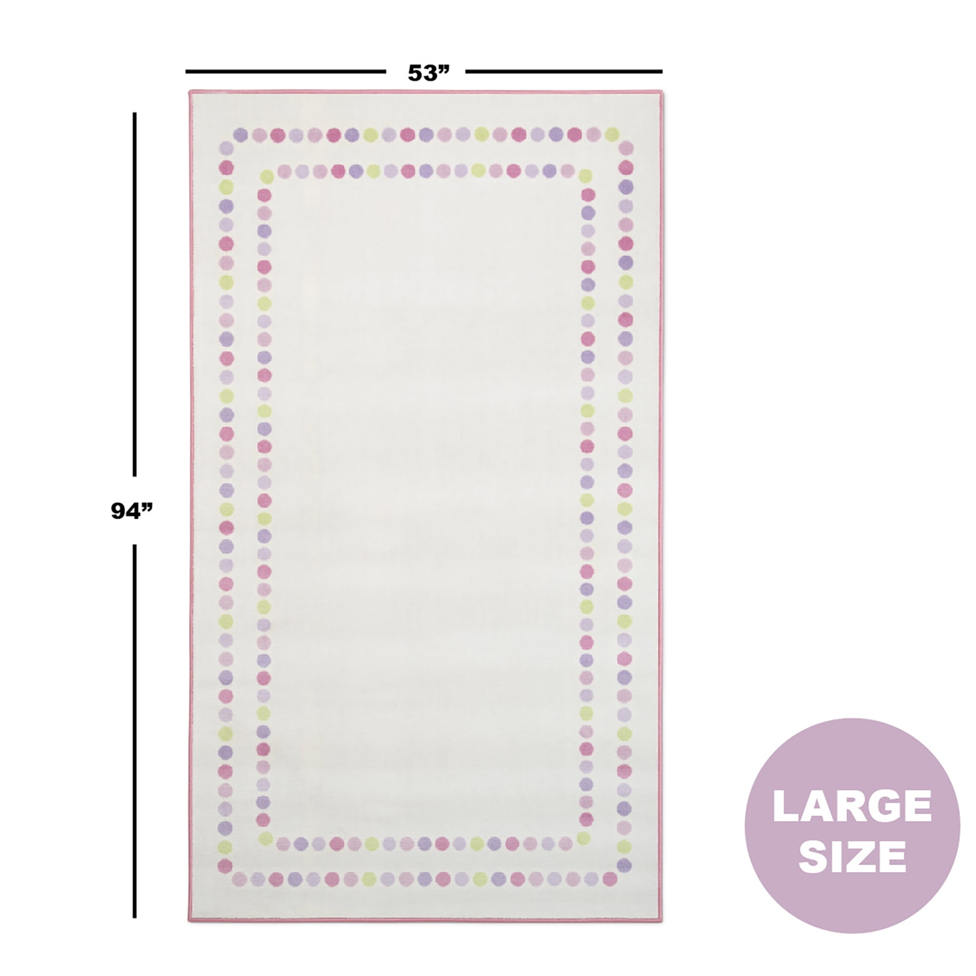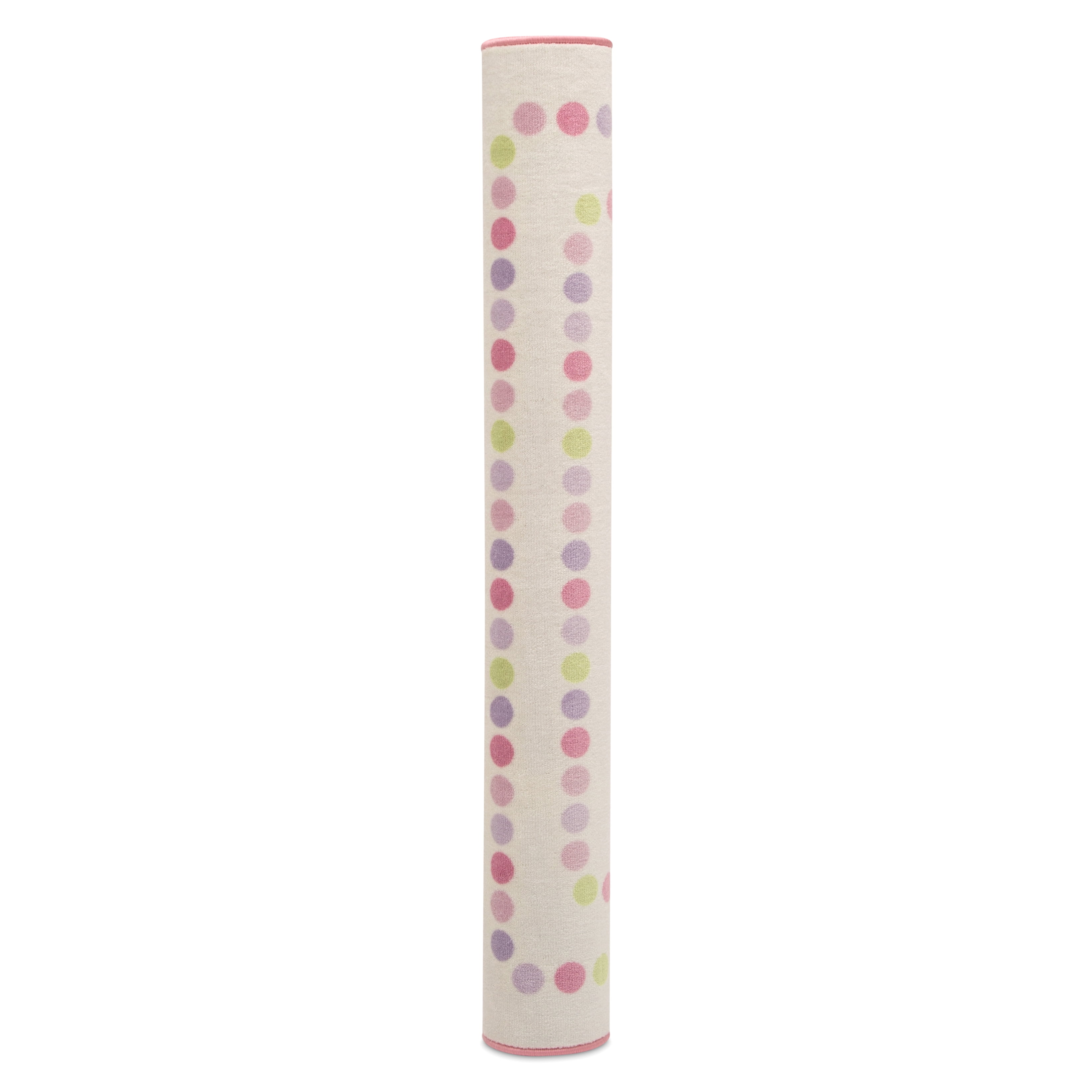 ADORABLE PRINT: A great option for your child’s bedroom or playroom, this rug features a double row of polka dots in fun pastel colors around the border SOFT & DURABLE: This area rug is made from soft and durable non-shedding materials, plus features a reinforced border, The rug’s non-slip backing makes it the perfect option for hard surfaced areas like tiles, wood, stone and laminate IDEAL FOR ANY ROOM IN THE HOUSE: Have fun in any room in the house with this rug that rolls up for easy storage, Perfect for playrooms, game rooms, bedrooms, living rooms, nurseries, day cares and classrooms PERFECT SIZE: 53-Inch x 59-Inch, Plush construction is easy to maintain and great for high-traffic areas EASY TO CLEAN: Vacuum regularly and/or shake to remove dust