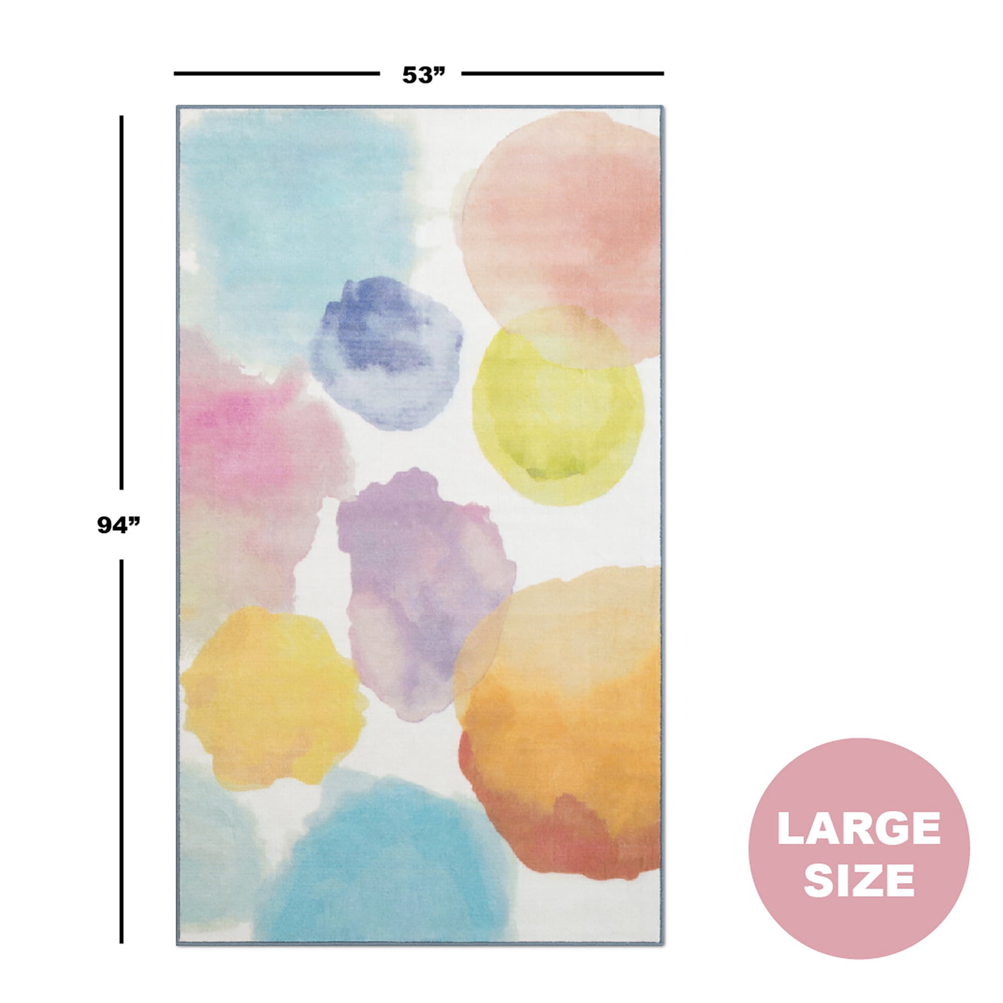 ADORABLE PRINT: A great option for your child’s bedroom or playroom, this rug features a colorful watercolor pattern SOFT & DURABLE: This area rug is made from soft and durable non-shedding materials, plus features a reinforced border, The rug’s non-slip backing makes it the perfect option for hard surfaced areas like tiles, wood, stone and laminate IDEAL FOR ANY ROOM IN THE HOUSE: Have fun in any room in the house with this rug that rolls up for easy storage, Perfect for playrooms, game rooms, bedrooms, living rooms, nurseries, day cares and classrooms PERFECT SIZE: 53-Inch x 59-Inch, Plush construction is easy to maintain and great for high-traffic areas EASY TO CLEAN: Vacuum regularly and/or shake to remove dust