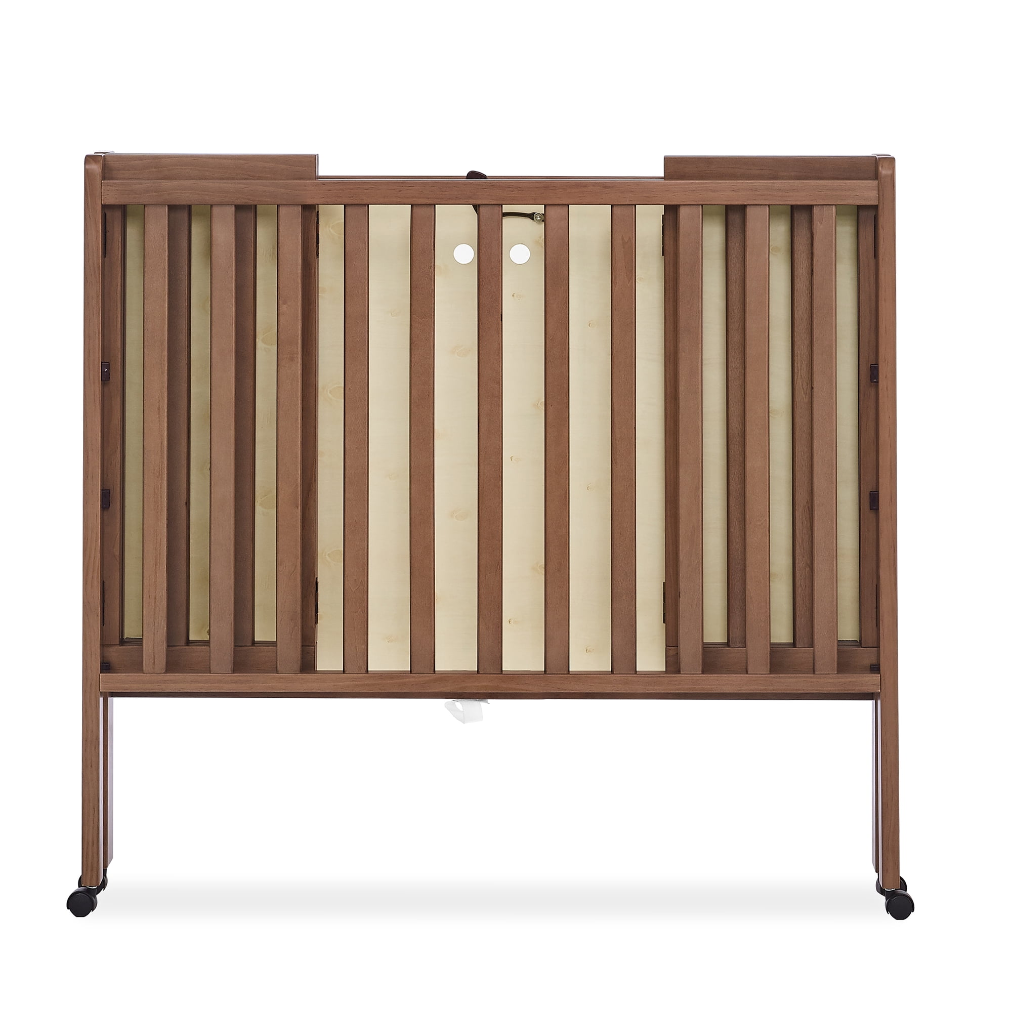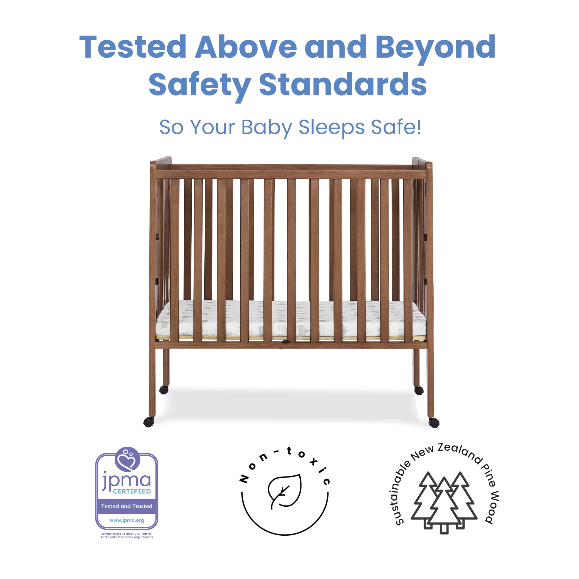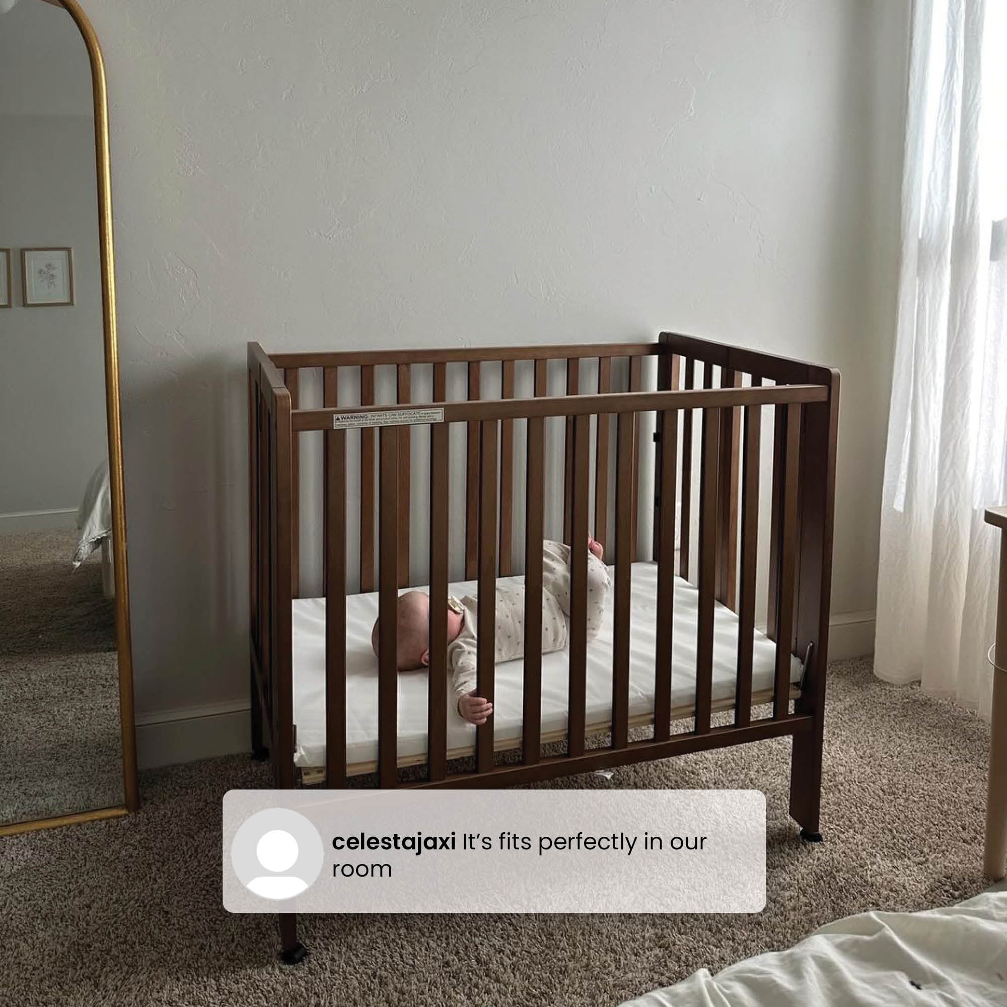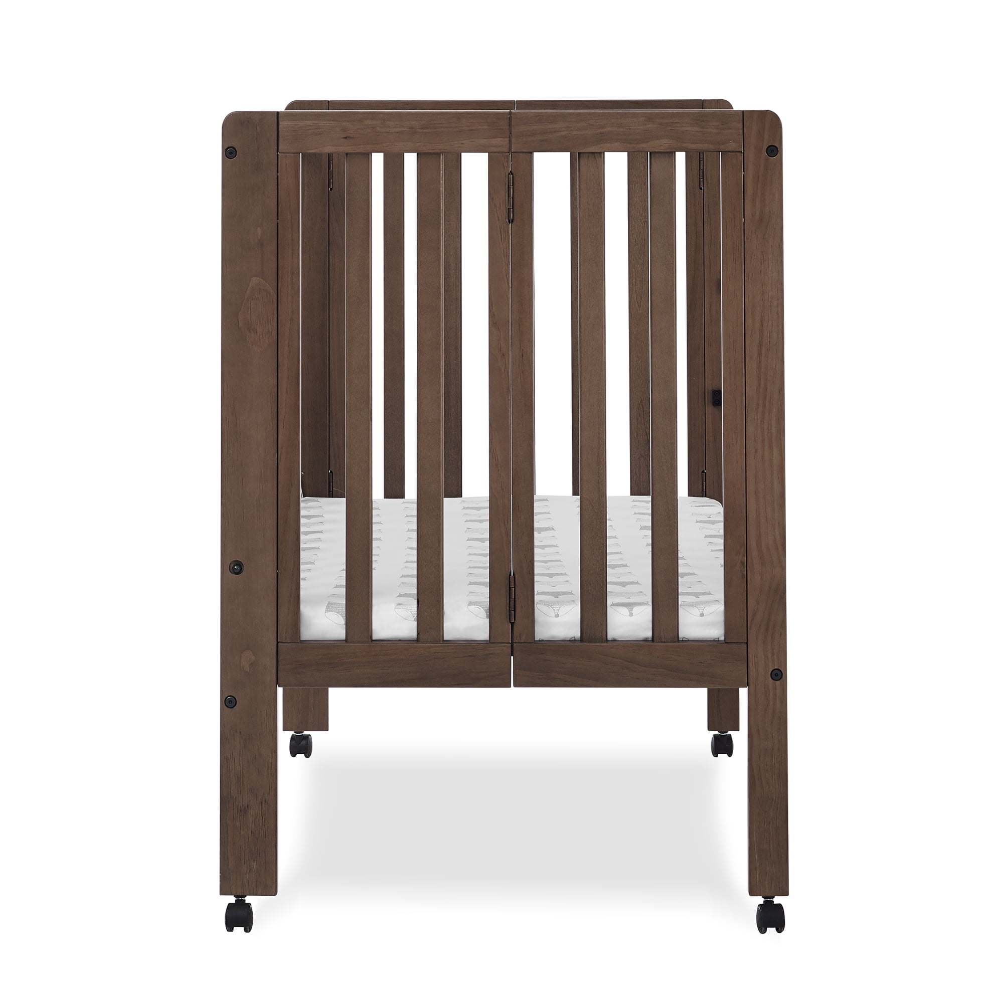 PORTABLE FOLDING CRIB: Small footprint is great for small spaces, shared bedrooms or overnight trips | Crib easily folds up for storage or transport| Crib includes 4 wheels for easy movement around the house COMFY MATTRESS INCLUDED: This mini crib includes a 1.5-Inch-thick mini crib mattress that is extremely comfortable and water-resistant; mattress uses 24″ x 38″ size sheets GREENGUARD GOLD CERTIFIED: This crib meets the most stringent chemical emissions standards to create a healthier home for your child. Tested for more than 10,000 chemicals and VOCs, this crib is certified to contribute to cleaner indoor air COORDINATING ITEMS: Pair this mini crib with any Delta Children Dressers or Changing Tables in the same colors | Crib is available in Bianca White, Grey, Chestnut and Black SAFE OPTION FOR YOUR BABY: This crib is JPMA certified to meet or exceed all safety standards set by the CPSC ASTM | We know chemicals have no place in your nursery, so we use a non-toxic, baby-safe painting process that is lead and phthalate safe ADJUSTABLE HEIGHT: Adjustable height mattress support with 2 convenient positions to grow with your baby | ACCESS RAIL DIMENSIONS: From Floor: 35.25″H; From Top Mattress Support Position: 14.25″H; From Bottom Mattress Support Position: 22.75″H QUALITY MATERIAL: Made of sustainable materials like New Zealand pine, poplar and TSCA compliant engineered wood | Tested for lead and other toxic elements to meet or exceed government and ASTM safety standards SIZE: Assembled dimensions: 39″W x 25″D x 36.25″H | Folded Dimensions: 39″W x 6.25″D x 36.25″H | Mattress dimensions: 37.5”W x 23.25”D x 1.5”H