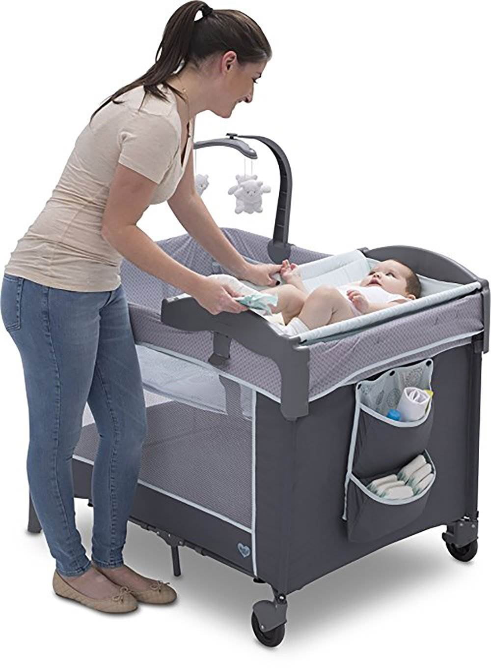 RECOMMENDED USE: Deluxe Play Yard features a removable full size bassinet and changing table Bassinet holds up to 15 pounds Changing Table holds up to 25 pounds Play Yard holds children up to 35 Inches tall,FUN FOR BABY, EASY FOR YOU: Removable mobile arm with hanging plush toys engages early visual development Removable changing table station features waterproof surface Snap on hanging storage compartment for diapers, wipes and other toiletries,TRAVEL FRIENDLY: Quick and compact fold Includes carrying bag for fuss free travel or storage Easy to pack Great mini crib alternative Two wheels allow for easy movement from room to room Easy to assemble no tools required,SIZE: Assembled dimensions: 27.75 x 37.4 x 40.2 Inches (LxWxH),YOUR BABY S SAFETY IS OUR FIRST PRIORITY: JPMA certified to meet or exceed all safety standards set by the CPSC & ASTM