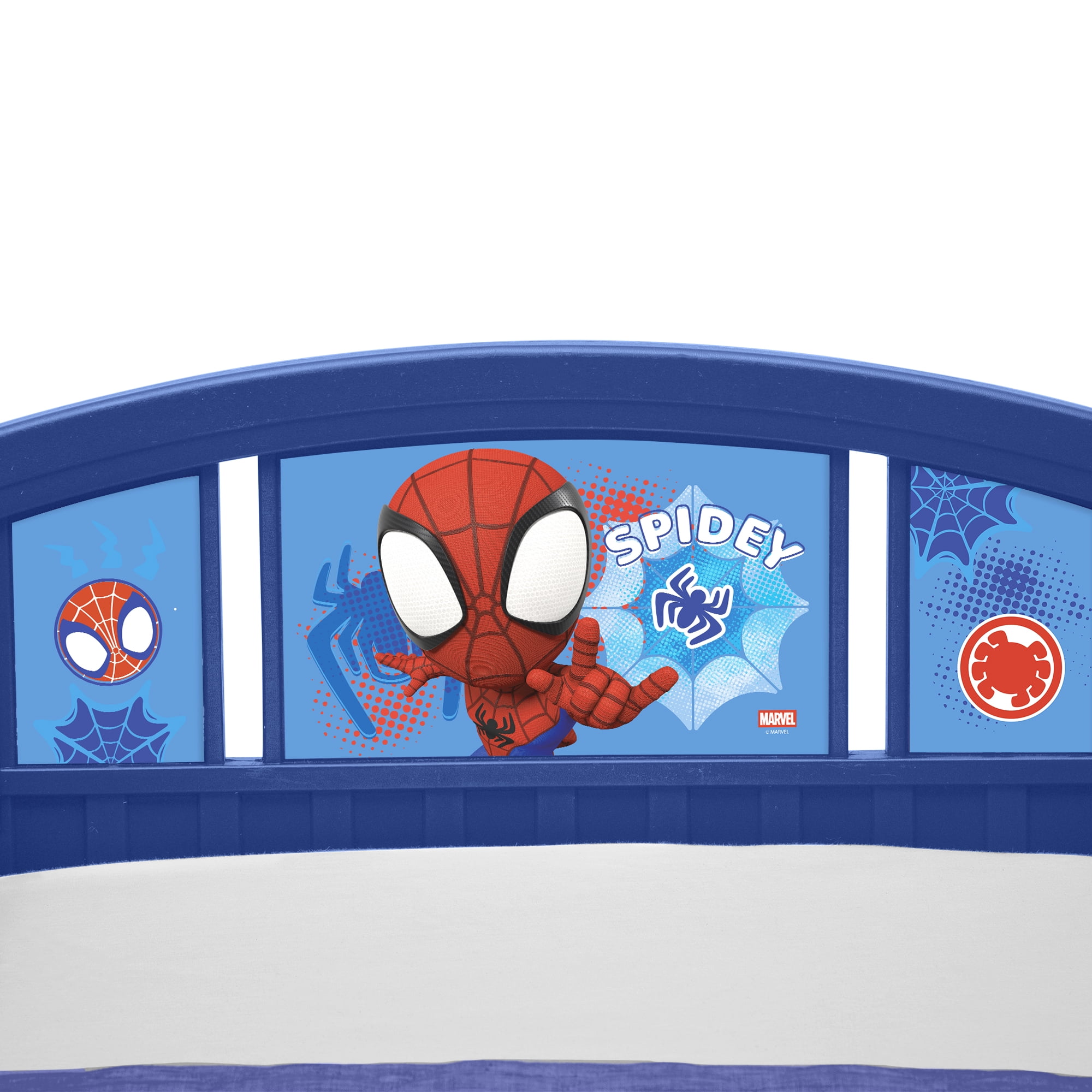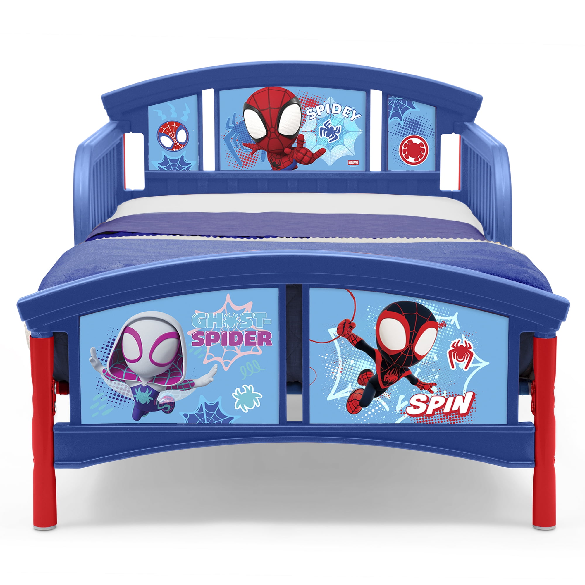Delta Children Marvel Spider-Man Plastic Toddler Bed, Blue Attached guard rails Sturdy steel frame Recommended for ages 15 months and up Holds up to 50 lbs. Assembled dimensions: 53.94″ L x 29.13″ W x 26.18″ H Easy to assemble Mattress sold separately Spider-Man blue toddler bed has decals on the headboard and footboard featuring several characters from the series Fits any standard crib mattress High-quality plastic construction