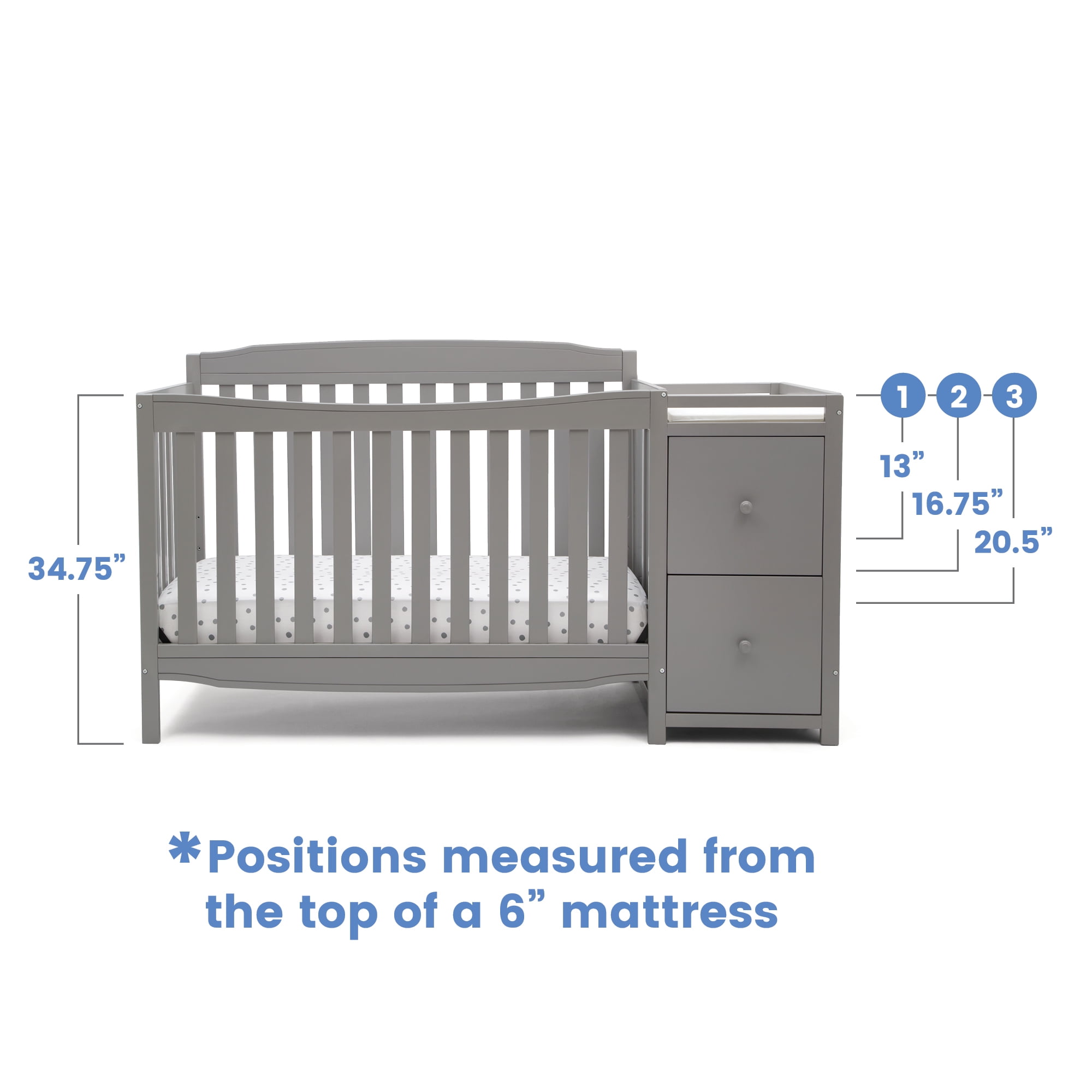 Crib converts to a toddler bed, daybed, sofa, full-size bed with headboard and footboard, and a full-size bed with headboard only (Daybed/Sofa Rail included, toddler guardrail #0094, Full-Size Bed Rails #0050 or Full-Size Metal Bed Frame #0040 sold separately) Available in three popular finishes, Grey, Bianca White, and Dark Chocolate Adjustable height mattress support with 3 convenient positions to grow with your baby Uses a standard size crib mattress (sold separately) Assembled Dimensions: 71.25″ W x 30.75″ D x 40.75″ H Easy to assemble Two Drawers with inside dimensions of 13″W x 13.25″D x 6.5″H JPMA Certified to meet or exceed all safety standards set by the CPSC & ASTM Tested for lead and other toxic elements to meet or exceed government and ASTM safety standards