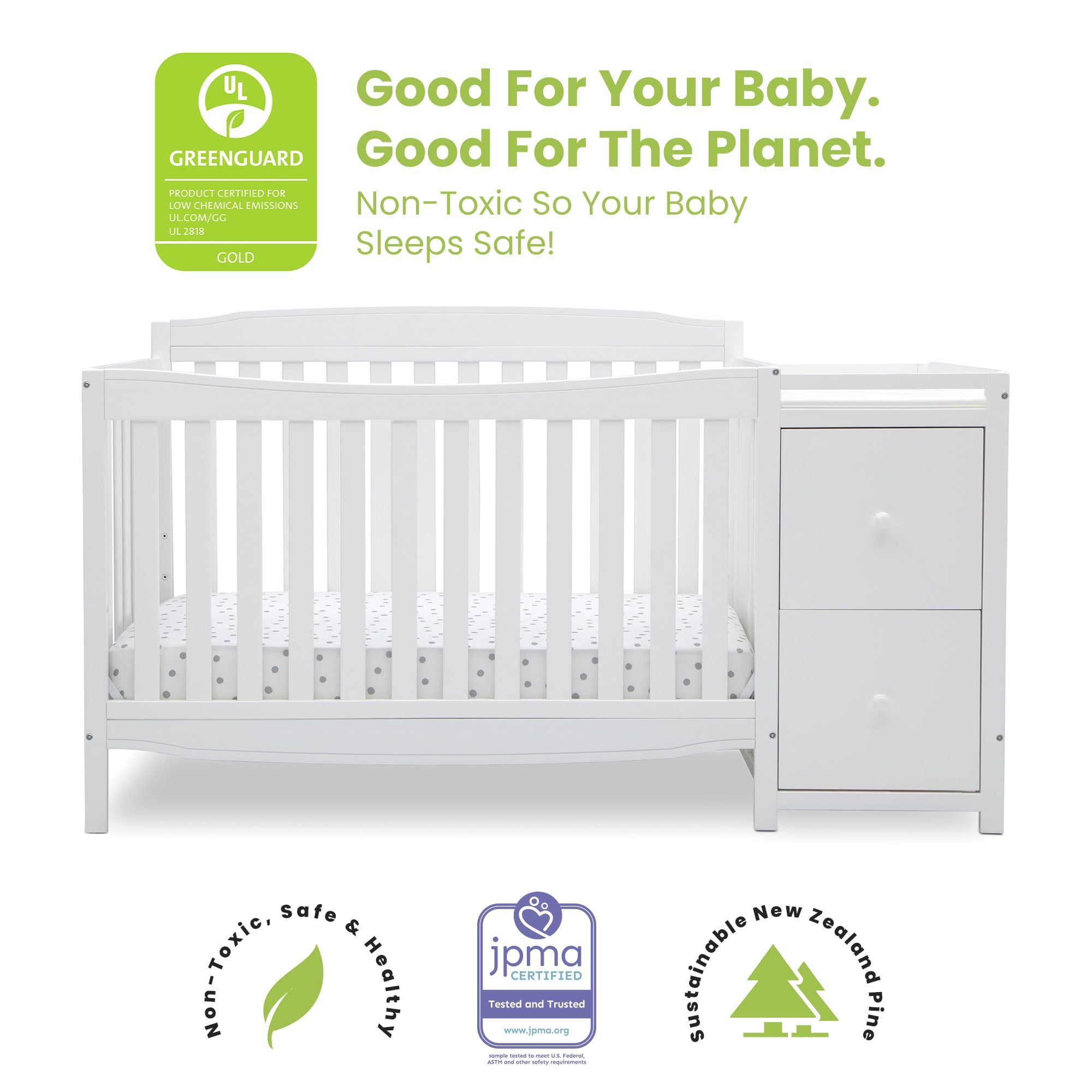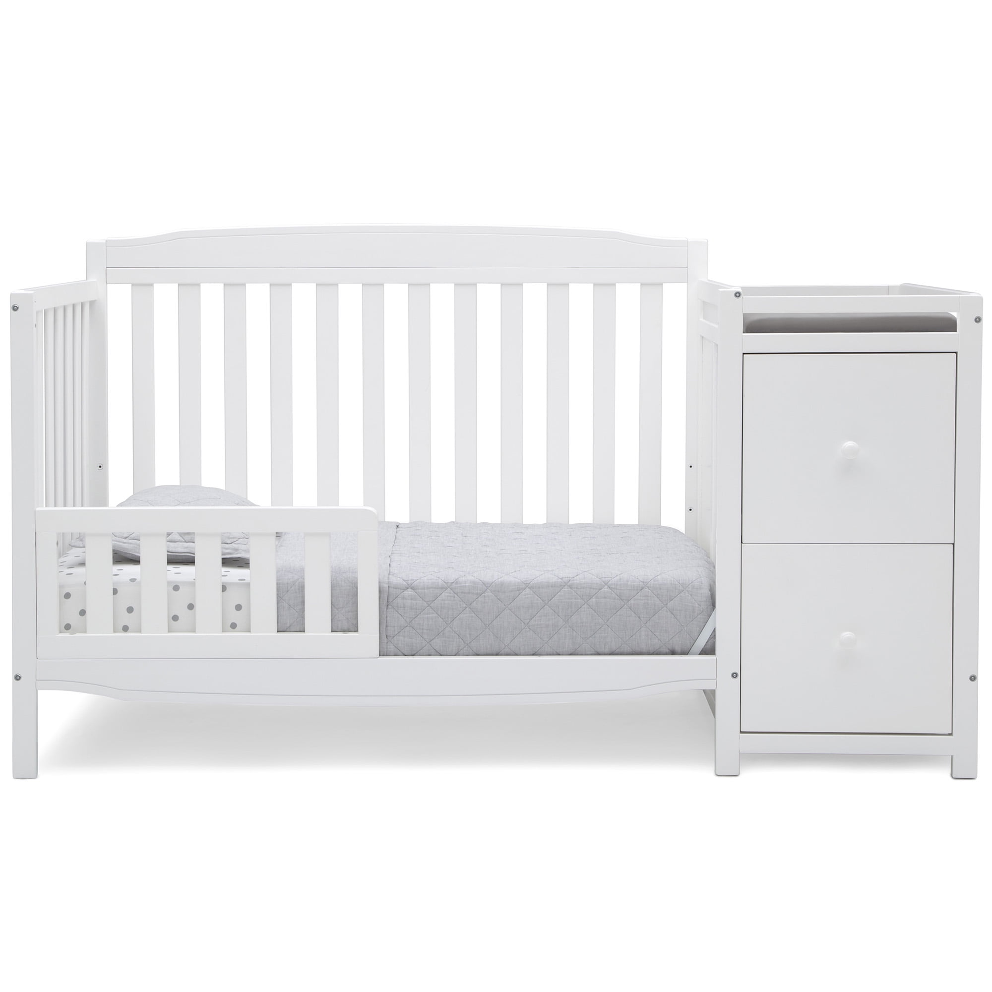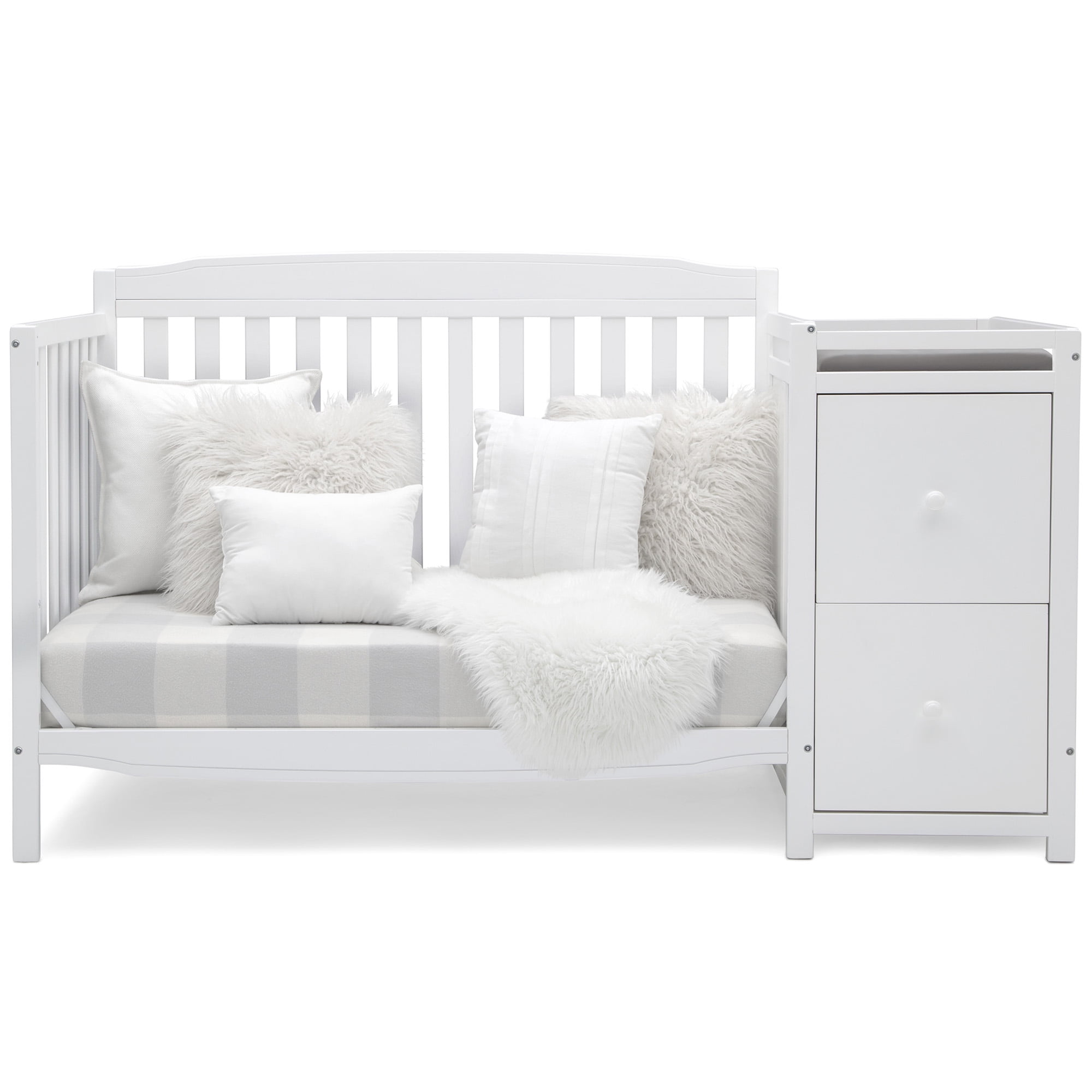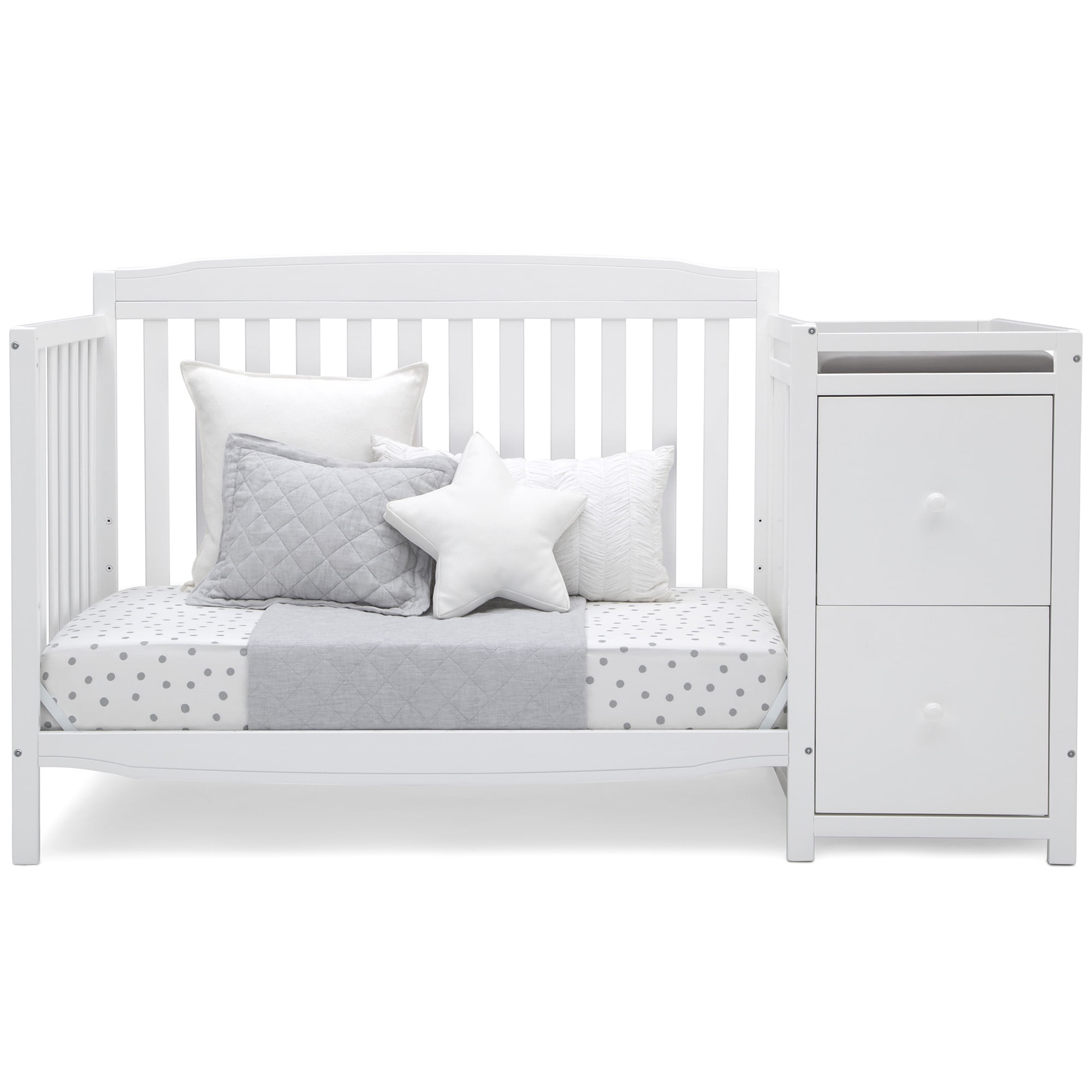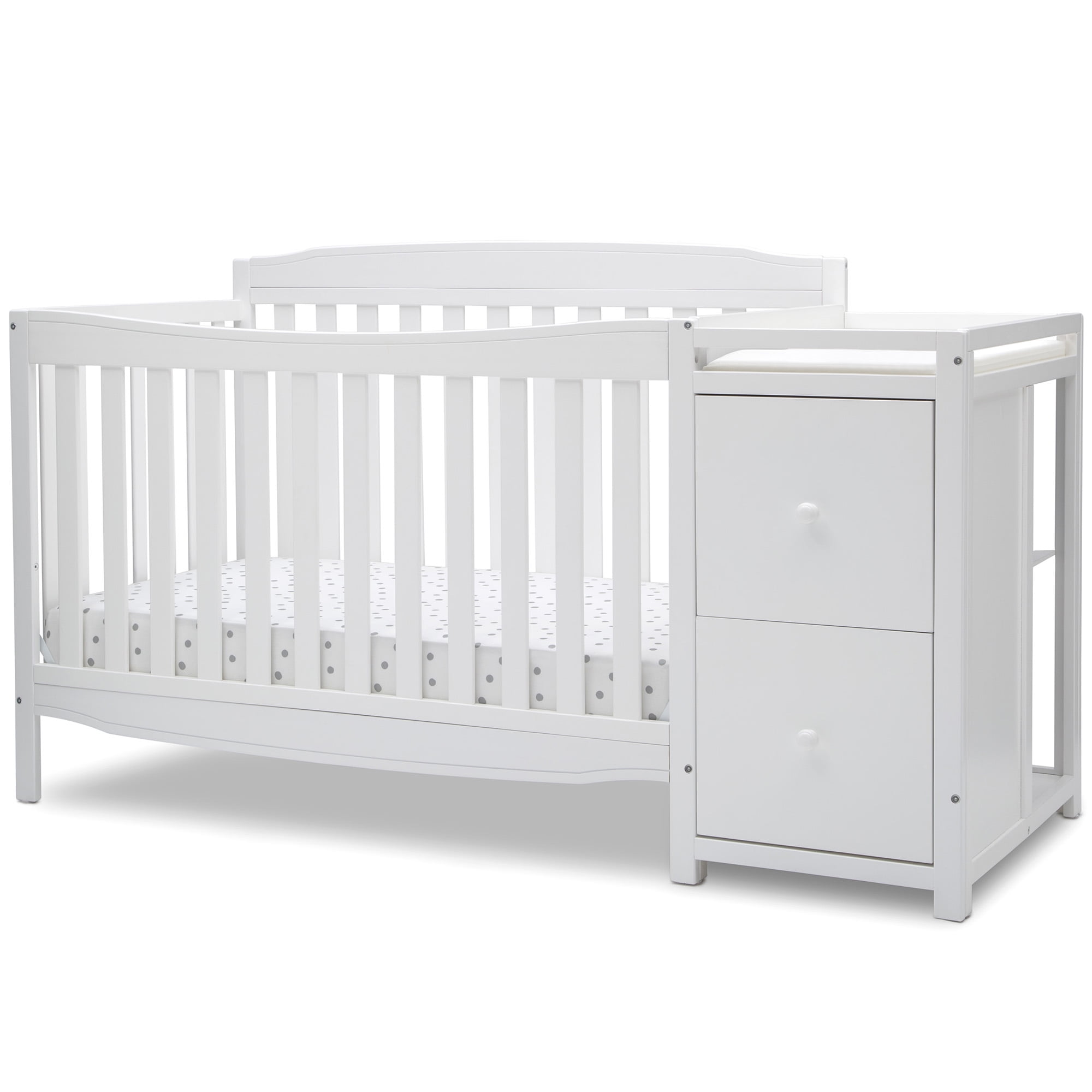 The Mason Convertible 6-in-1 crib and changer from Delta Children combines style and storage to create the perfect space-saving baby crib and changing table combo. A versatile option for those who need multi-functional nursery furniture, the Mason provides all the elements needed to create the ultimate nursery without taking up a lot of floor space. Built to accommodate every stage of your child’s life, this crib features three mattress height positions that can be easily lowered as your baby begins to sit or stand. Plus, this crib converts into a toddler bed, daybed, sofa, full-size bed with headboard only, and full-size bed with headboard and footboard. The secure changing table section includes a changing pad on top, then underneath two drawers and an open cubby space to help keep your baby essentials close at hand. Everything you need to furnish your nursery.
