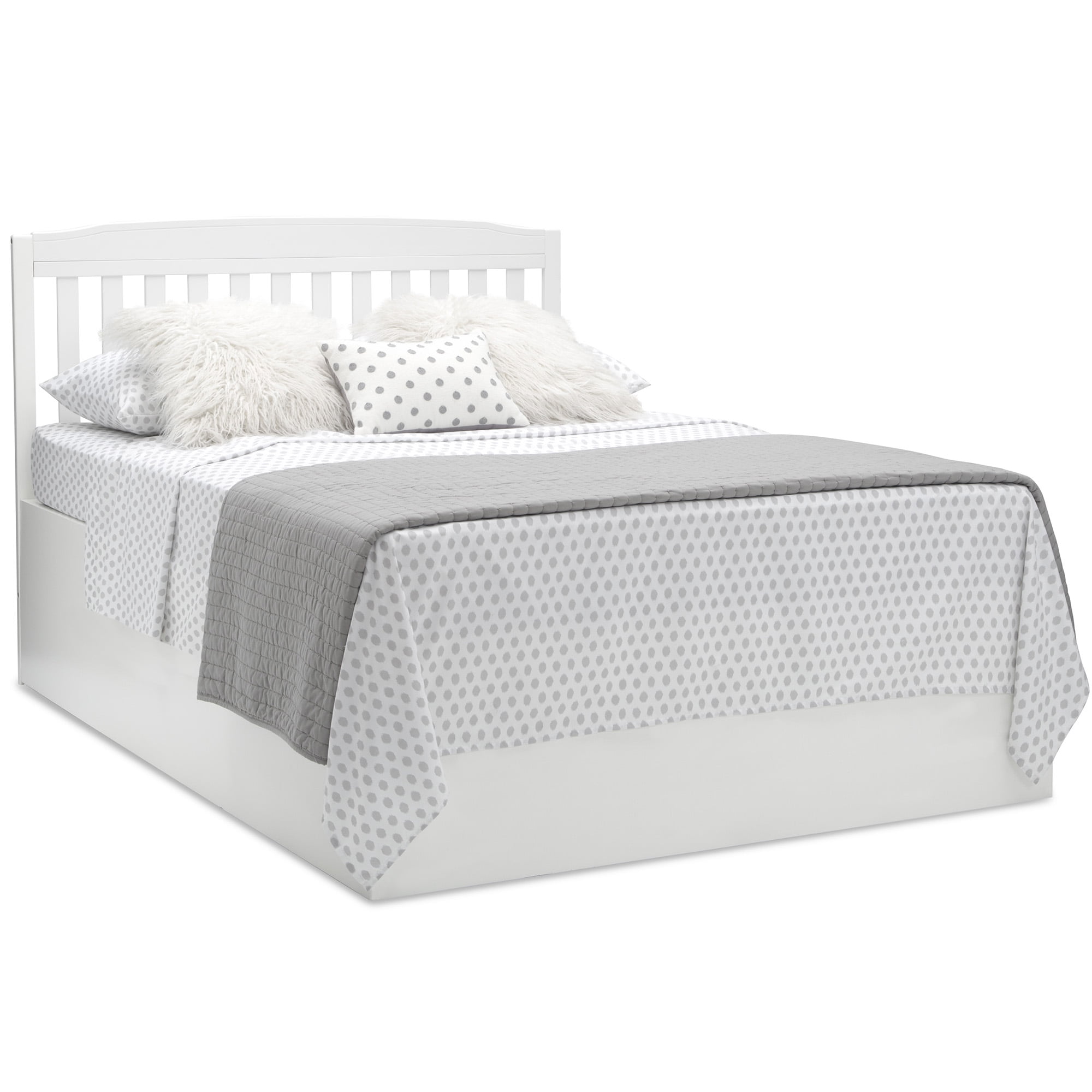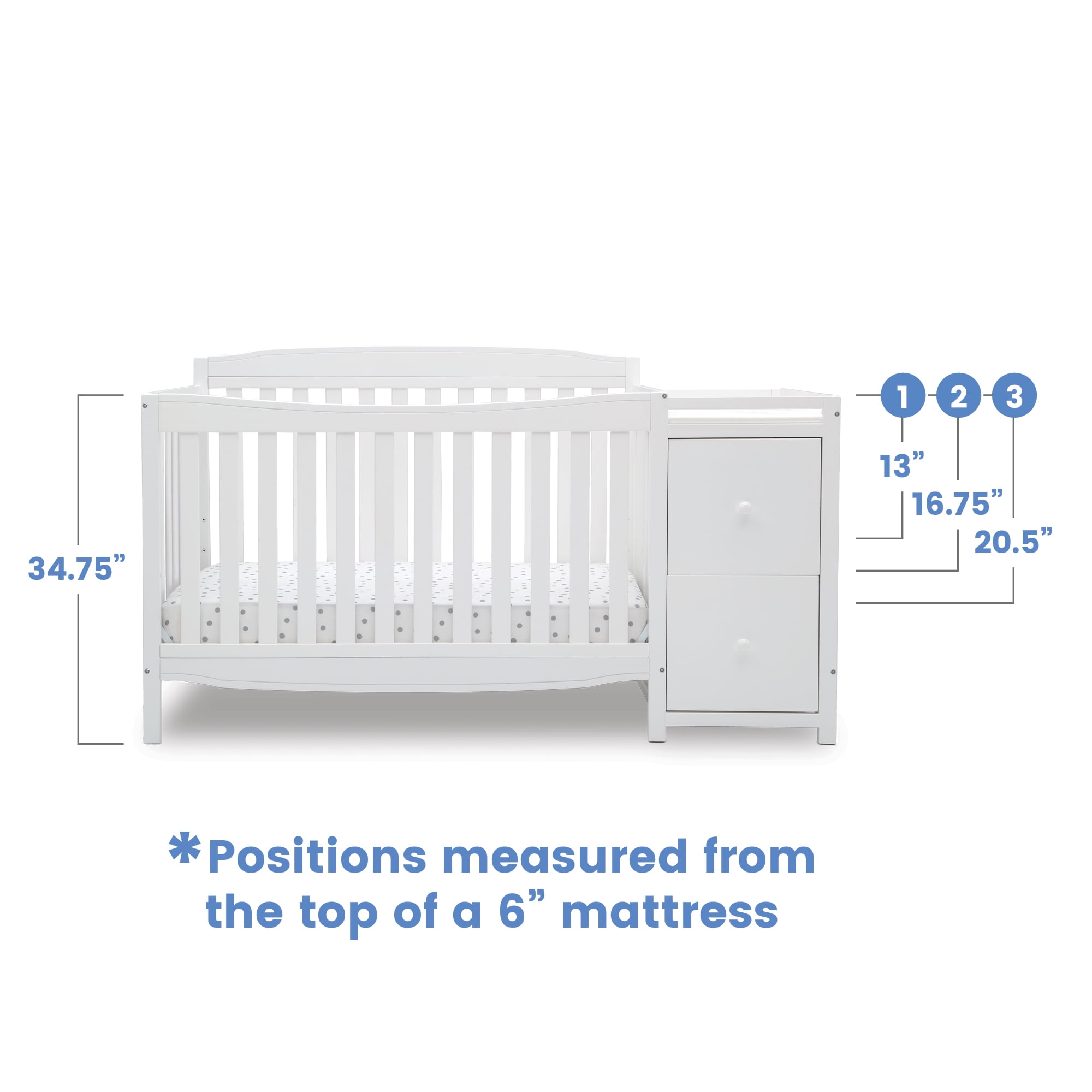 Crib converts to a toddler bed, daybed, sofa, full size bed with headboard and footboard and a full size bed with headboard only (Daybed/Sofa Rail included; Toddler Guardrail #0094, Full Size Bed Rails #0050 or Full Size Metal Bed Frame #0040 sold separately) Available in three popular finishes; Grey, Bianca White and Dark Chocolate Adjustable height mattress support with 3 convenient positions to grow with your baby Uses a standard size crib mattress (sold separately) Assembled Dimensions: 71.25″W x 30.75″D x 40.75″H | Easy to assemble Two Drawers with inside dimensions of 13″W x 13.25″D x 6.5″H JPMA Certified to meet or exceed all safety standards set by the CPSC & ASTM Tested for lead and other toxic elements to meet or exceed government and ASTM safety standards