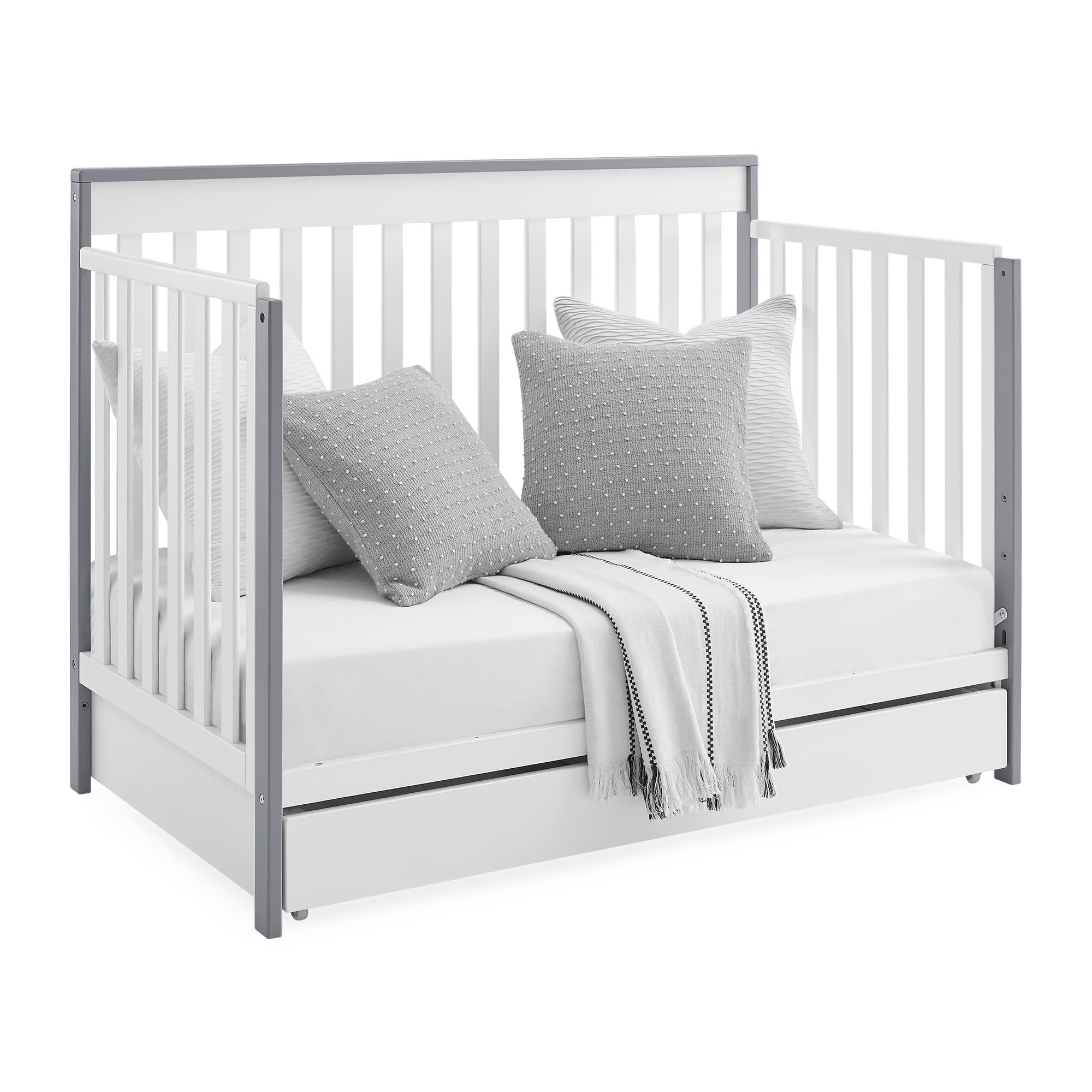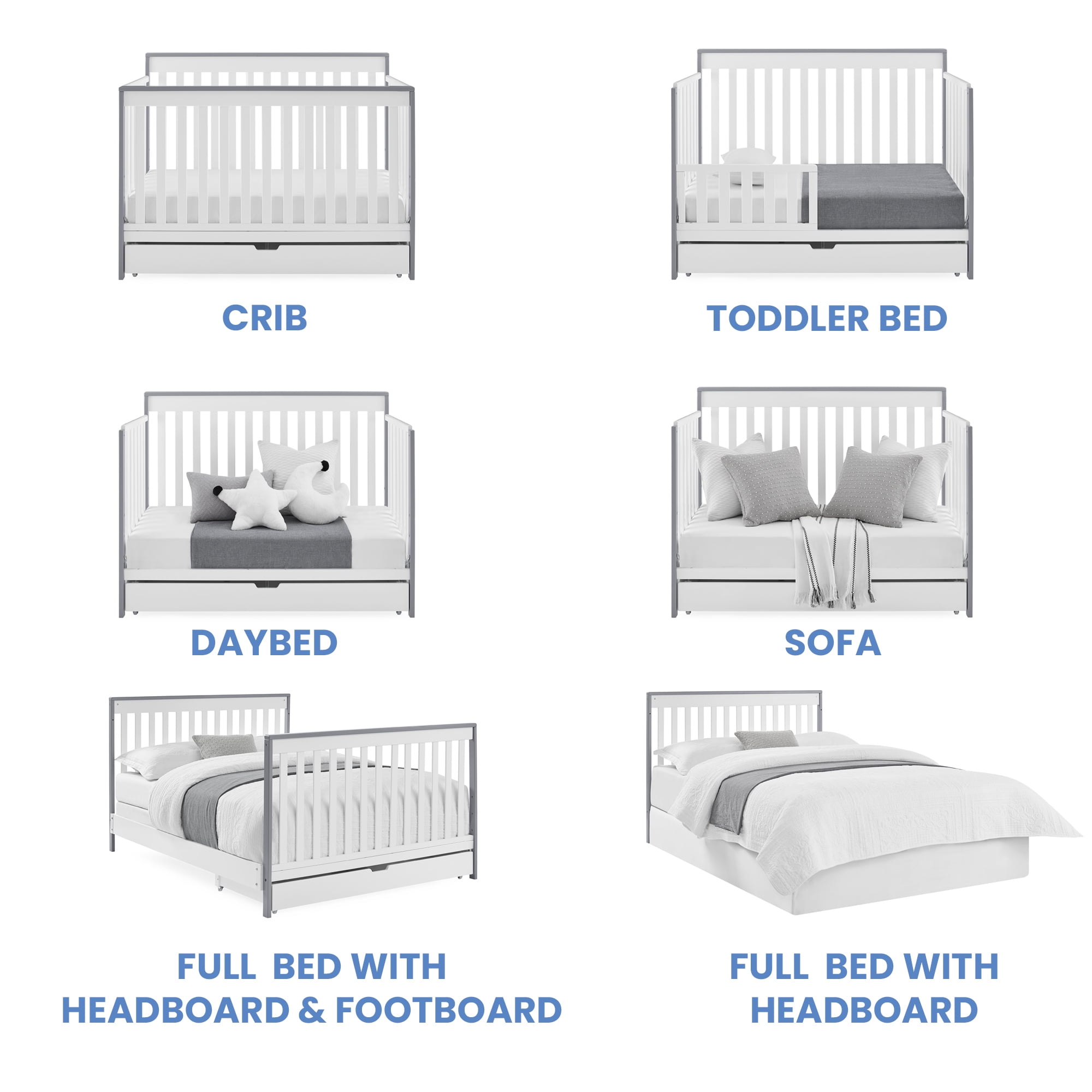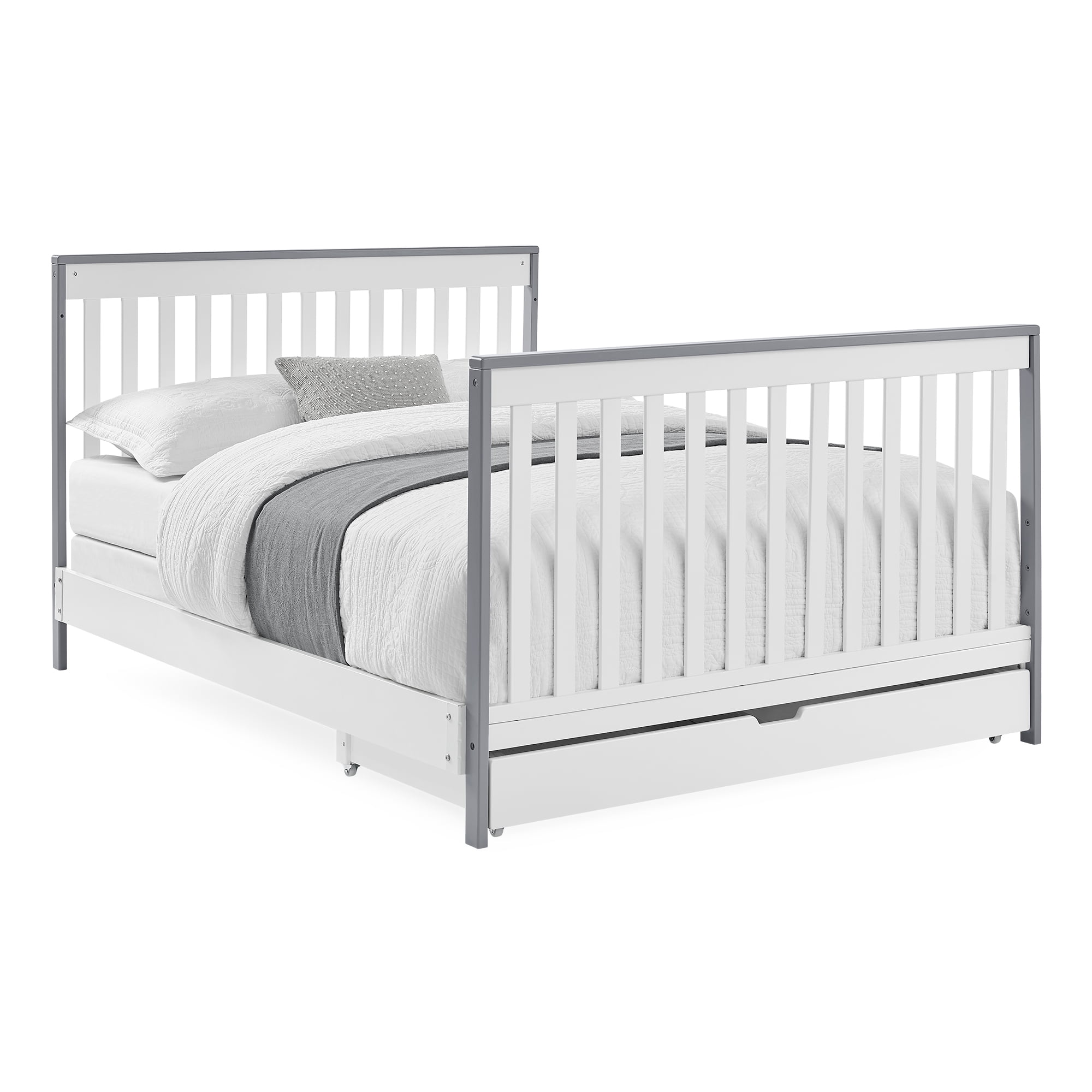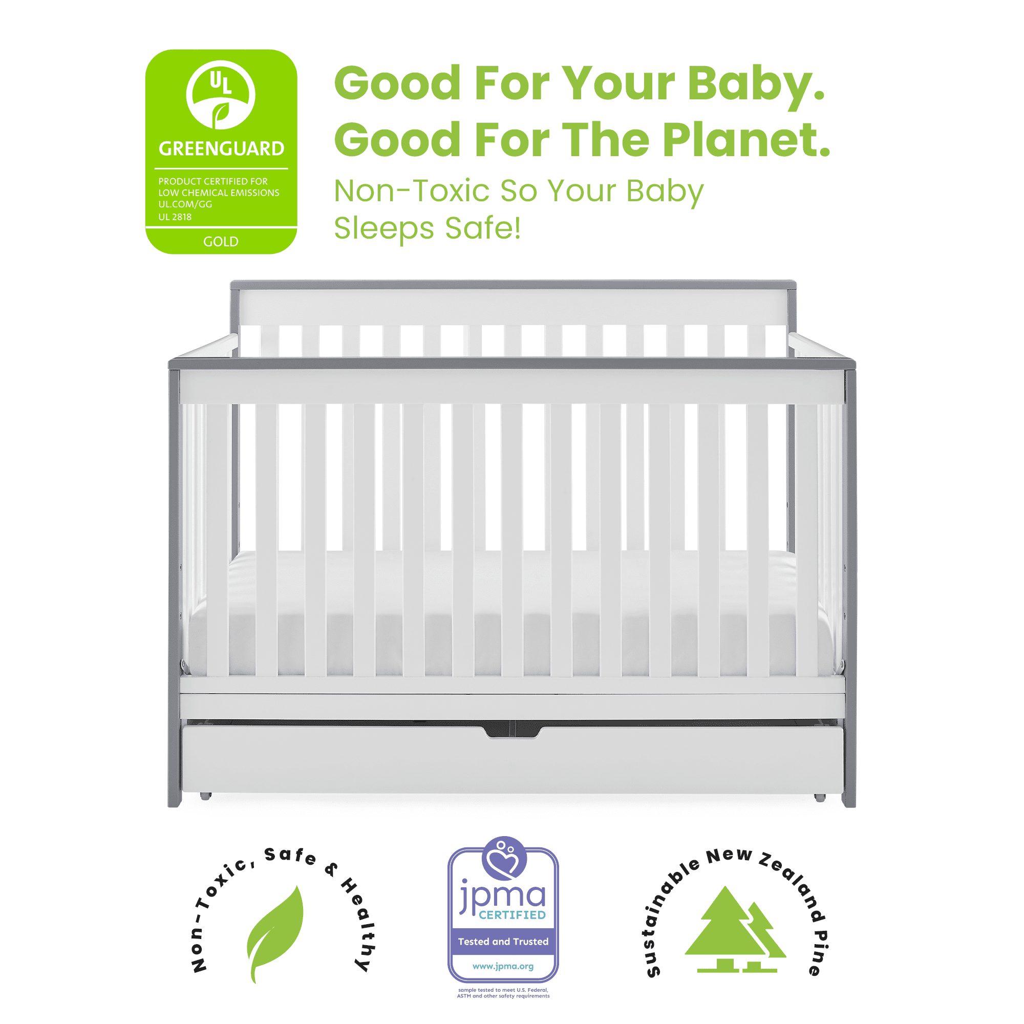 GREENGUARD GOLD CERTIFIED: This crib meets the most stringent chemical emissions standards to create a healthier home for your child. Tested for more than 10,000 chemicals and VOCs, this crib is certified to contribute to cleaner indoor air SAFE OPTION: JPMA certified to meet or exceed all safety standards | Non-toxic multi-step painting process that is lead and phthalate safe | Made of sustainable woods like New Zealand pine, poplar and TSCA compliant engineered wood | Flat sleeping surface 6-IN-1 CRIB: Converts to toddler bed, daybed, sofa, full bed w/ headboard/footboard & full bed w/ headboard only (Daybed Rail included; Toddler Guardrail #0096/Full Size Rails #0050 sold separately) | Included trundle has wheels for easy use MODERN DESIGN: Crib features clean lines and included trundle for a modern and practical nursery | Uses standard size crib mattress (sold separately) | Assembled size: 54″W x 30.50″D x 40″H | Inside Trundle size: 49″W x 23.50″D x 3.5″H ADJUSTABLE HEIGHT: Adjustable height mattress support with 3 positions to grow with your baby | ACCESS RAIL DIMENSIONS: From Floor: 35″; From Top Mattress Support Position: 16.50″; From Bottom Mattress Support Position: 26.50″
