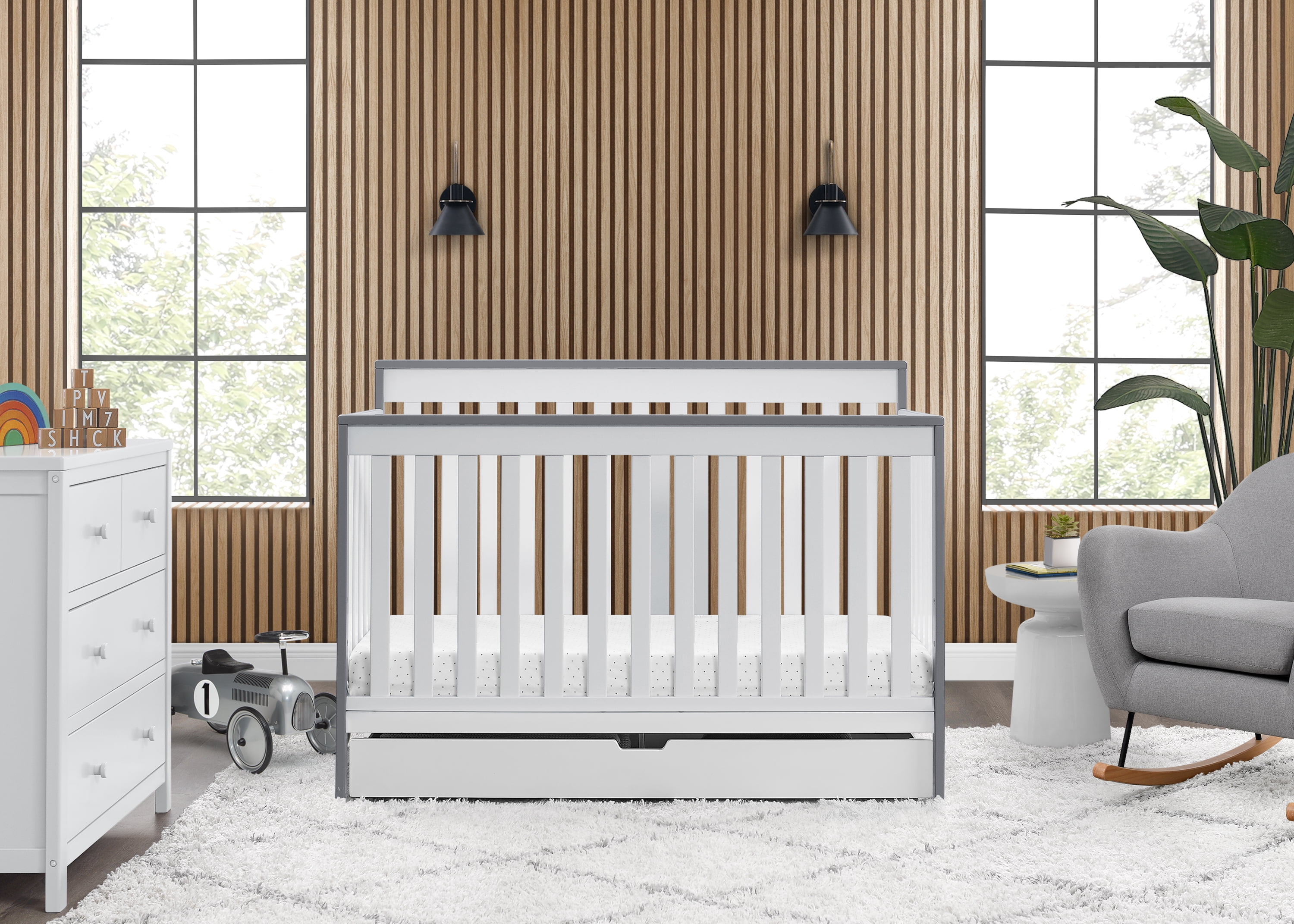 Delta Children Mercer 6-in-1 Convertible Crib with Storage Trundle, Greenguard Gold Certified, Bianca White/Grey