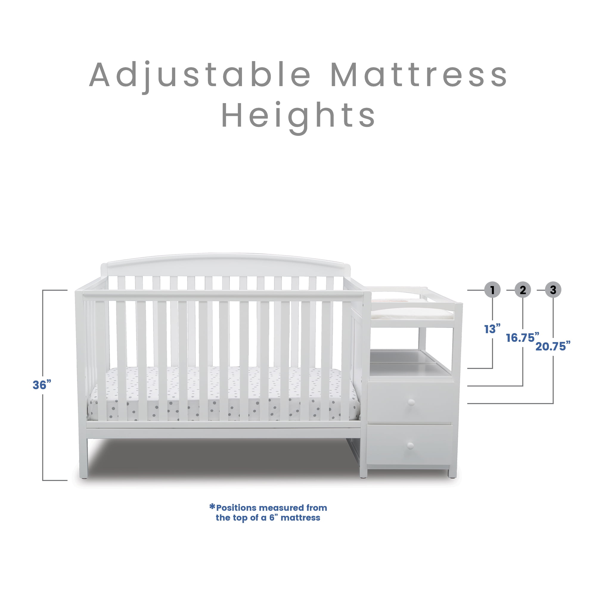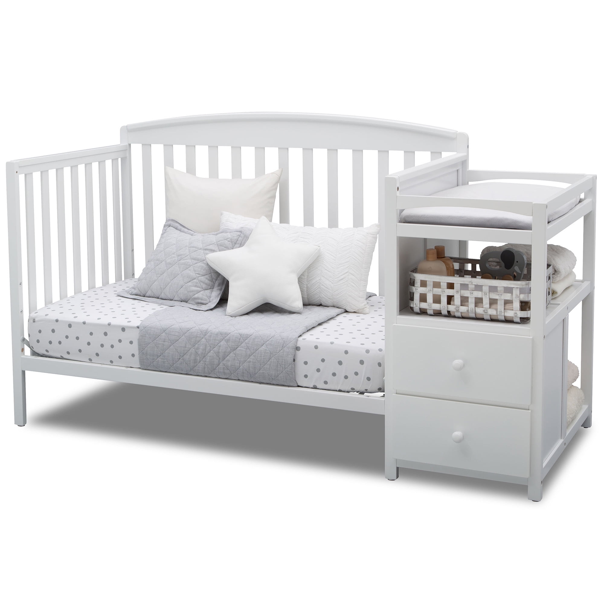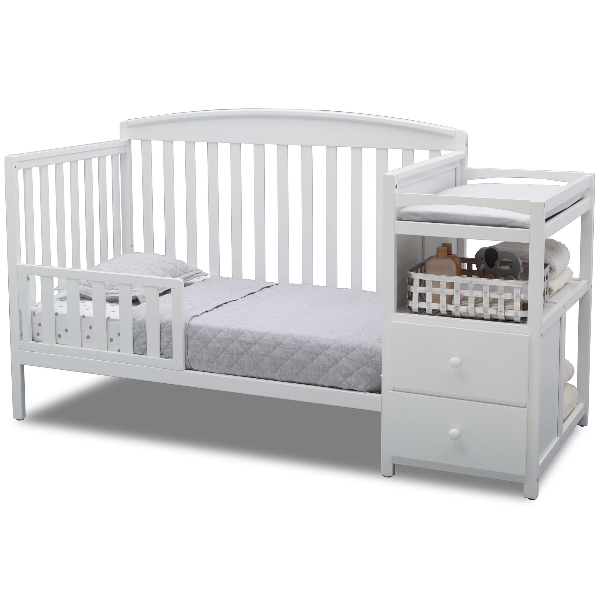 4-IN-1 CONVERTIBLE CRIB: Crib converts to a toddler bed, daybed and full size bed (Daybed Rail is included; Toddler Guardrail #0081 and Full Size Metal Bed Frame #0040 sold separately) | Available in a variety of colors: Dark Chocolate (Brown), White, Warm Honey or Grey GREENGUARD GOLD CERTIFIED: This crib is GREENGUARD Gold certified–tested for more than 10,000 chemicals and VOCs, this color crib is certified to contribute to cleaner indoor air and meets the most stringent chemical emissions standards to create a healthier home for your baby | We know chemicals have no place in your nursery, so we use a non-toxic multi-step painting process that is lead and phthalate safe SAFE OPTION FOR YOUR BABY: This crib is JPMA certified to meet or exceed all safety standards set by the CPSC & ASTM | We know chemicals have no place in your nursery, so we use a non-toxic multi-step painting process that is lead and phthalate safe ADJUSTABLE HEIGHT: Adjustable height mattress support with 3 convenient positions to grow with your baby CONVENIENT CHANGER: The attached changing table features 2 shelves, 2 drawers, and includes a 27.75″x 16″ x 1″ changing pad (safety strap attached) COORDINATING ITEMS: Uses a standard size crib mattress (sold separately) | To ensure the perfect fit pair your crib with a Delta Children, Serta, Beautyrest or Simmons Kids crib mattress QUALITY MATERIAL: Made of sustainable New Zealand pine wood and TSCA compliant engineered wood | Tested for lead and other toxic elements to meet or exceed government and ASTM safety standards SIZE: Assembled dimensions: 72″W x 30″D x 41.25″H