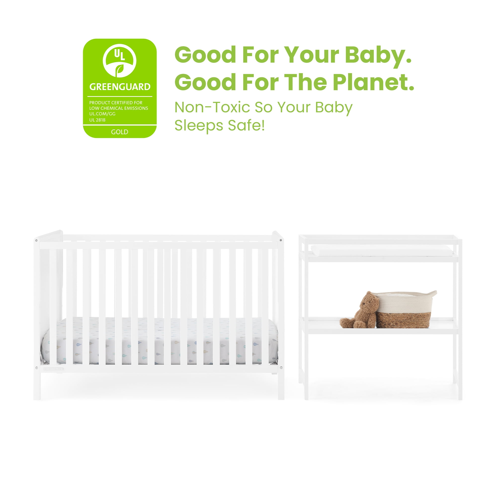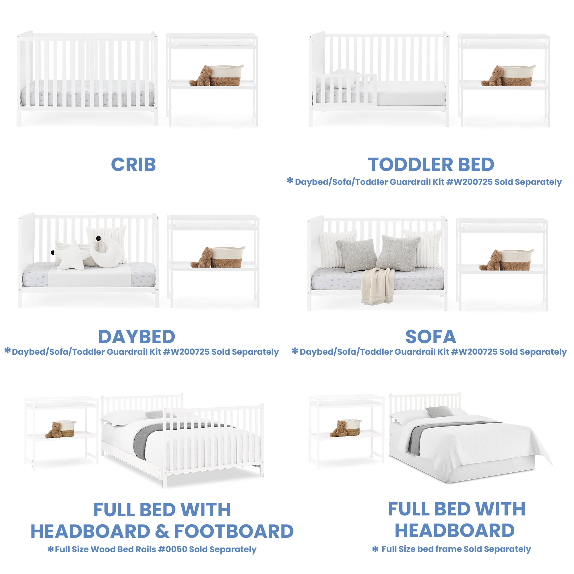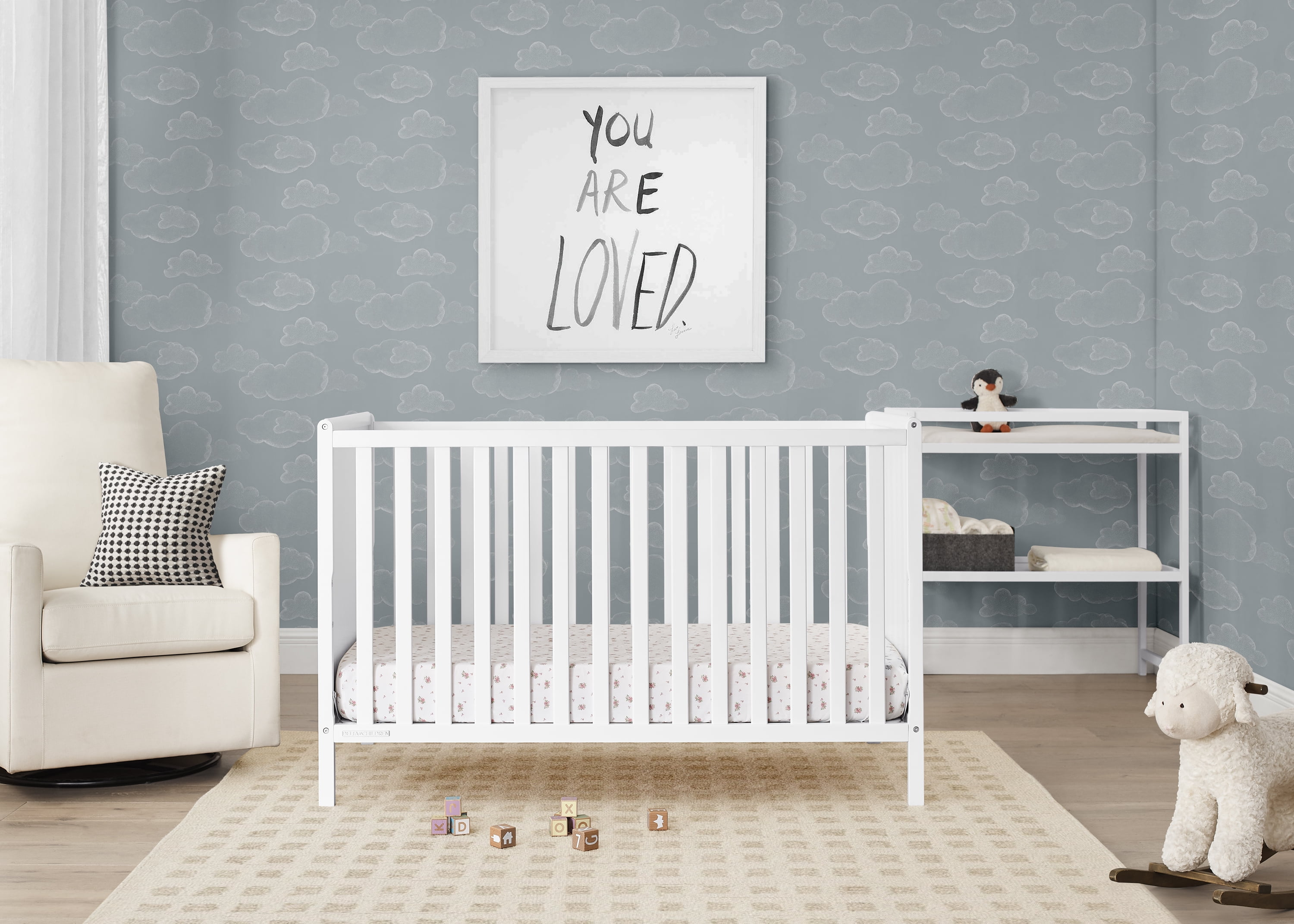 2-PIECE NURSERY SET: This versatile set includes everything you need to create your dream nursery, a convertible baby crib and matching changing table 6-IN-1 CONVERTIBLE CRIB: Crib converts to toddler bed, daybed, sofa, full size bed with headboard & footboard and full size bed with headboard only| Daybed/Sofa/Toddler Guardrail Kit #W200725 sold Separately | Full Size Wood Bed Rails #0050 for headboard & footboard conversion and standard bed frame for headboard only conversion, sold separately | Available in Bianca White GREENGUARD GOLD CERTIFIED: This Convertible Crib and Changing Table meet the most stringent chemical emissions standards to create a healthier home for your child. Tested for more than 10,000 chemicals and VOCs, this 2pc set is certified to contribute to cleaner indoor air SAFE OPTION FOR YOUR BABY: This crib and changing table are JPMA certified to meet or exceed all safety standards set by the CPSC & ASTM | We know chemicals have no place in your nursery, so we use a non-toxic multi-step painting process that is lead and phthalate safe ADJUSTABLE HEIGHT: Adjustable height mattress support with 3 convenient positions on the crib, to grow with your baby | CRIB ACCESS RAIL HEIGHTS: From Floor: 34″; From Top Mattress Support Position: 16.50″; From Bottom Mattress Support Position: 26.50″ COORDINATING ITEMS: Pair this crib with any Delta Children dresser in the same color, to complete a perfect baby nursery | Uses a standard size crib mattress (sold separately) | To ensure the perfect fit pair your crib with a Delta Children, Serta, Beautyrest or Simmons Kids crib mattress | Recommended Changing Pad Size 32.25″W x 16.5″D x 1″H (sold separately)