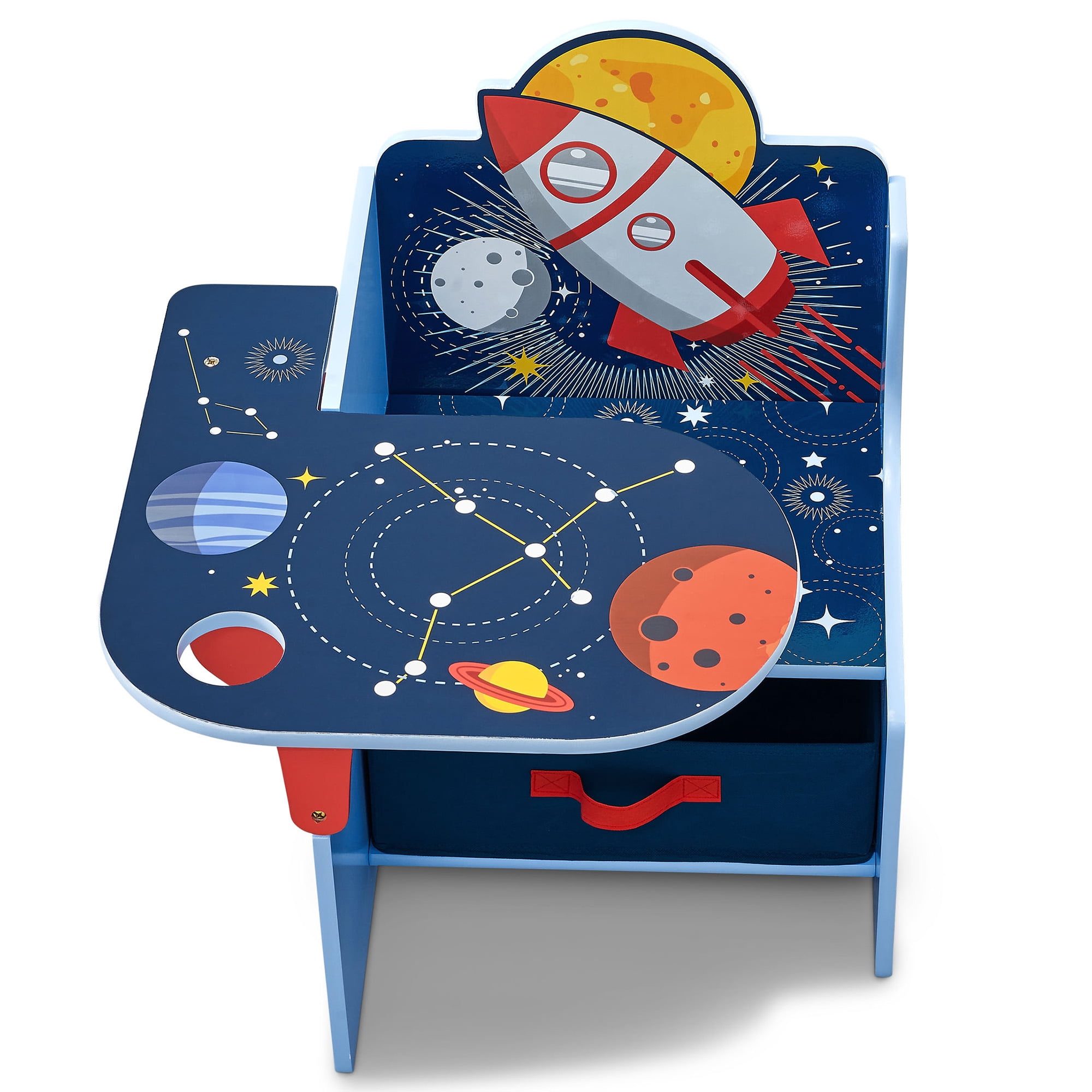 Delta Children Space Adventures Chair Desk with Storage Bin RECOMMENDED USE: Recommended for toddlers 18 months+ Holds up to 50 lbs. COOL OUTER SPACE THEME: This fun chair desk combo features colorful graphics of planets, stars and rocket ships KID-FRIENDLY DESIGN: Sits low to the ground for easy access Ideal for homeschooling and remote learning TONS OF STORAGE: Desk features pull out storage bin under the seat and provides ample space for toys, art supplies and more Built-in cup holder is ideal for art supplies DURABLE CONSTRUCTION: Made of engineered wood and fabric built to withstand years of use Scratch-resistant finish protects the colorful graphics Wipes clean easily with dry cloth Meets or exceeds all safety standards set by the CPSC SIZE: Assembled dimensions: 20.47″L x 22.83″W x 23.23″H