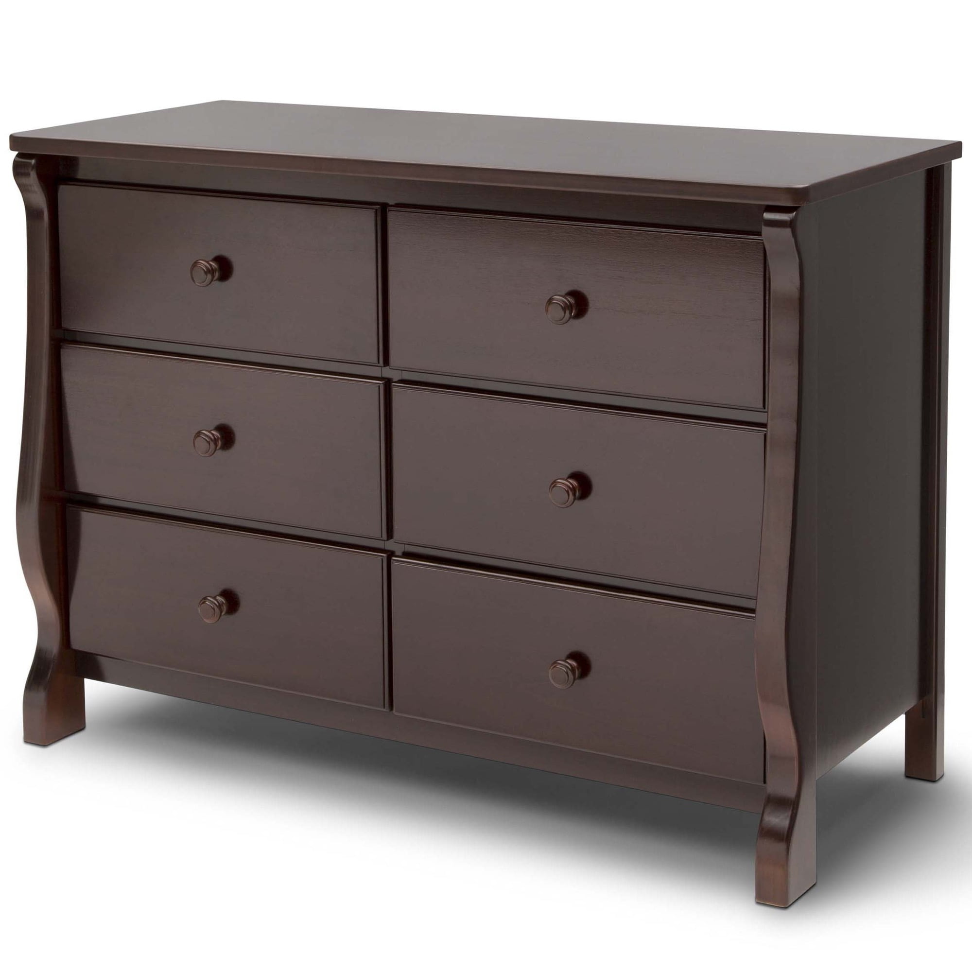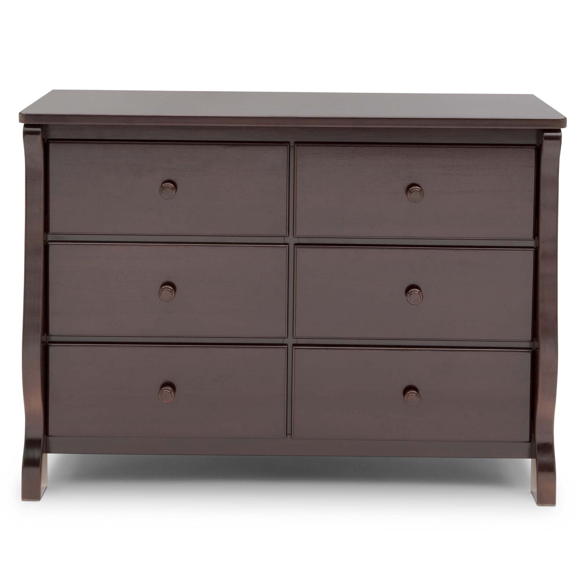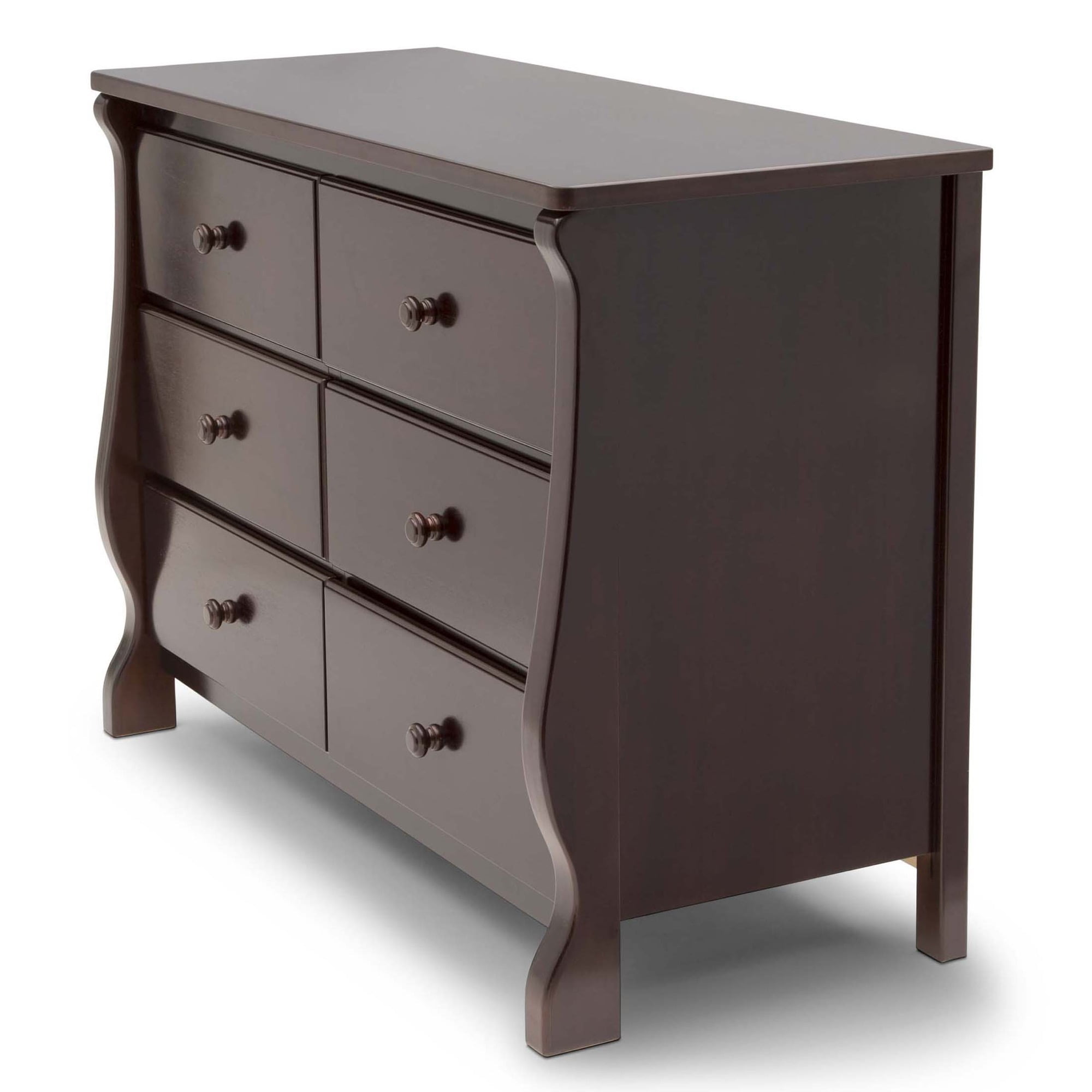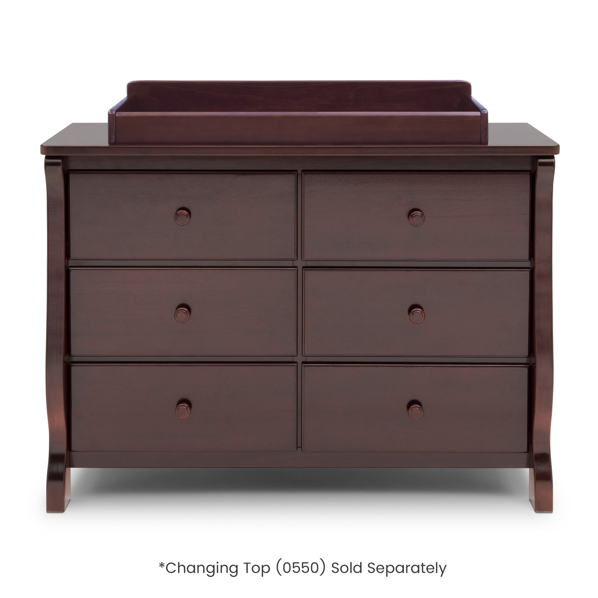 VERSATILE STORAGE: This dresser features 6 drawers for plenty of storage space | To convert your dresser into a convenient changing table purchase the Delta Children #0550 Topper (sold separately) QUALITY MATERIAL: Made of sustainable woods like New Zealand pine and TSCA compliant engineered wood | Tested for lead and other toxic elements to meet or exceed government and ASTM safety standards | Non-toxic paint is lead and phthalate safe SIZE: Assembled dimensions: 47.25”W x20.75”D x 34.75”H | Interior Drawer Size: 18.75”W x 13.5”D x 4.75”H | Easy assembly | Securely attach dresser to wall with included tipover restraint TIMELESS DESIGN: Sleigh style silhouette offers timeless style for your nursery or child’s bedroom