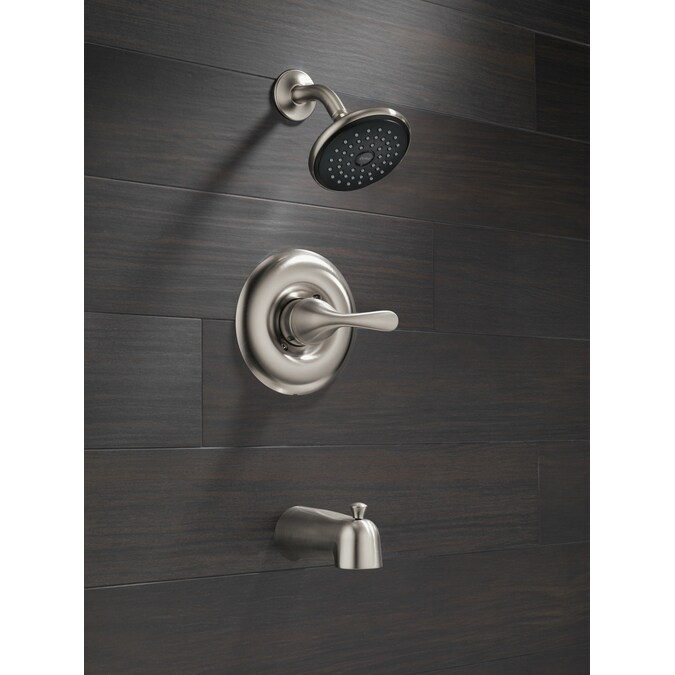 This Delta bathtub and shower faucet set from the Classic collection combines sensible styling with a water-saving function to complement any home. The polished finish of this stainless faucet brightens your bathroom and harmonizes with other stainless fixtures for a coordinated look. This faucet meets WaterSense criteria, so you’re conserving water with each use without compromising the experience. Make adjustments to your water temperature and volume easily with the single-handle lever. The Monitor Scald-Guard valve keeps water temperature within +/-3° F, protecting you and your family from sudden fluctuations while showering. The single-function showerhead leaves you feeling clean with its plentiful water supply. Enjoy the benefits and beautiful luster this faucet set adds to your bathroom.
