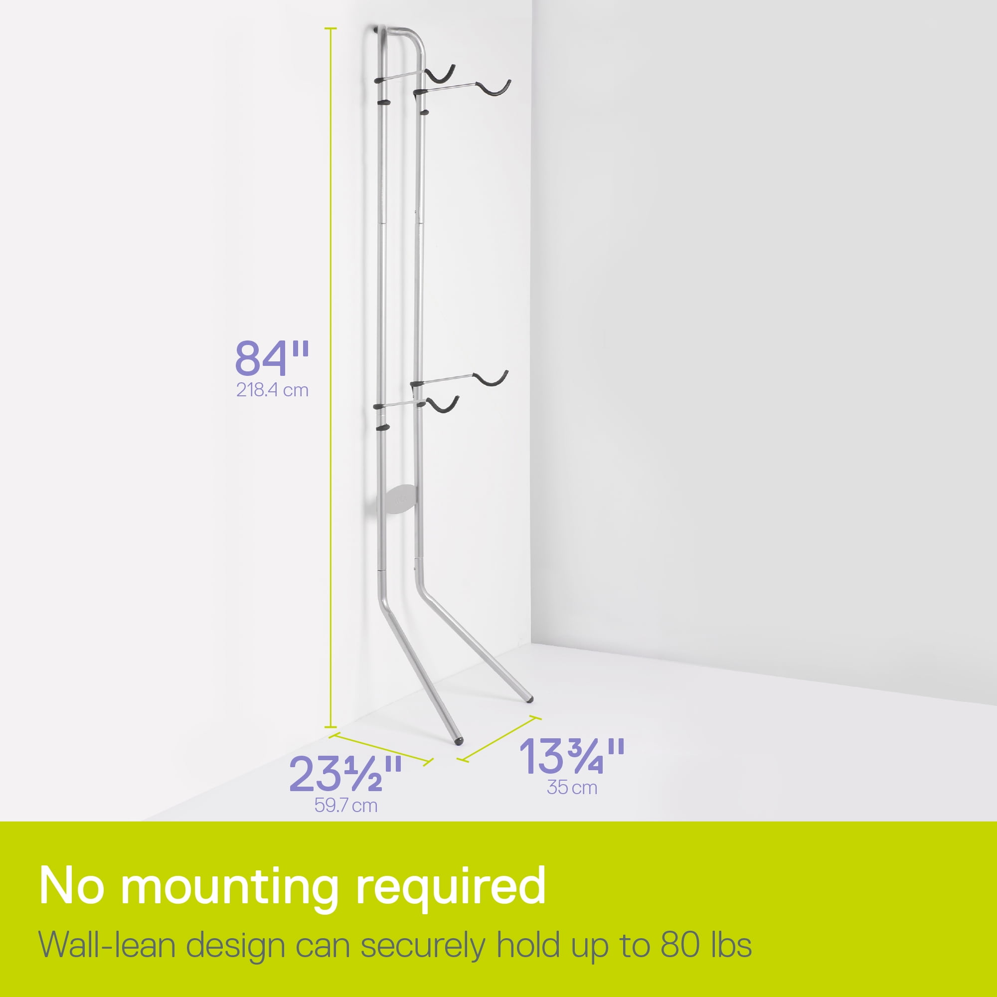 Innovative low-impact bicycles stand for indoor garage design, the Michelangelo 2 bike rack garage simply leans against the wall and uses gravity to secure up to 2 bicycles. Garage bicycles hanger takes minimal effort and expertise to install, all you need is a screwdriver Assembly hardware and a wall strap is included to create a secure wall bike rack in minutes. Arms accommodate any bike size or style, up to 40lbs. Support arms are repositioned with a simple twist, no tools needed, which means this rack is easy to adjust once assembled. This large capacity vertical bike rack securely holds up to 2 bikes and a total weight of 80 lbs. Durable rubber feet keep this standing bike rack securely in place while protecting your floors. Over 200,000 cyclists trust their bikes on Michelangelo bike storage racks. Designed and engineered in the U.S., delta is the brand you can trust with best-in-class U.S. based customer support.