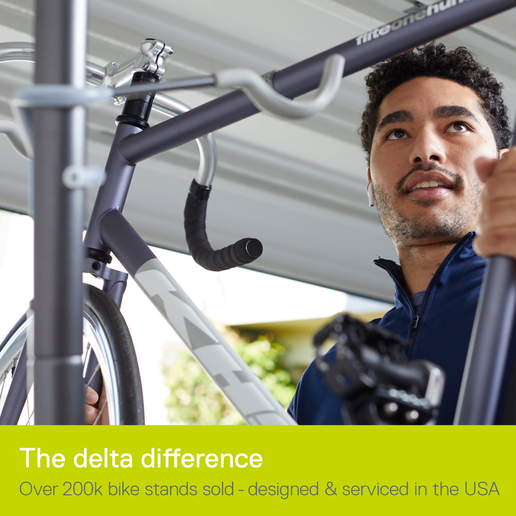 Reclaim Your Floor Space Without Sacrificing Your Walls. Enjoying a hobby, like cycling, should not mean sacrificing floor space to accommodate your gear. With a small footprint and innovative design, Delta Cycle’s Two Bicycles Stand Indoor Bicycles Rack for Garage safely suspends your bicycles and securely holds them within reach for your next ride. The frame is made of tough steel tubing in a minimalist design that keeps the stand from dominating your interior-decorating scheme. Create attractive apartment, in home or garage bike storage. Simply choose the perfect wall and set up your Two Bike Gravity Stand – no permanent drilling or hanging required. Built to accommodate any bike size or style, this bicycle rack supports two bikes up to 80 lbs total. Store and remove your bike in seconds and reclaim your floor space. Easily assembled in minutes with only a screwdriver, delta has designed the perfect bicycles storage garage. The support arms that hold up the bikes on the Michelangelo are movable, allowing the stand to handle bikes with sloping top tubes or complex full-suspension frames. Repositioning the arms is simply a matter of twisting them until they move freely, you’ll need no tools at all, which means that this rack is also easier than all the others to adjust once assembled. The Michelangelo even has a couple of extra hooks for accessories, so you have somewhere other than your handlebars to hang your helmet. As the trusted leader in garage bike storage, delta has sold over 200,000 Michelangelo free standing vertical bicycles mounts. Designed and engineered in the US, your purchase includes best-in-class customer support – your shopping and installation experience our top priority.