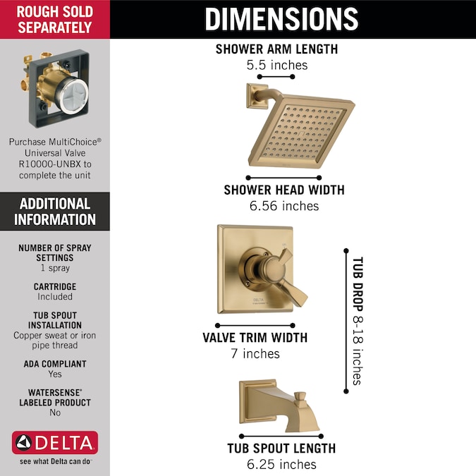 With separate handles for volume and temperature control, this Delta tub/shower provides a more refined showering experience. Simply set the water at your preferred temperature and turn the shower on or off with the volume control handle – without interrupting your set temperature. Designed to look like new for life, Brilliance® finishes are developed using a proprietary process that creates a durable, long-lasting finish that is guaranteed not to corrode, tarnish or discolor. While other products may gather unsightly mineral build-up over time, Delta soft rubber Touch-Clean® spray holes allow any mineral residue to simply be wiped away for an instantly refreshed look – with no need for soaking or the aid of chemical cleaners. Delta® pressure-balance valves use Monitor® Technology to protect you and your family from sudden temperature changes. Take the chill out of contemporary with the eloquent warmth of Champagne Bronze™ in your bath. This vibrant, gold finish provides a vivid splash of contrast to your space for a look that’s simultaneously modern and nimble, able to pair elegantly with traditional, transitional and contemporary décor. Delta WaterSense labeled faucets, showers and toilets use at least 20% less water than the industry standard—saving you money without compromising performance.