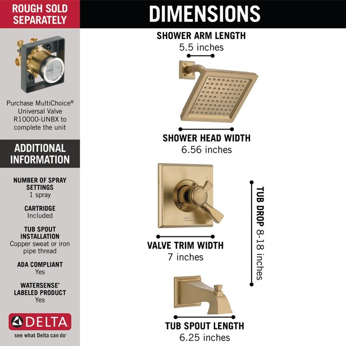 With separate handles for volume and temperature control, this Delta tub/shower provides a more refined showering experience. Simply set the water at your preferred temperature and turn the shower on or off with the volume control handle – without interrupting your set temperature. Designed to look like new for life, Brilliance® finishes are developed using a proprietary process that creates a durable, long-lasting finish that is guaranteed not to corrode, tarnish or discolor. While other products may gather unsightly mineral build-up over time, Delta soft rubber Touch-Clean® spray holes allow any mineral residue to simply be wiped away for an instantly refreshed look – with no need for soaking or the aid of chemical cleaners. Delta® pressure-balance valves use Monitor® Technology to protect you and your family from sudden temperature changes. Take the chill out of contemporary with the eloquent warmth of Champagne Bronze™ in your bath. This vibrant, gold finish provides a vivid splash of contrast to your space for a look that’s simultaneously modern and nimble, able to pair elegantly with traditional, transitional and contemporary décor. Delta WaterSense labeled faucets, showers and toilets use at least 20% less water than the industry standard—saving you money without compromising performance.