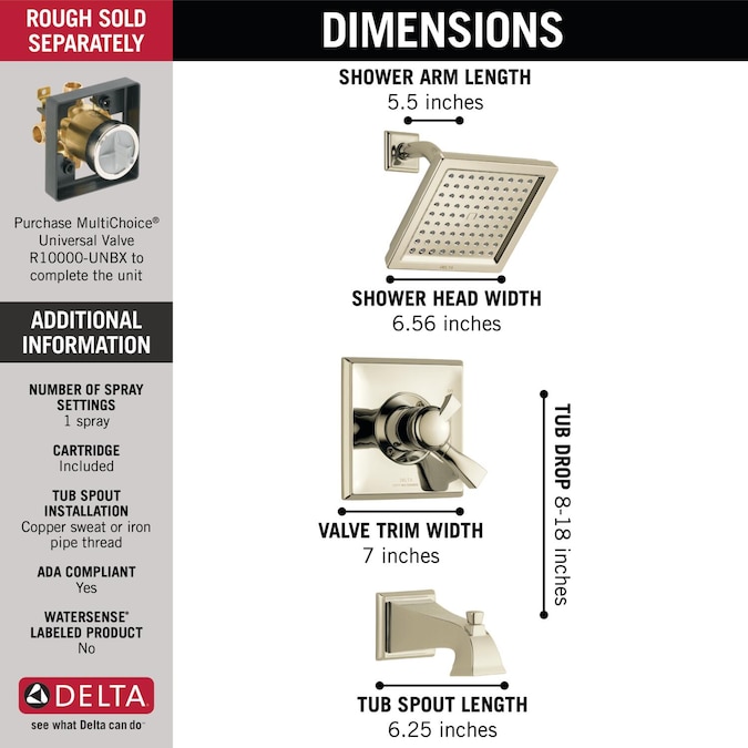 With separate handles for volume and temperature control, this Delta tub/shower provides a more refined showering experience. Simply set the water at your preferred temperature and turn the shower on or off with the volume control handle – without interrupting your set temperature. Designed to look like new for life, Brilliance® finishes are developed using a proprietary process that creates a durable, long-lasting finish that is guaranteed not to corrode, tarnish or discolor. While other products may gather unsightly mineral build-up over time, Delta soft rubber Touch-Clean® spray holes allow any mineral residue to simply be wiped away for an instantly refreshed look – with no need for soaking or the aid of chemical cleaners. Delta® pressure-balance valves use Monitor® Technology to protect you and your family from sudden temperature changes. This glossy finish provides a delicate elegance that can make almost any room pop. The polished surface reflects back deep shadows from your space, creating contrast within the pale gold tones which takes on a new light from every angle. Delta WaterSense labeled faucets, showers and toilets use at least 20% less water than the industry standard—saving you money without compromising performance.