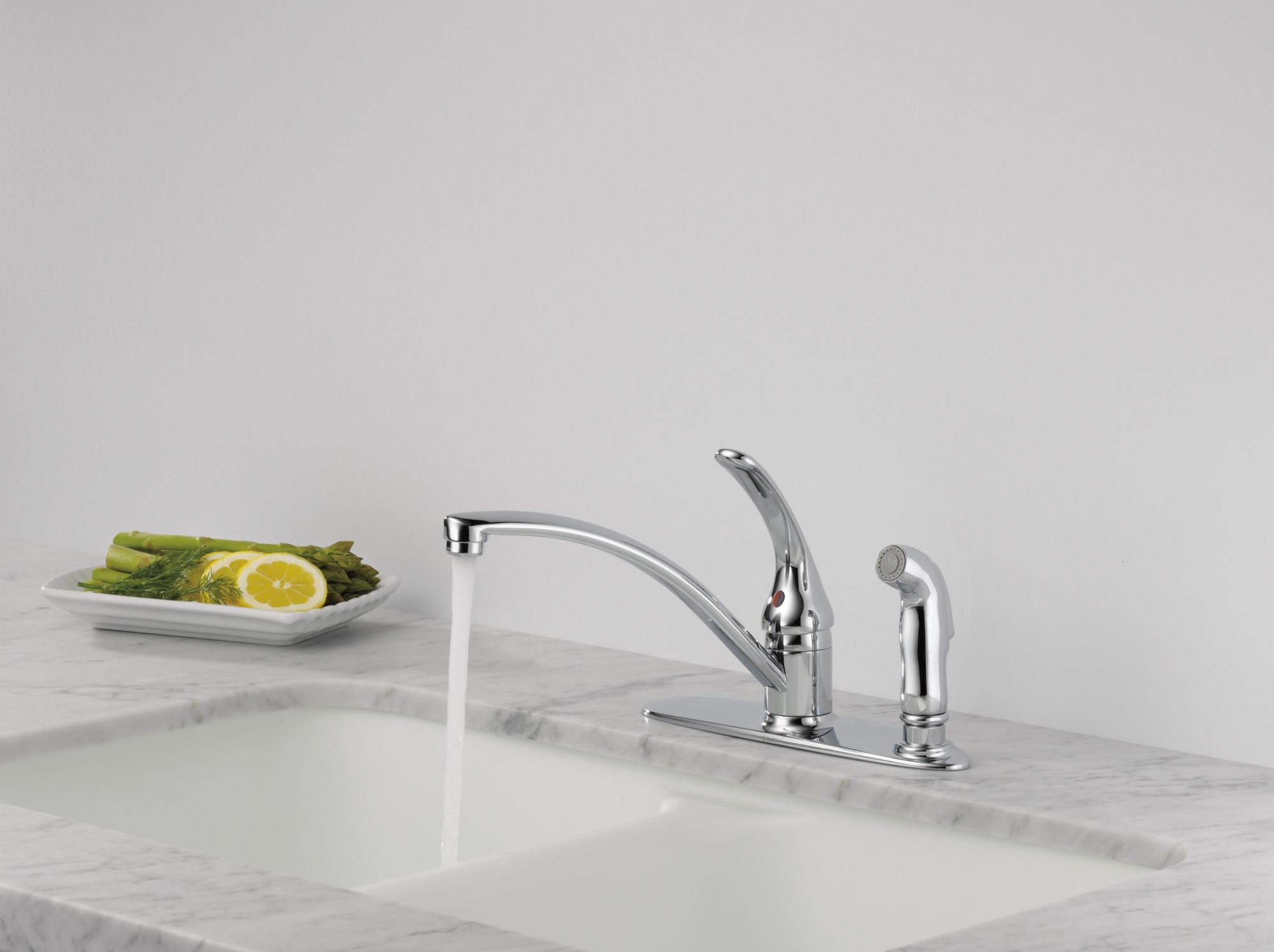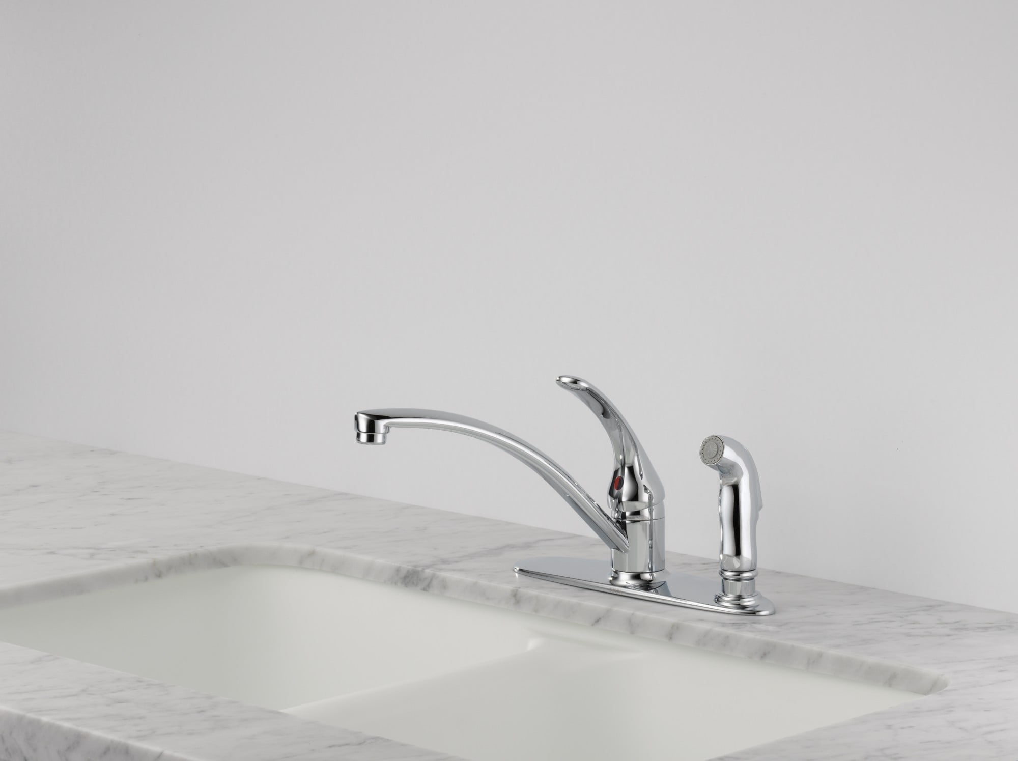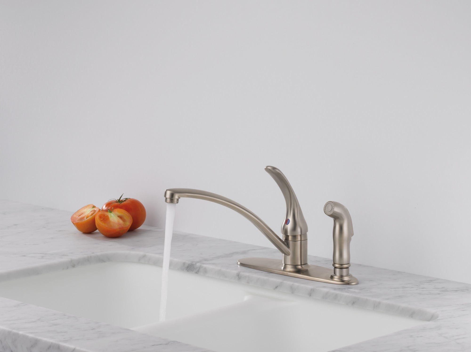 Simple, yet cleanly defined curves make the Foundations Bath and Kitchen Series a well-suited accent to any decor style Our kitchen faucet has a standard spout that can spin 360 degrees and a convenient side sprayer This kitchen sink faucet features a 3-hole, 8″ installation, making it a versatile addition to your kitchen fixtures The single-handle faucet ensures ease of use for all, with an ADA-compliant design that marries functionality with style At Delta Faucet, our goal is to create quality bathroom and kitchen fixtures you can count on
