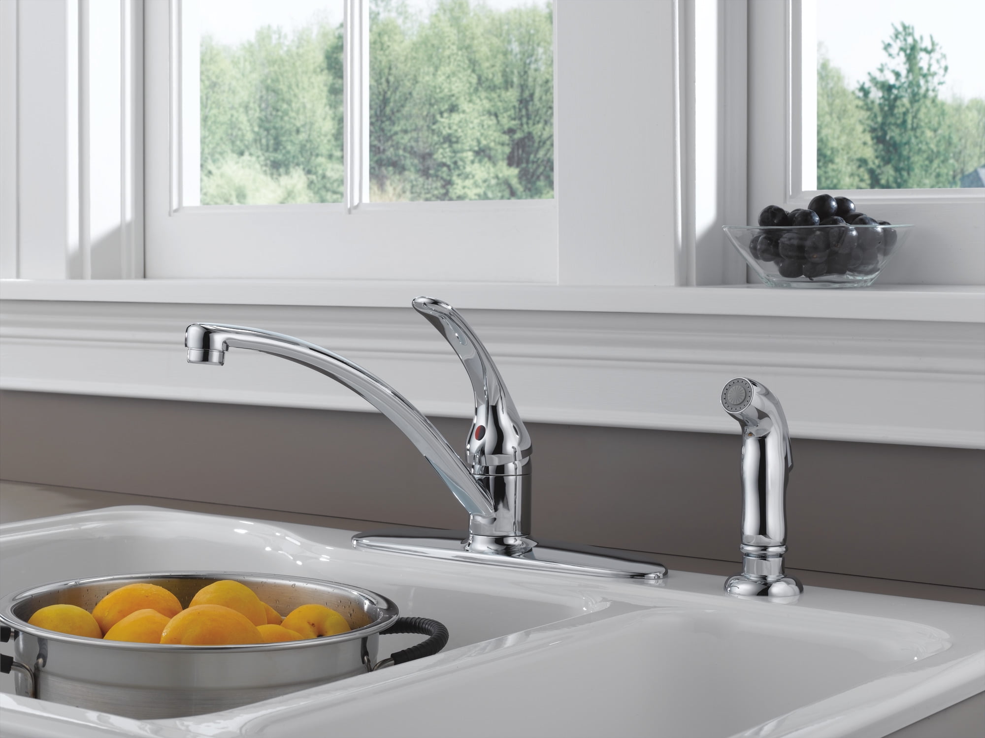 Simple, yet cleanly defined curves make the Foundations Bath and Kitchen Series a well-suited accent to any decor style Our kitchen faucet has a standard spout that can spin 360 degrees and a convenient side sprayer This kitchen sink faucet features a 4-hole, 8″ installation, making it a versatile addition to your kitchen fixtures The single-handle faucet ensures ease of use for all, with an ADA-compliant design that marries functionality with style At Delta Faucet, our goal is to create quality bathroom and kitchen fixtures you can count on