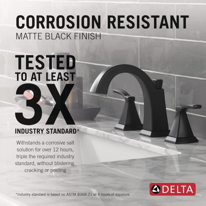 - CORROSION-RESISTANT FINISH: DeltaMatte Black faucet finishes are salt fog tested, meaning they withstand a corrosive, chemical solution for over 12 hours, triple the required industry standard, without blistering, cracking or peeling