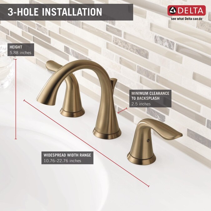 Just like ocean waves, the one-piece curved handles and sleek spout of this Lahara 8-in 2-Handle Bathroom Faucet with Metal Pop-Up in Champagne Bronze make a lasting impression. Delta’s exclusive DIAMOND seal technology uses a valve with a tough diamond coating. InnoFlex PEX waterways keep water inside the faucet out of contact with potential metal contaminants. This powerful combination brings you a faucet built to last up to five million uses. Delta is committed to supporting water conservation around the globe and has been recognized as WaterSense Manufacturer Partner of the Year.