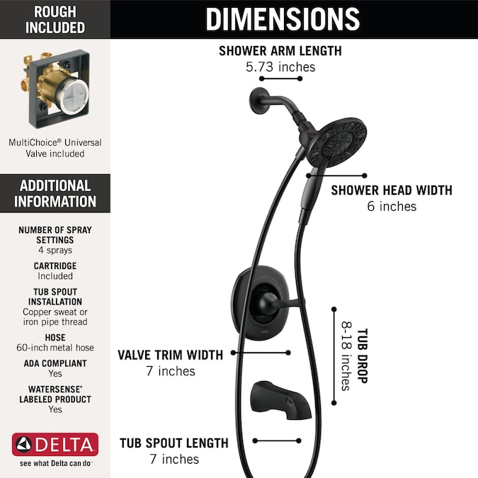 The Delta In2ition Two-in-One Shower features a detachable hand shower which can be used separately from or simultaneously with the shower head. This integrated dual-functionality gives you maximum flexibility without sacrificing warmth, as you can choose to have water streaming from the shower head only, the hand shower only or both the shower head and hand shower at once. While other products may gather unsightly mineral build-up over time, Delta soft rubber Touch-Clean spray holes allow any mineral residue to simply be wiped away for an instantly refreshed look – with no need for soaking or the aid of chemical cleaners. The pause setting gives you ample space for shaving, lathering and other shower tasks, then easily restarts the water with the temperature where you left off. This spray setting helps you conserve water, so you can worry less about depleting your supply of hot water – and you help the environment too. Delta pressure-balance valves use Monitor Technology to protect you and your family from sudden temperature changes. Delta WaterSense labeled faucets, showers and toilets use at least 20% less water than the industry standard—saving you money without compromising performance.